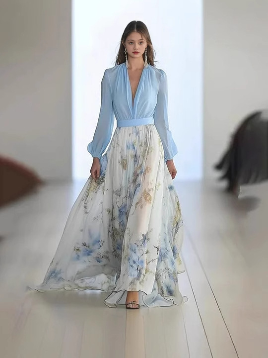 2025 유럽과 미국의 여성 의류 아마존 독립 역 디지털 인쇄 긴 소매 V-목 바느질 긴 원피스 원피스스토어 가기