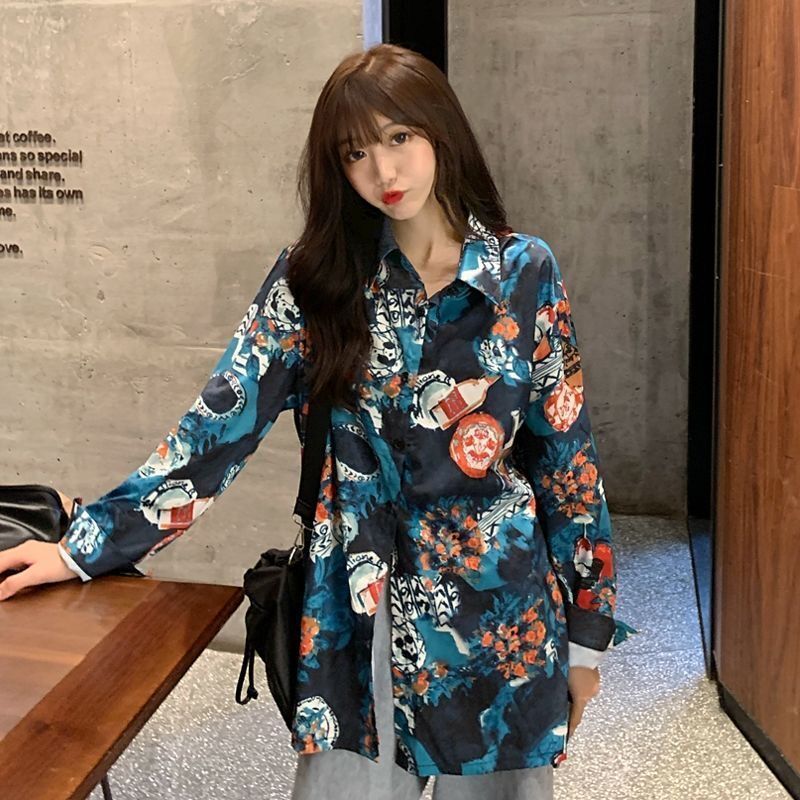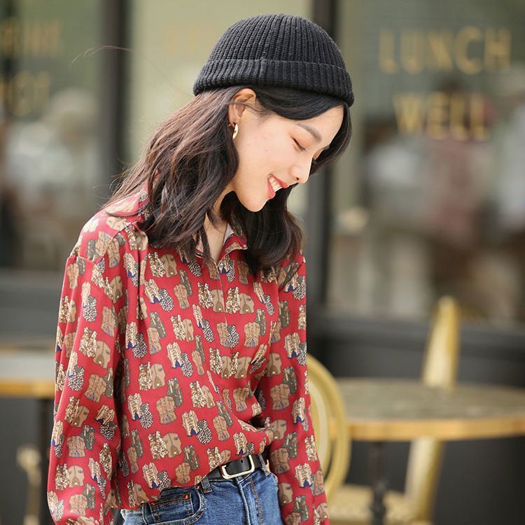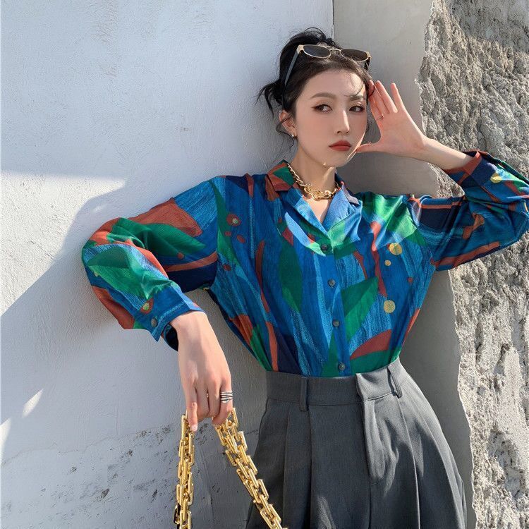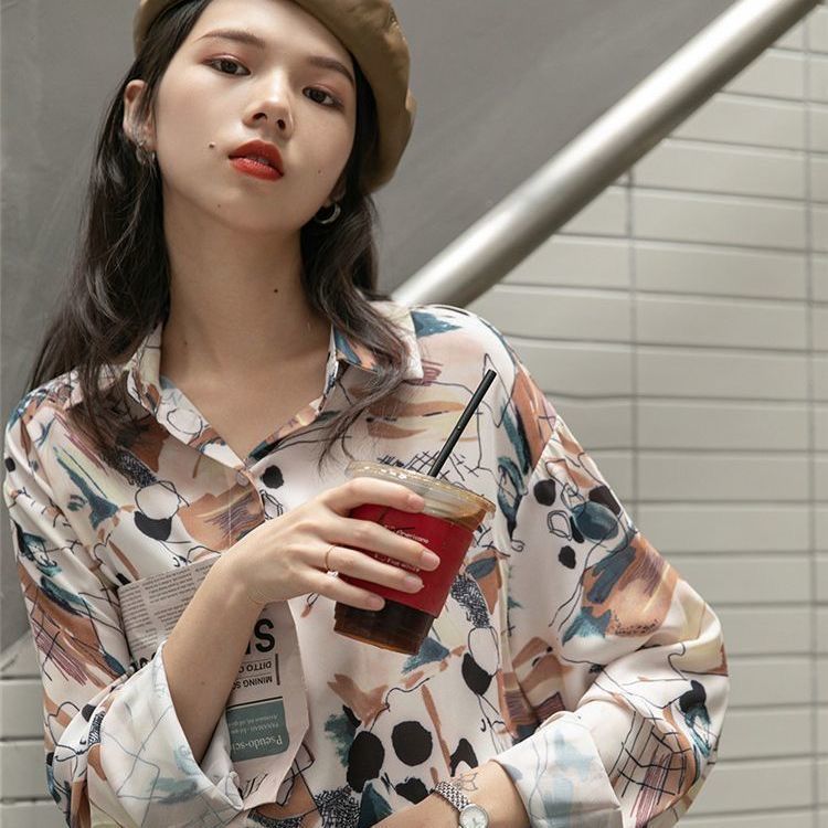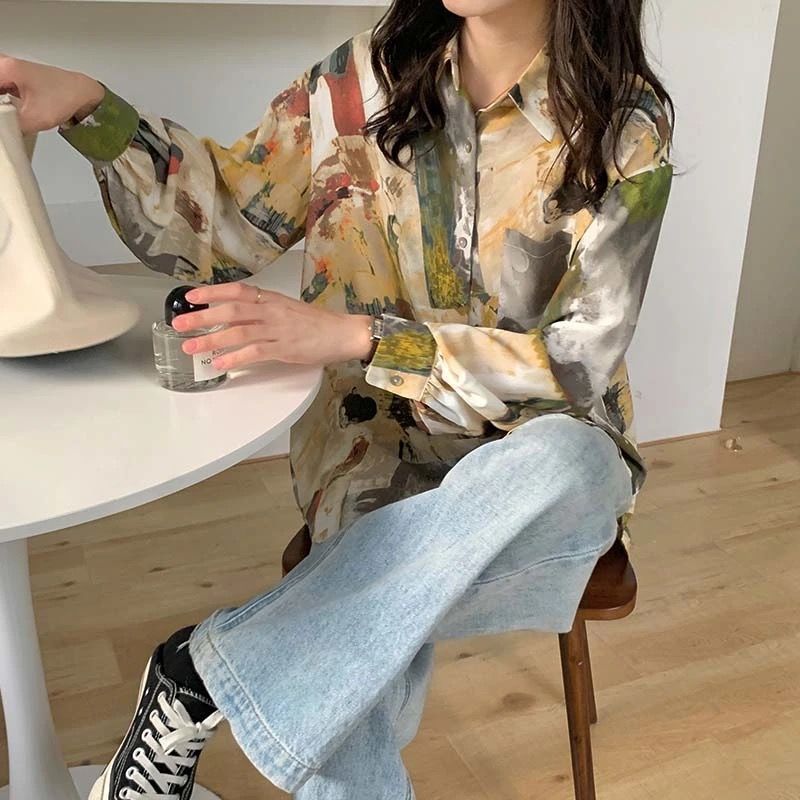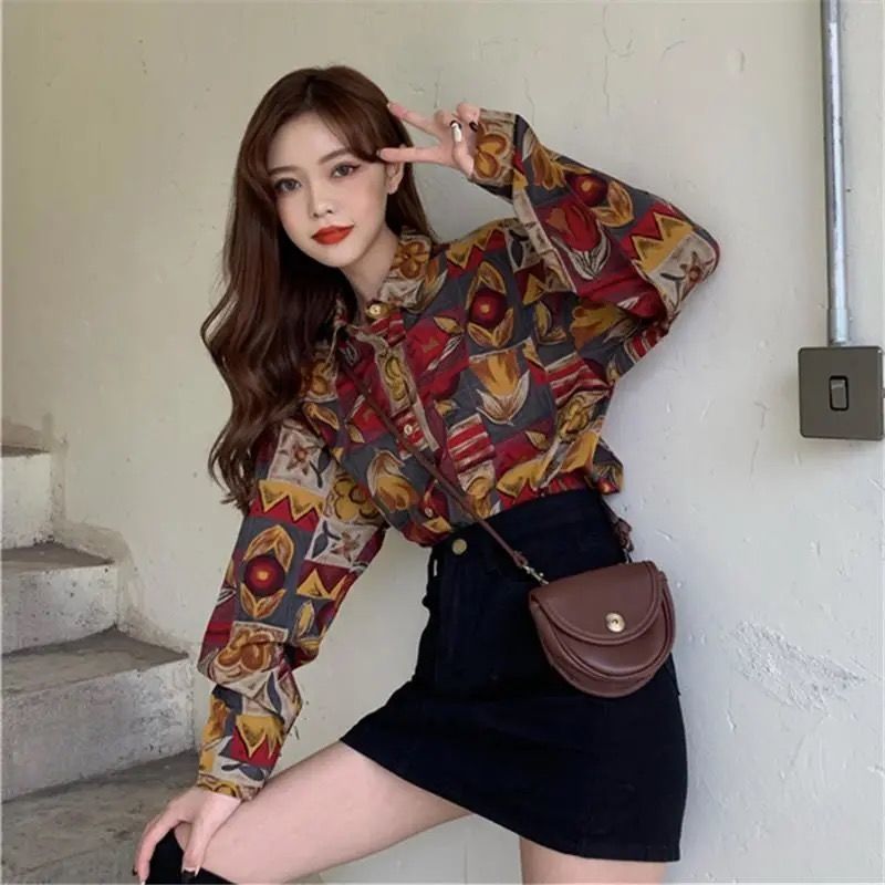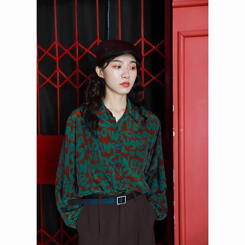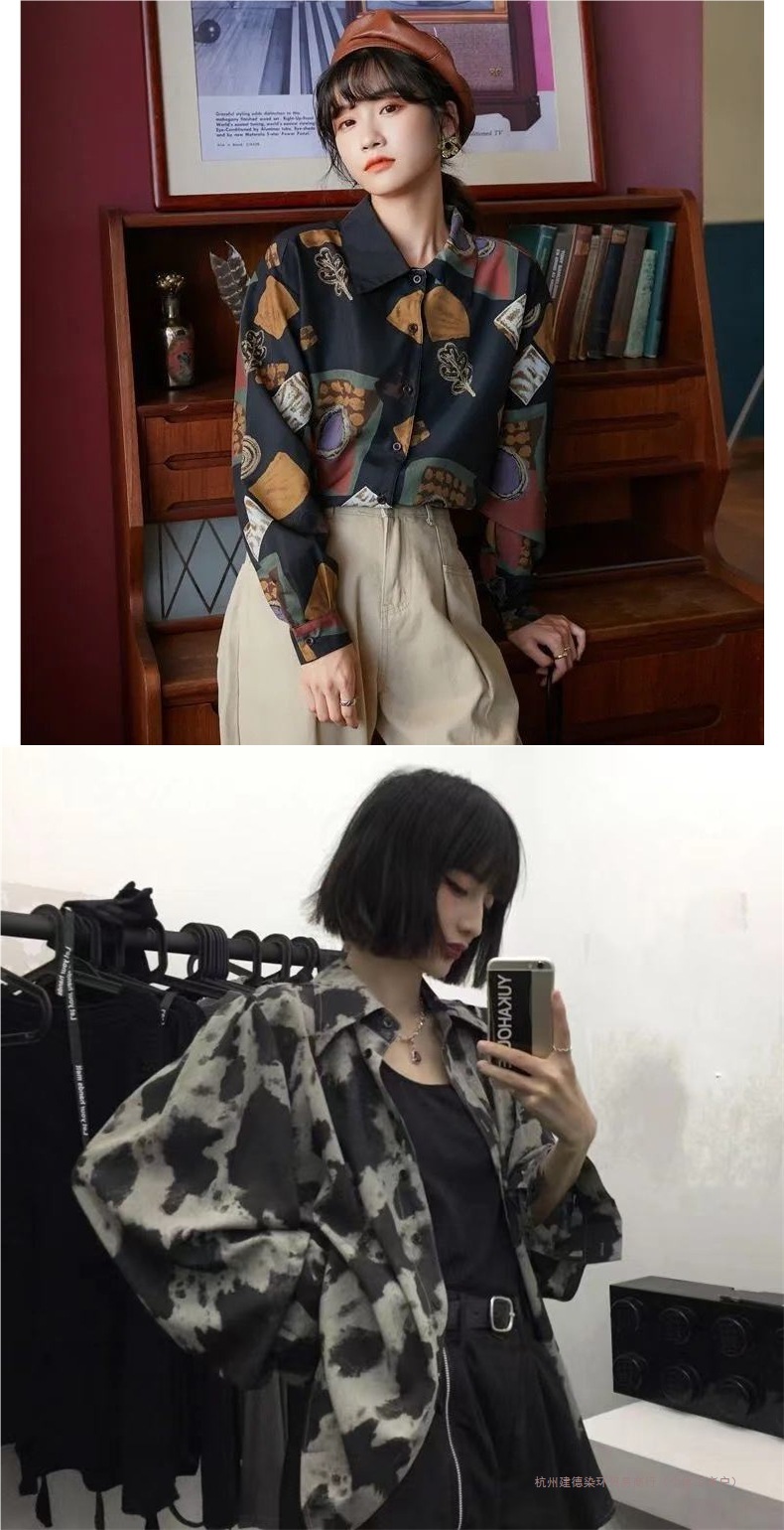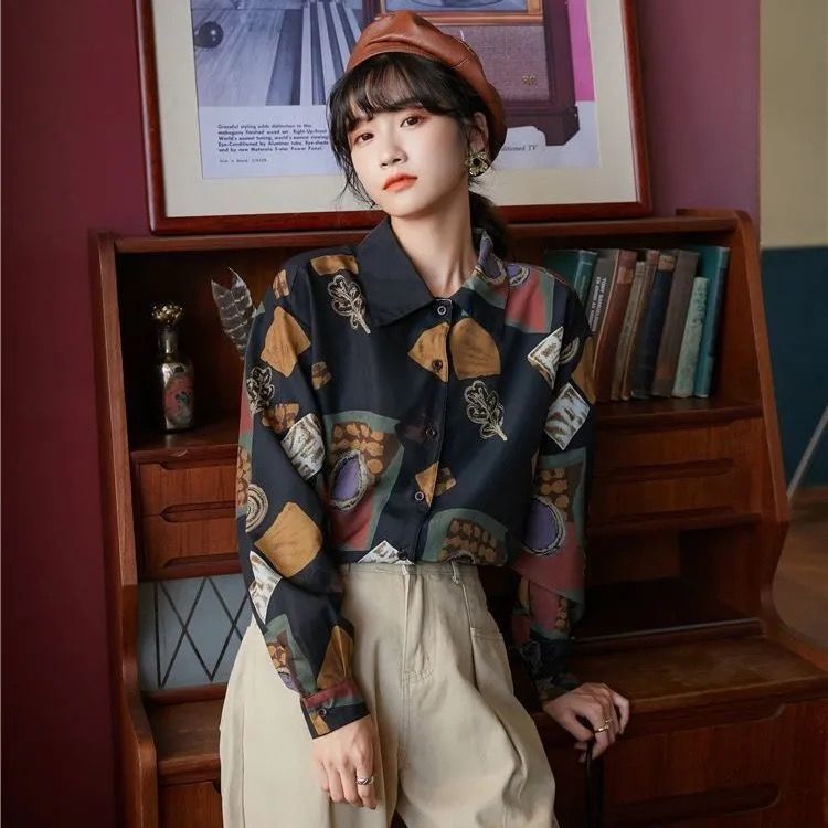 개인화 된 인쇄 ~ 복고풍 기질 틈새 홍콩 스타일 여성용 긴팔 셔츠 봄, 가을 새로운 루즈 캐주얼 라펠 셔츠스토어 가기