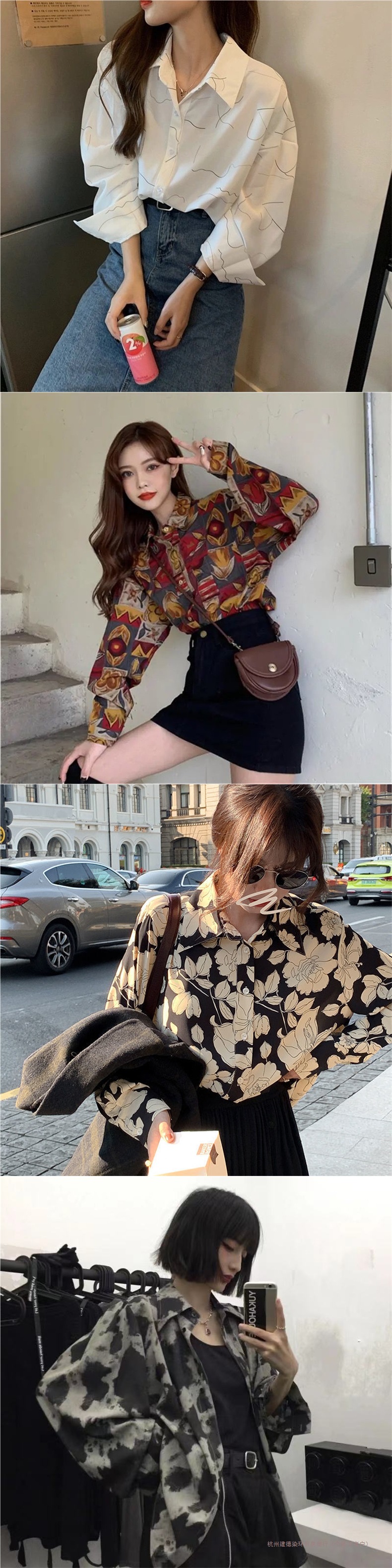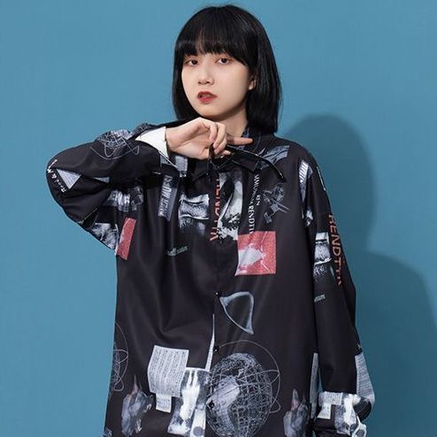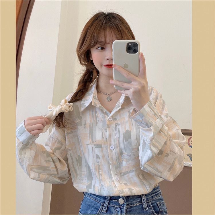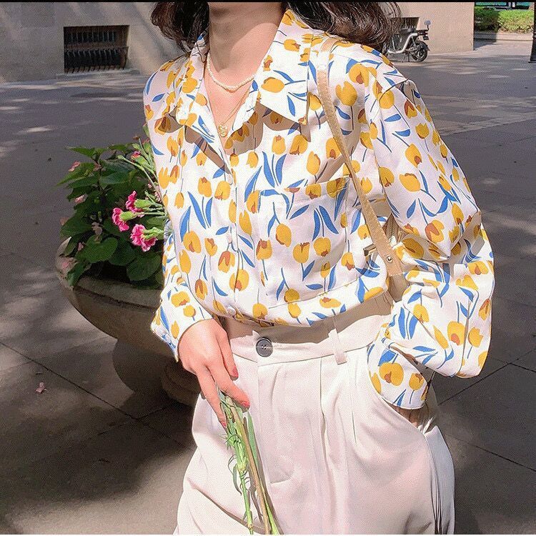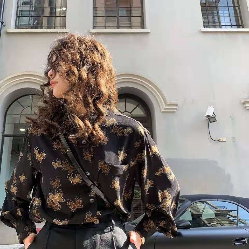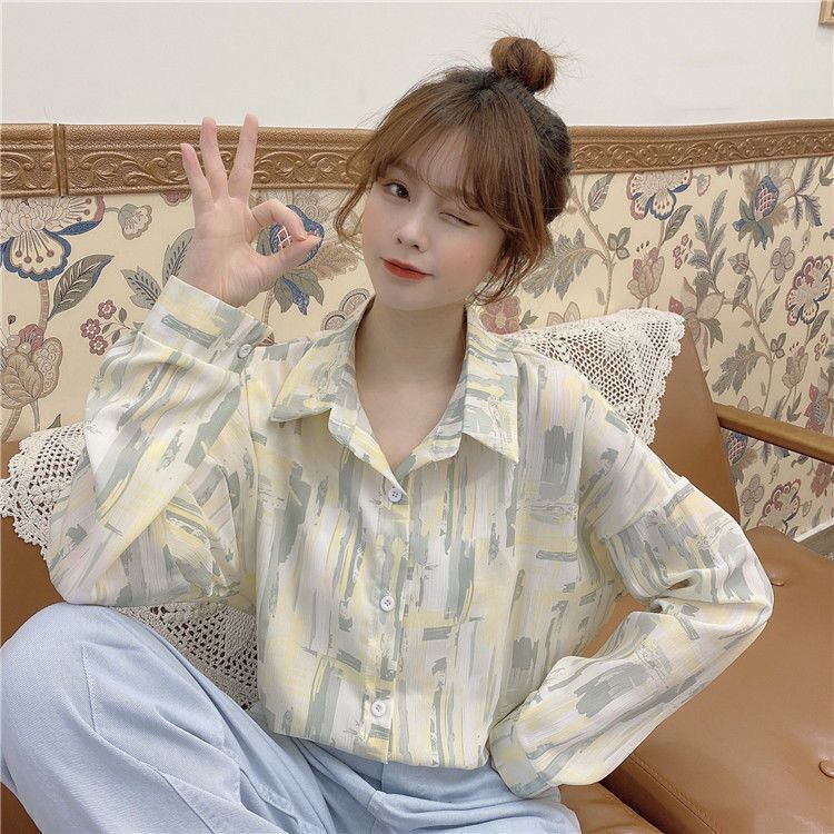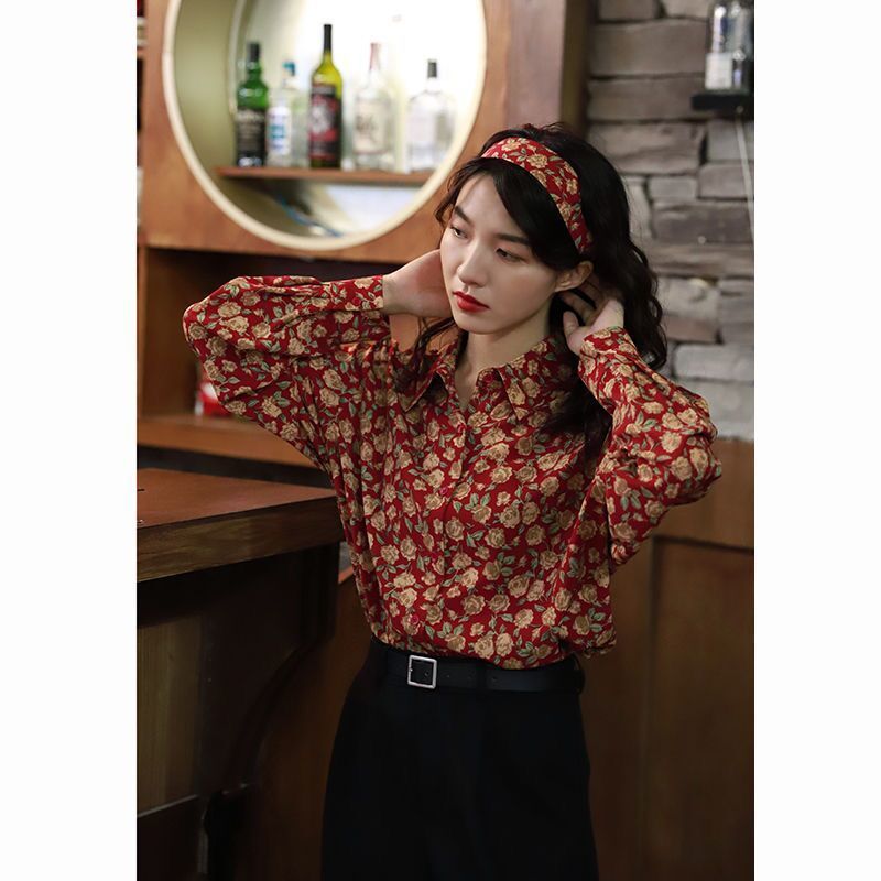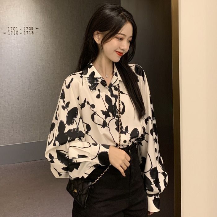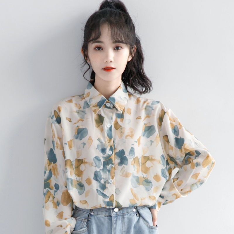개인화 된 인쇄 ~ 복고풍 기질 틈새 홍콩 스타일 여성용 긴팔 셔츠 봄, 가을 새로운 루즈 캐주얼 라펠 셔츠스토어 가기