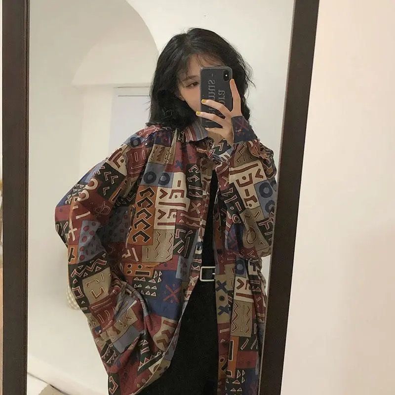 개인화 된 인쇄 ~ 복고풍 기질 틈새 홍콩 스타일 여성용 긴팔 셔츠 봄, 가을 새로운 루즈 캐주얼 라펠 셔츠