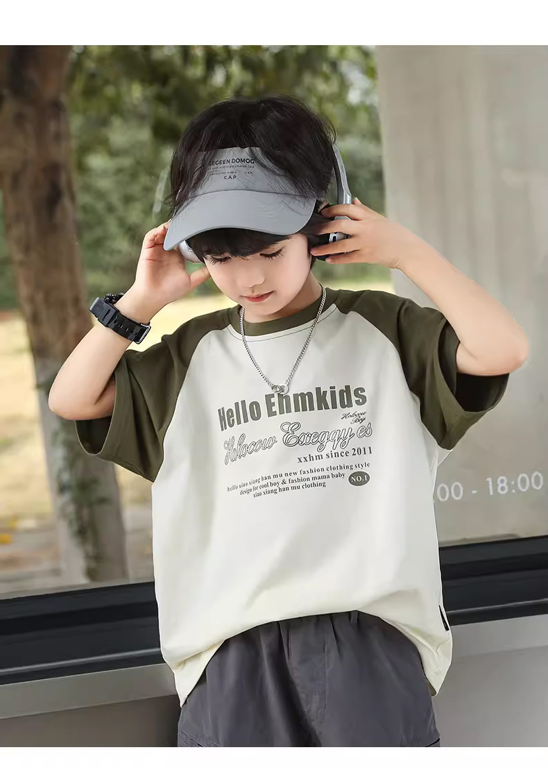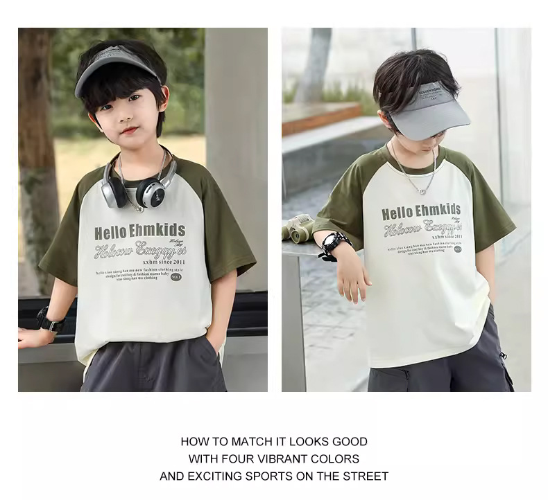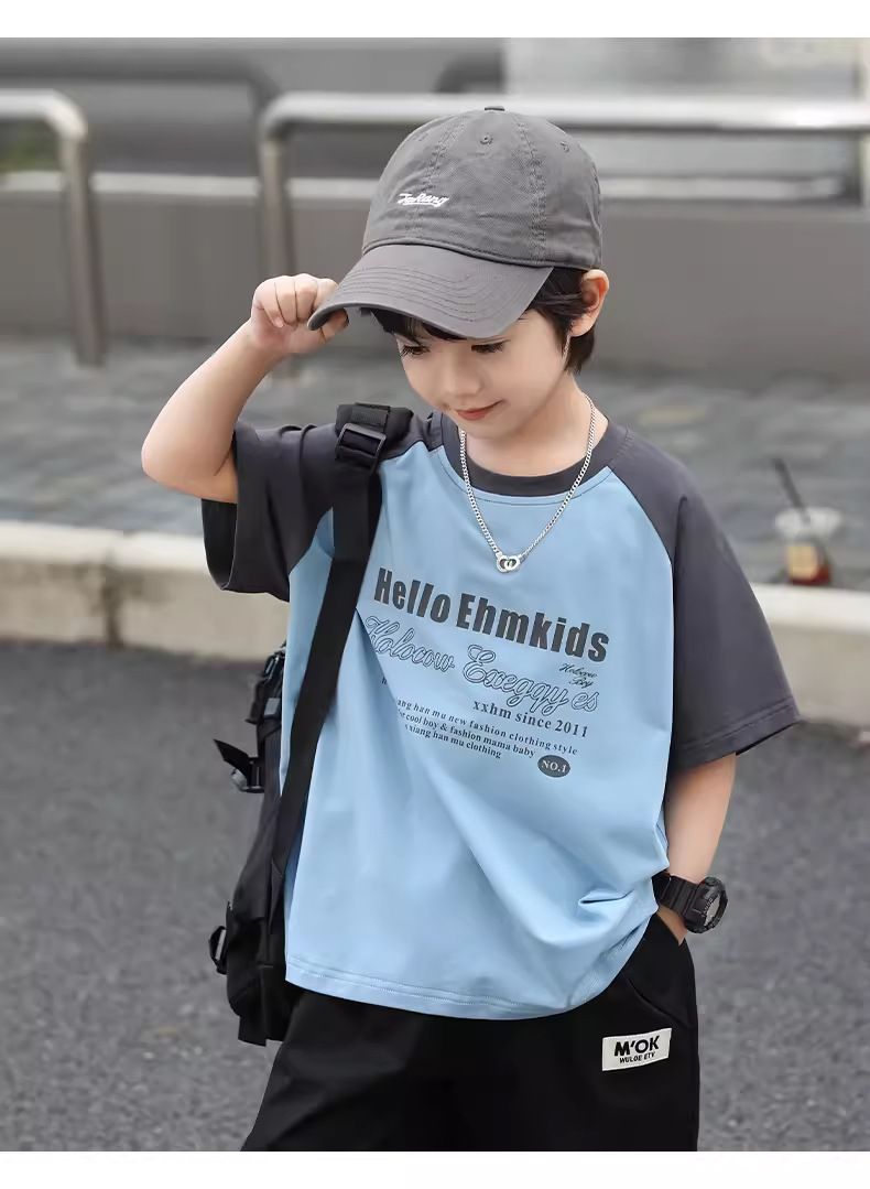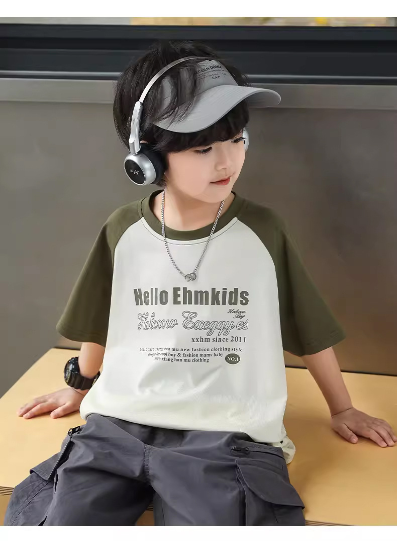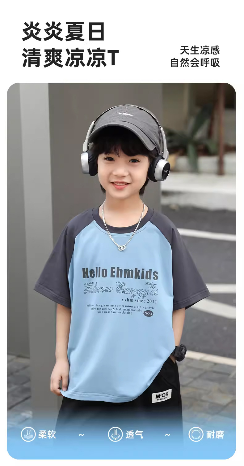 남아 반팔 배색 티셔츠 여름 트렌디 티셔츠 큰아동용 반팔 상의 2026년 신상 아동복 베이스 티셔츠
