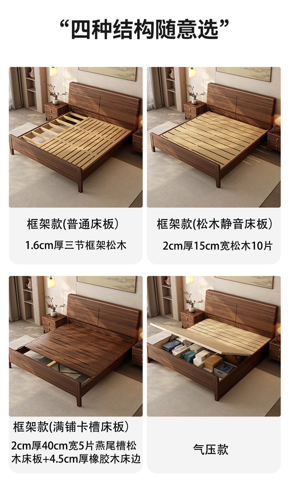• 1.8* 2m ; 프레임 모델(소나무 무소음 침대판), 침대 + 수납장 2개 + 20cm 표준 라텍스 매트리스, 월넛 컬러