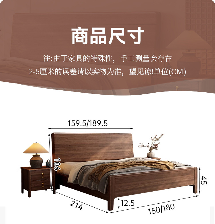 호두나무 원목 침대, 북유럽 스타일, 모던 심플, 가정용 소형 아파트용, 1.8m 더블 침대, 직배송