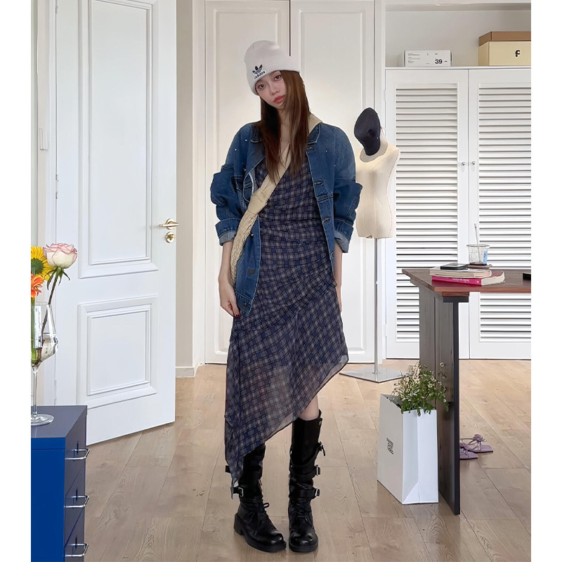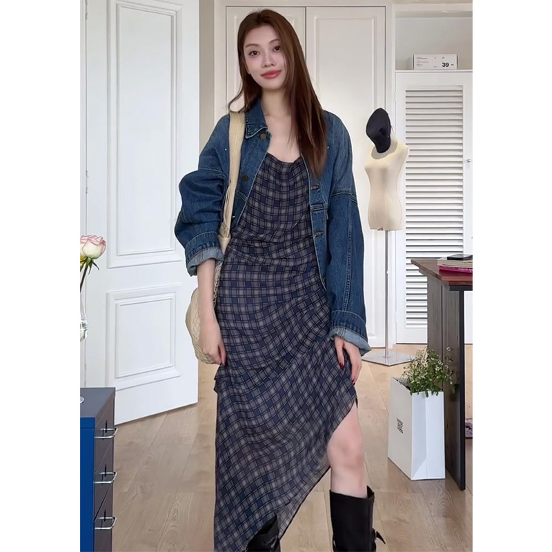 미국식 Yujie Cool Sa 착용 블루 데님 자켓 착용 불규칙한 격자 무늬 슬링 원피스 여성 투피스 세트스토어 가기