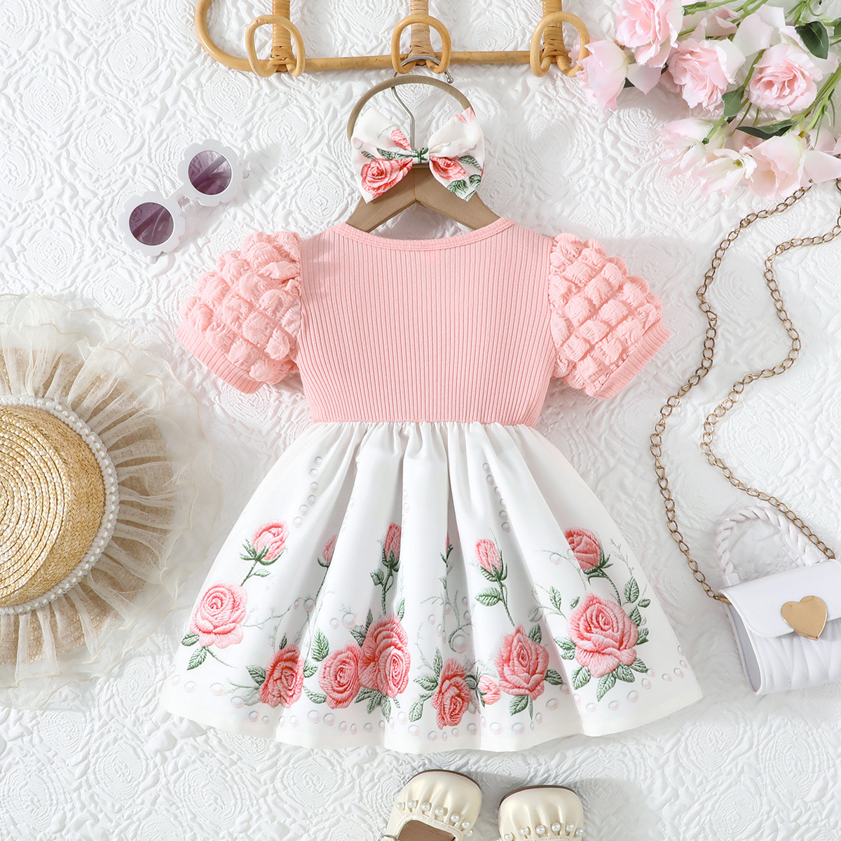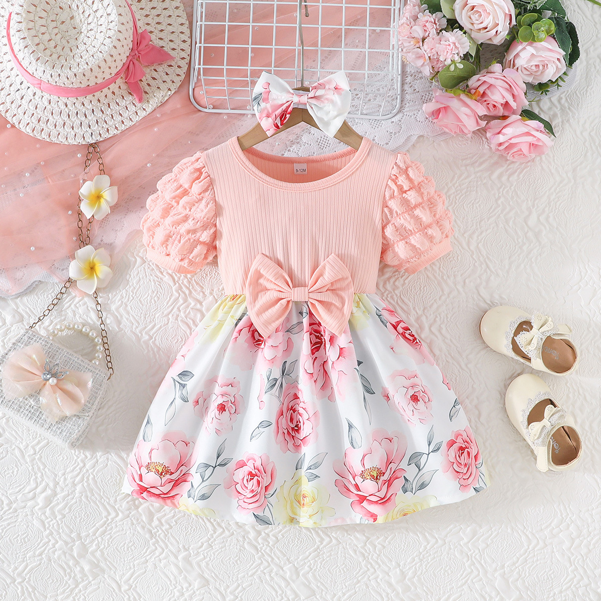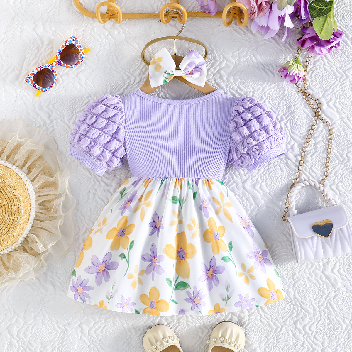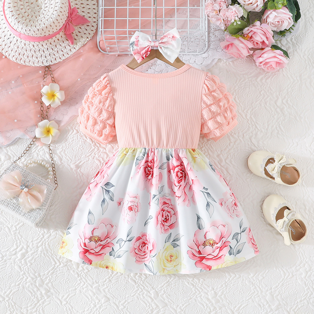 원제조사 여아 퍼프소매 꽃무늬 공주 드레스 여름 스타일 골지 리본 원피스, 같은 스타일의 헤어 액세서리 증정