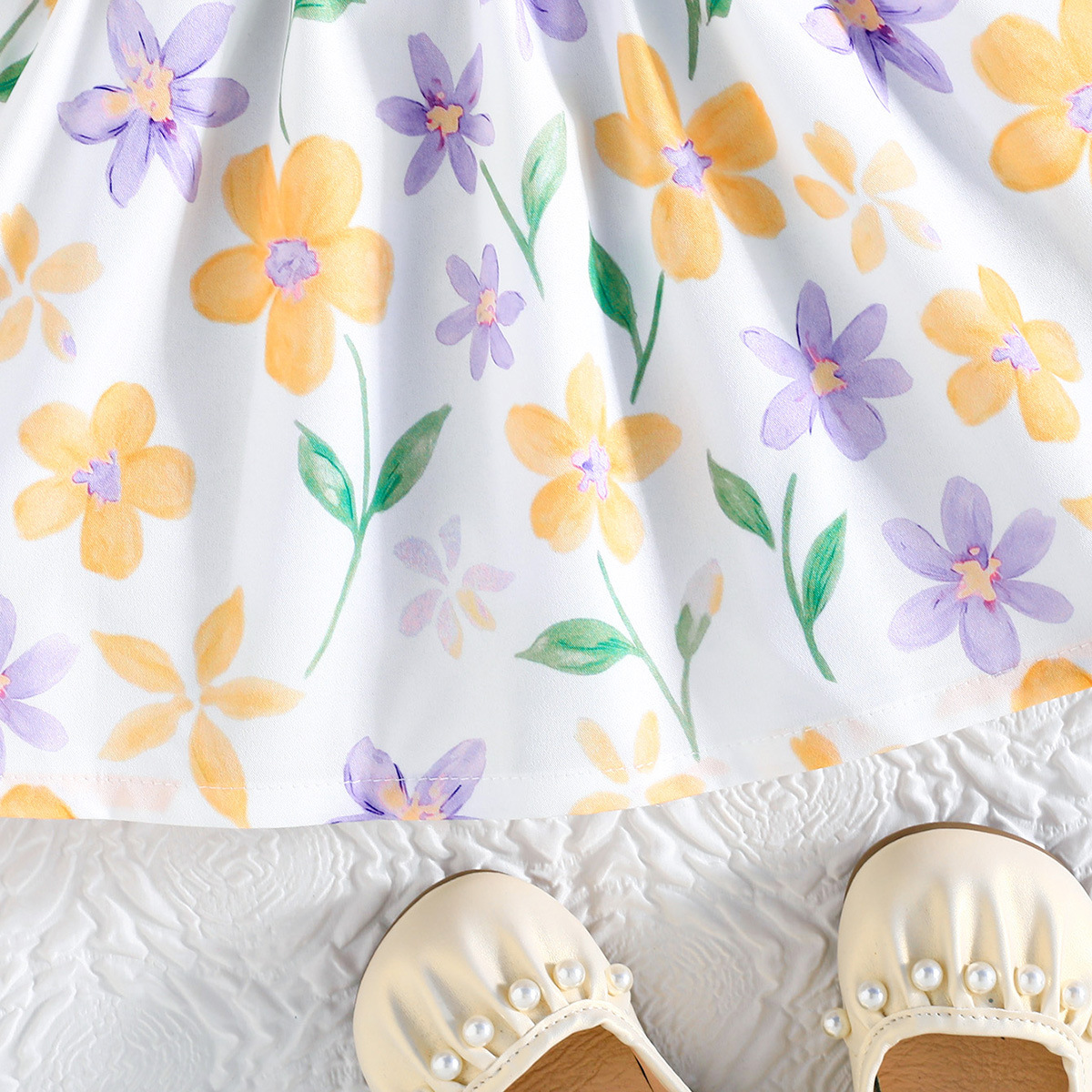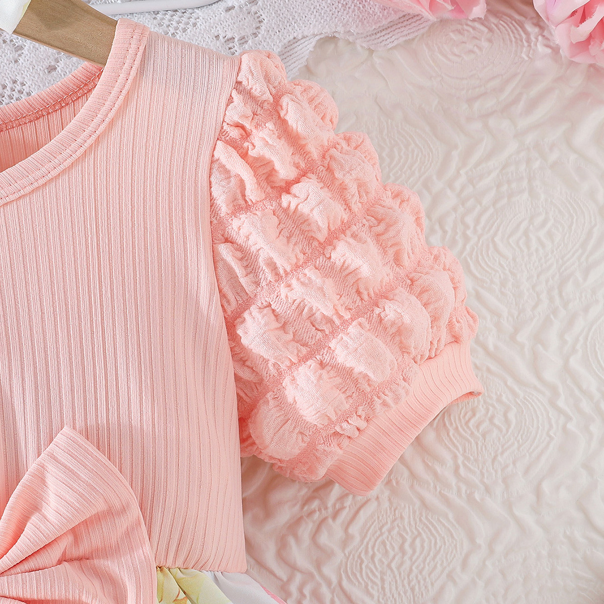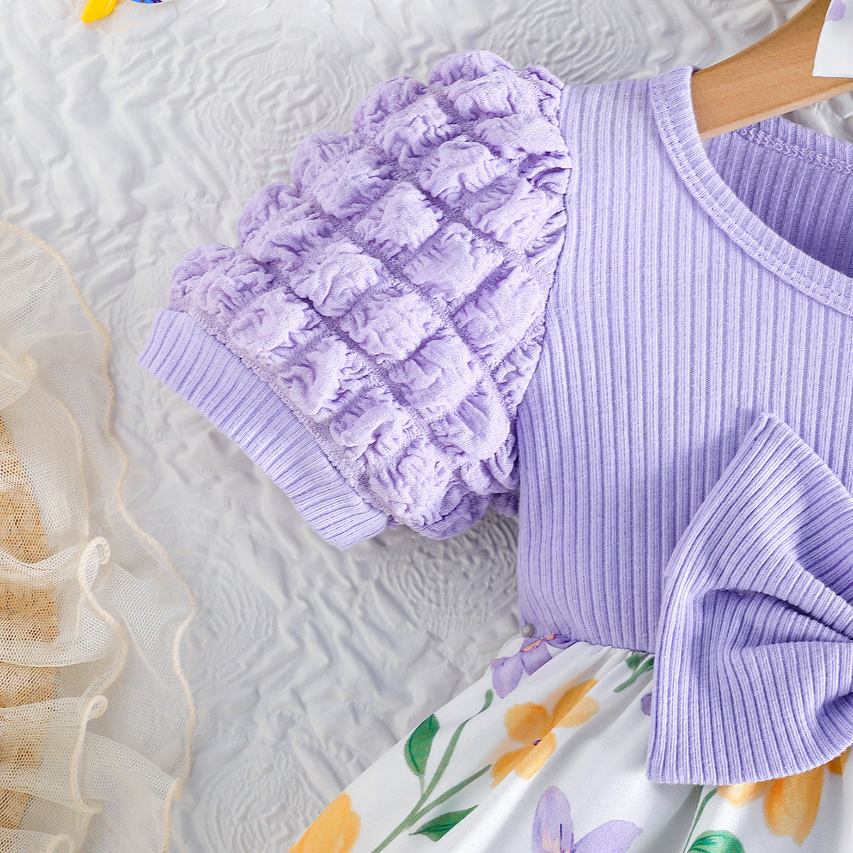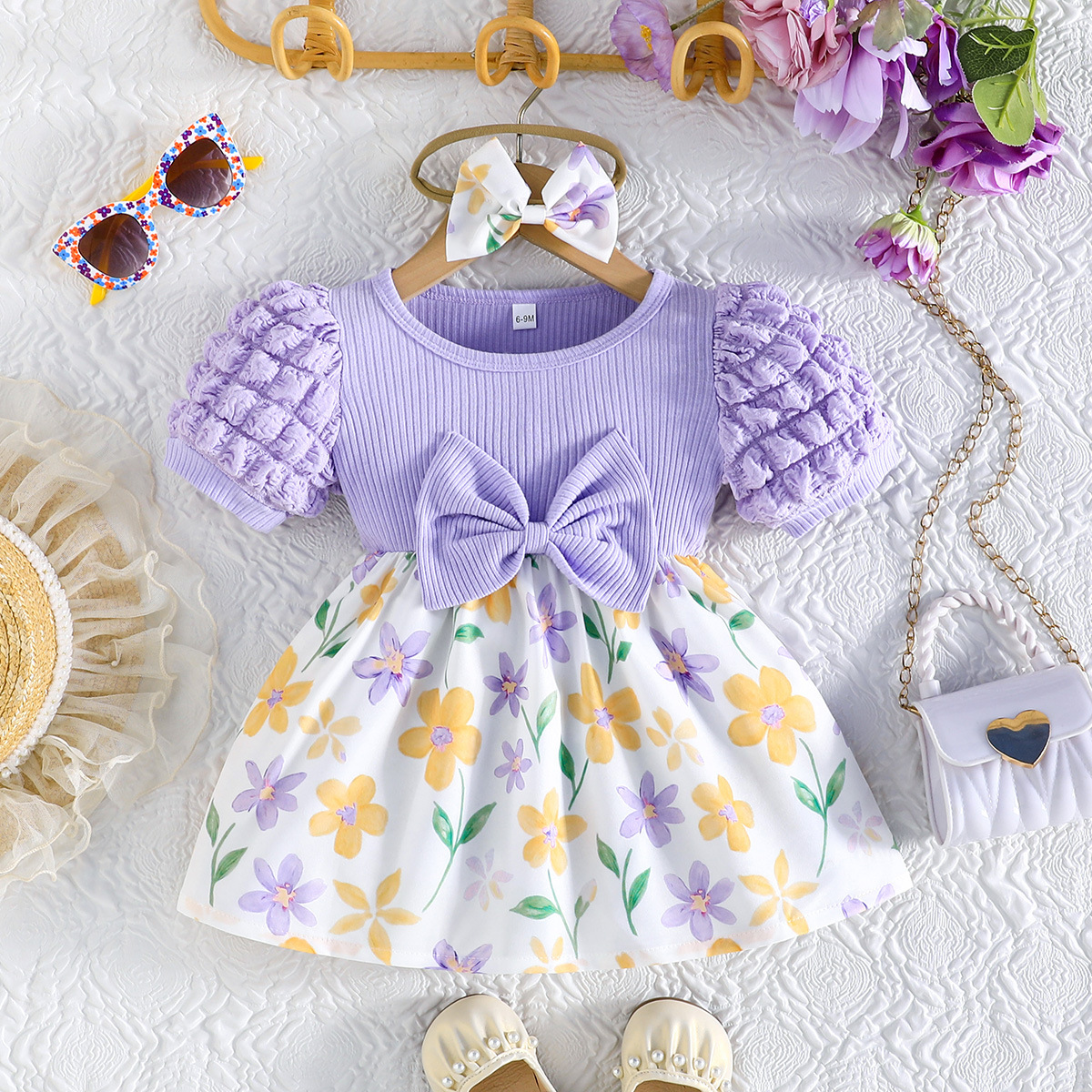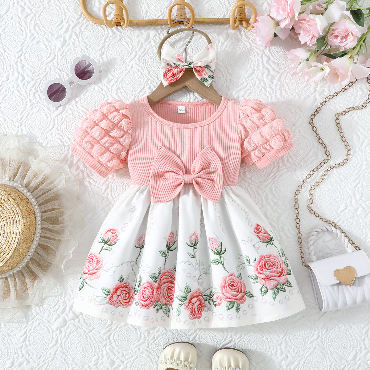 원제조사 여아 퍼프소매 꽃무늬 공주 드레스 여름 스타일 골지 리본 원피스, 같은 스타일의 헤어 액세서리 증정