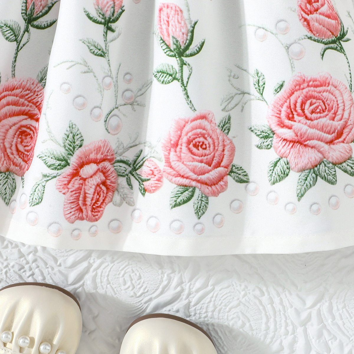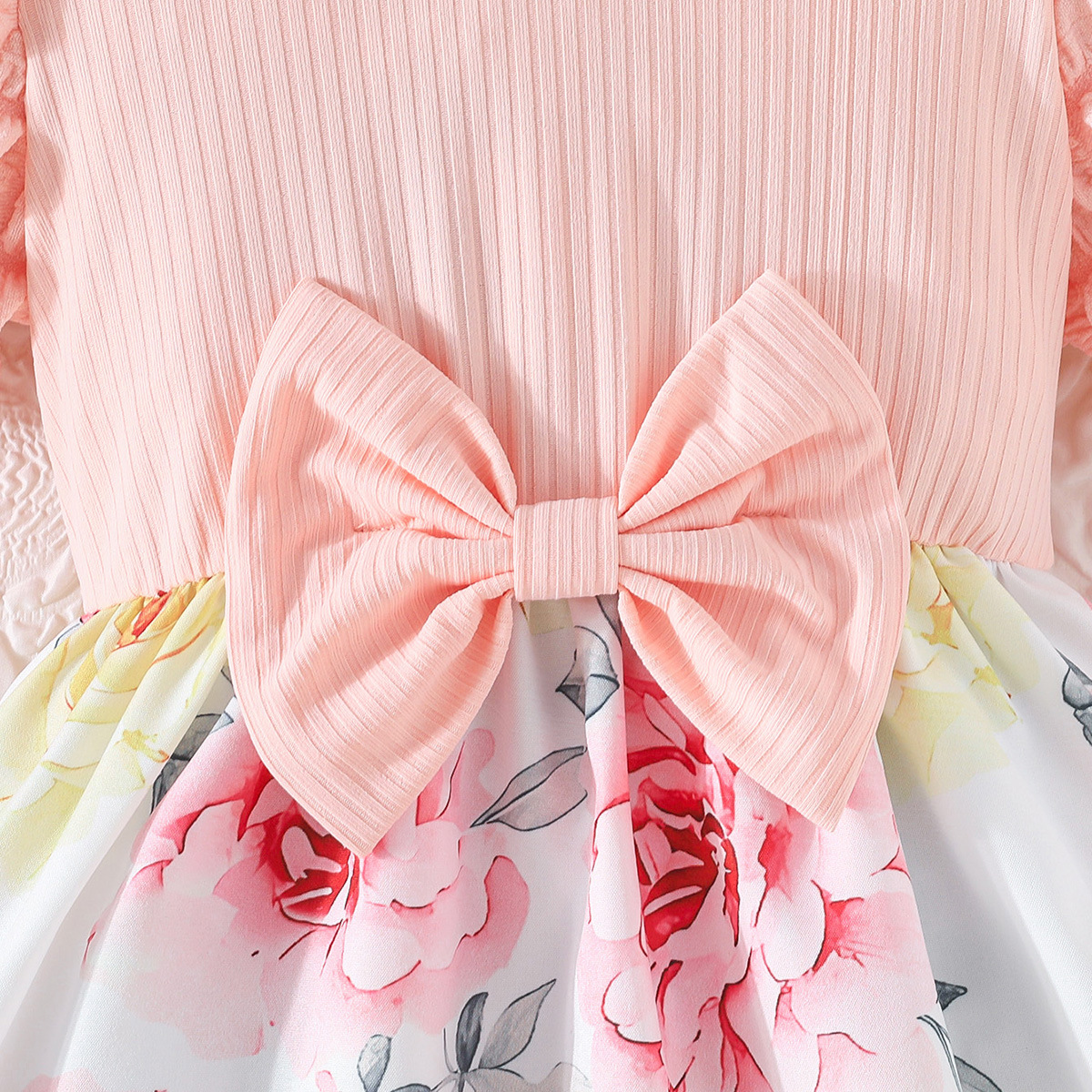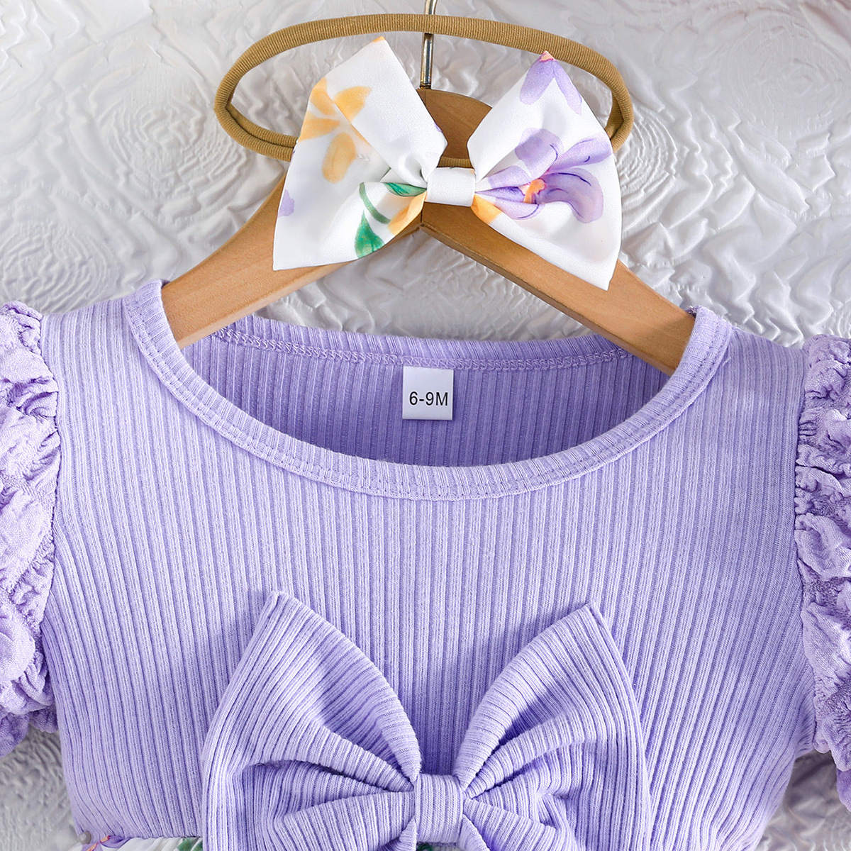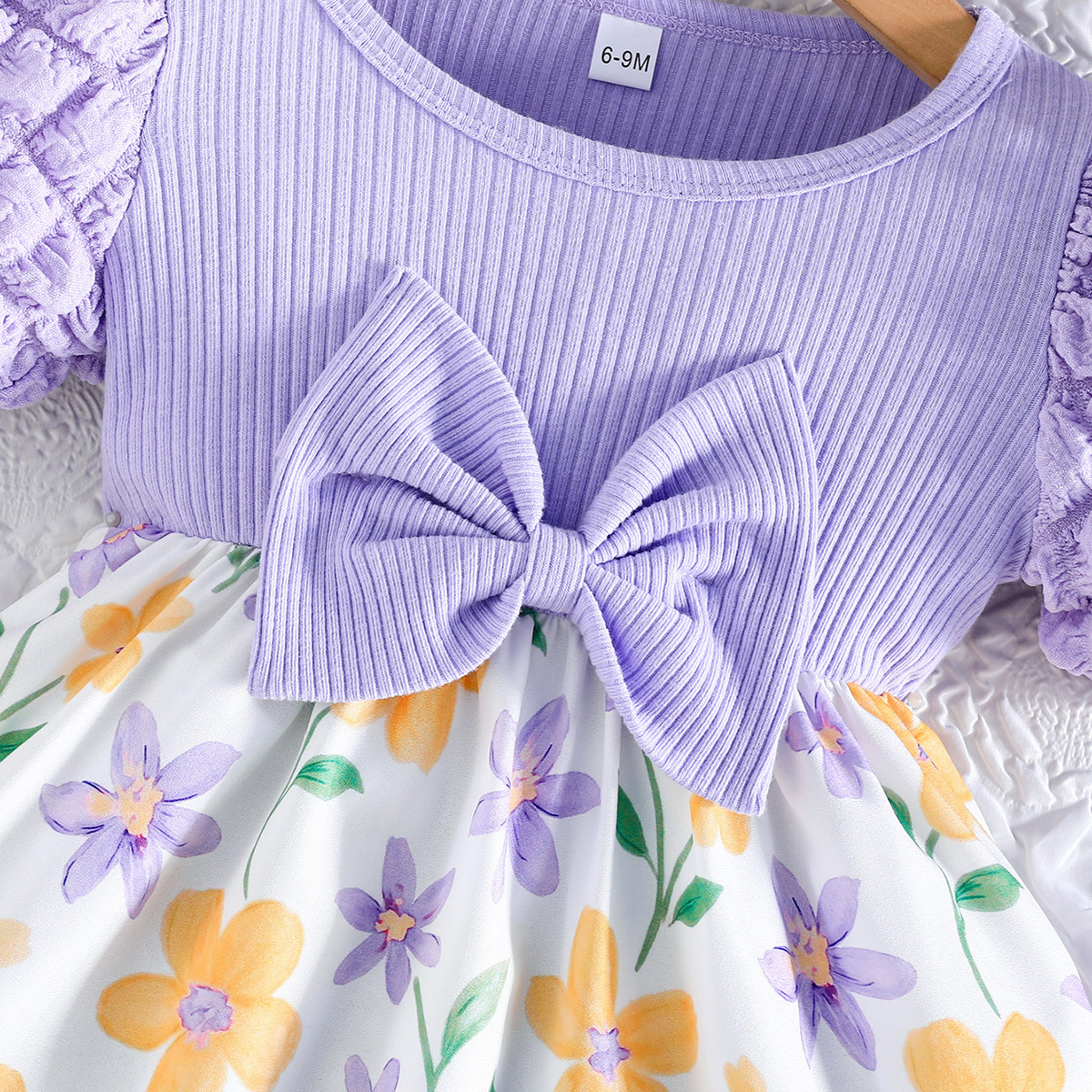 원제조사 여아 퍼프소매 꽃무늬 공주 드레스 여름 스타일 골지 리본 원피스, 같은 스타일의 헤어 액세서리 증정
