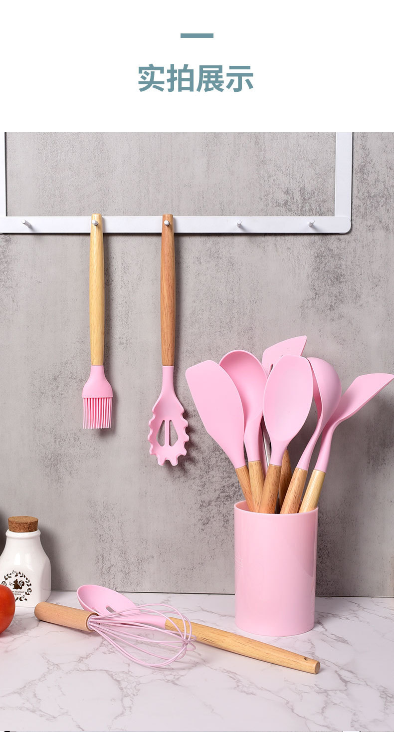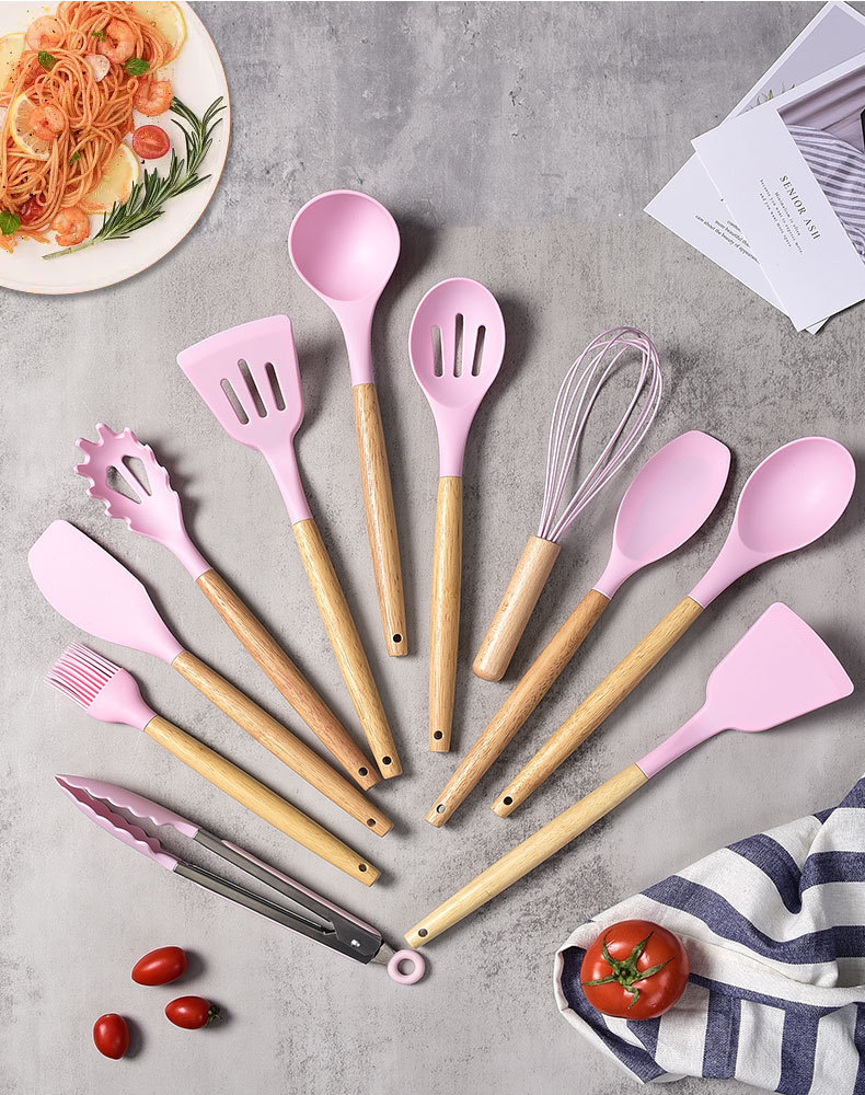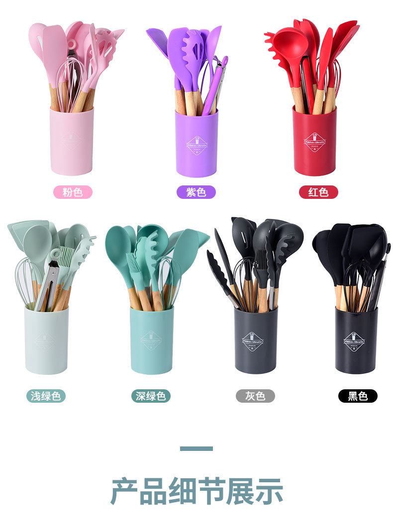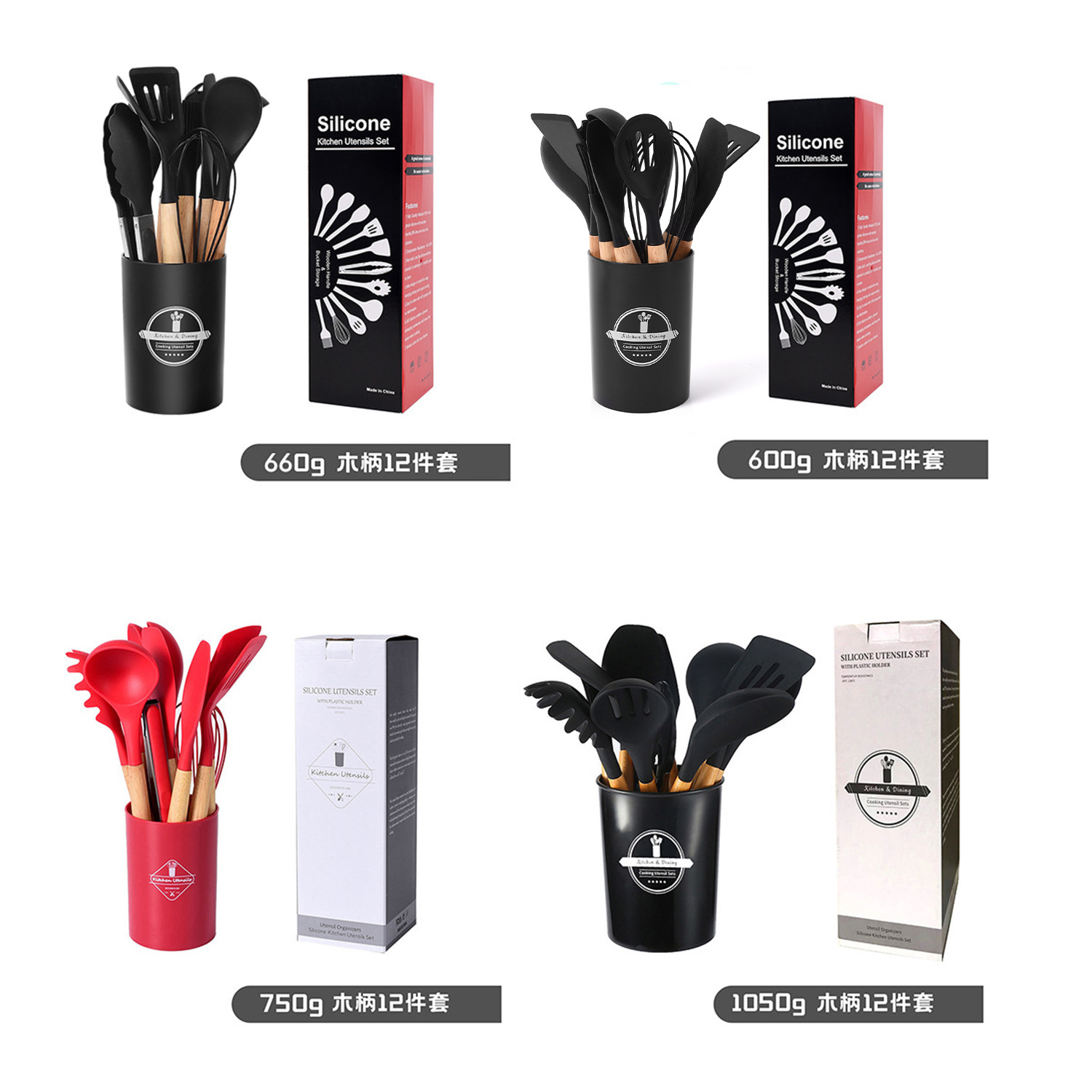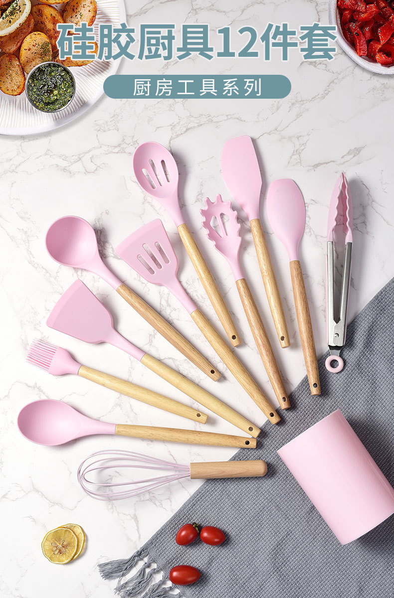 나무 손잡이 실리콘 주방용품 세트 12 조각 주방 높은 온도 저항하는 안티-스틱 냄비 실리콘 삽 숟가락 요리 도구
