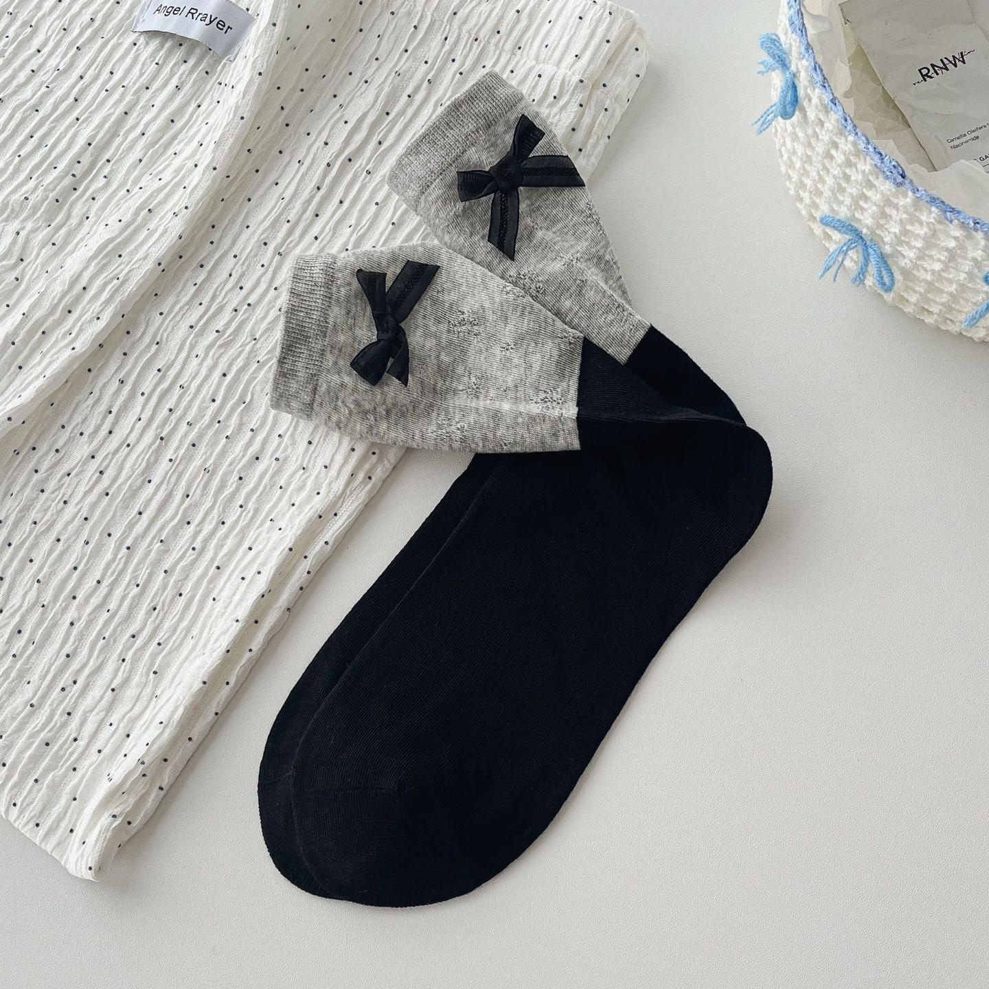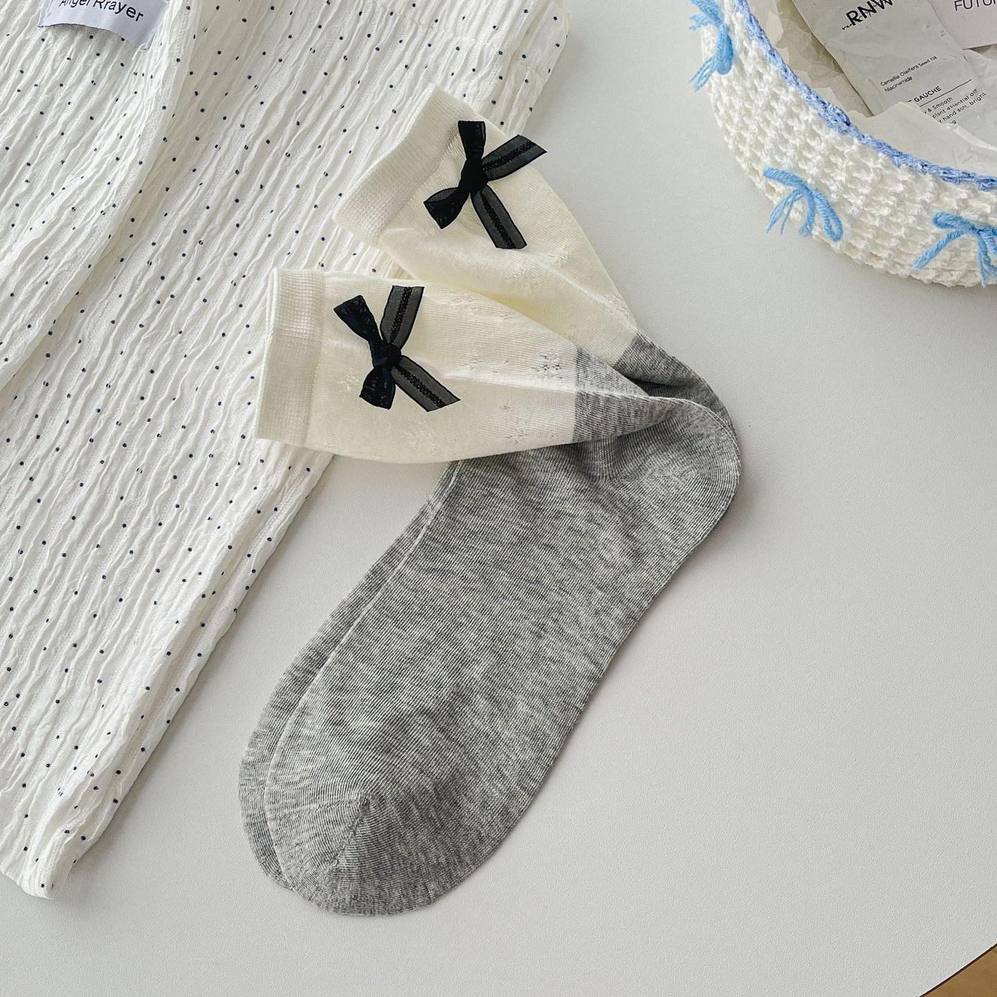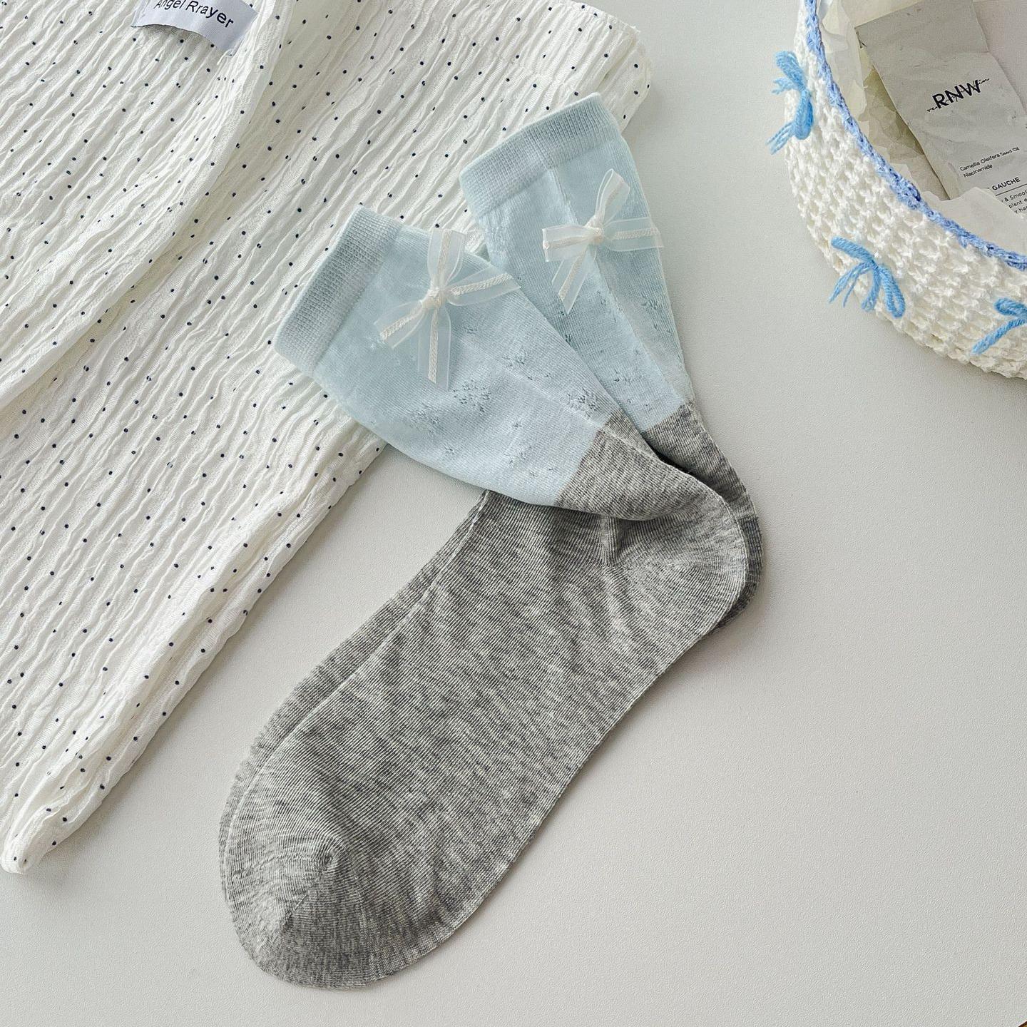 달콤한 속이 빈 디자인의 소녀스러운 핑크~ 한국 스타일의 핑크와 그레이의 대비되는 컬러 리본 양말, 여성용 봄 여름 얇은 코마면 소재