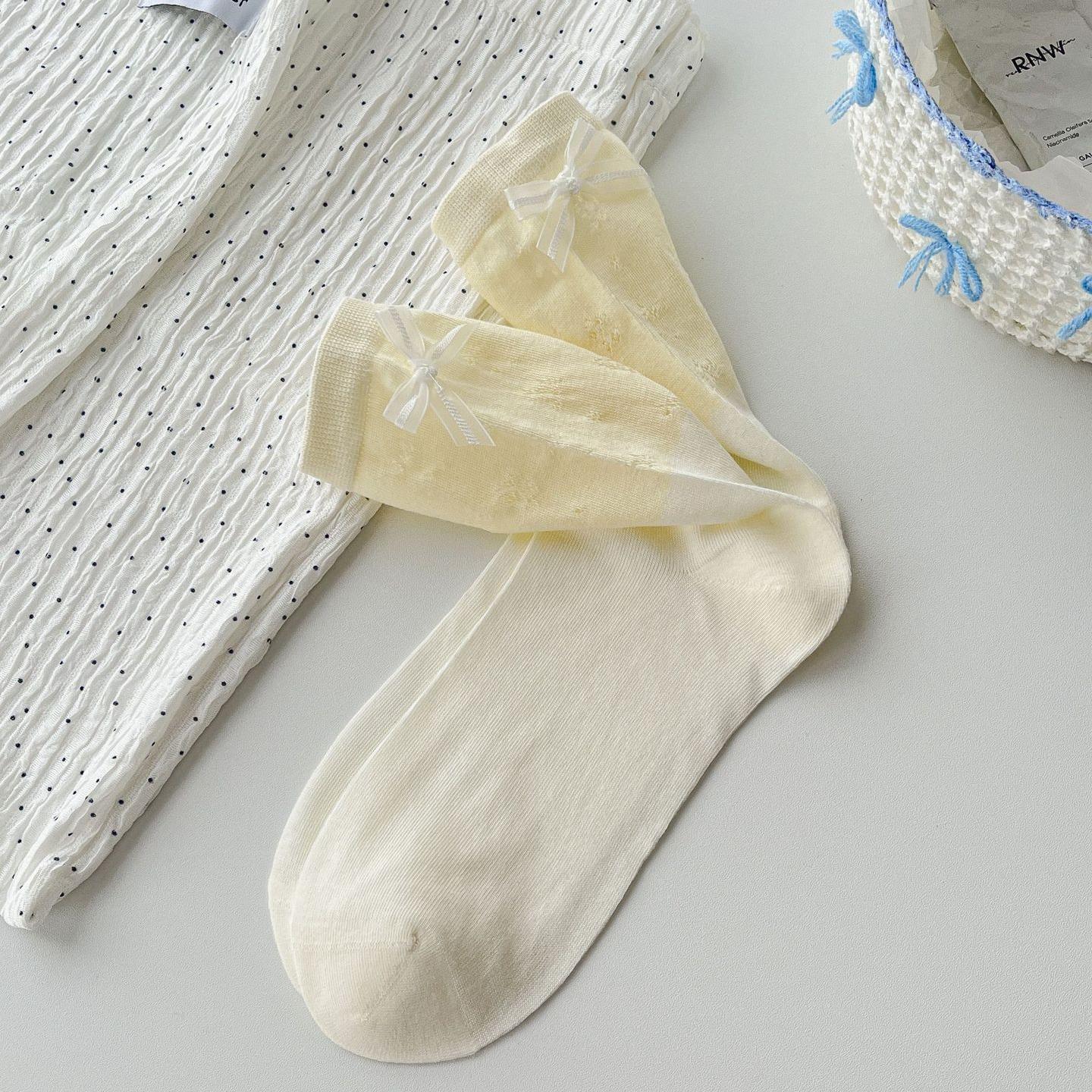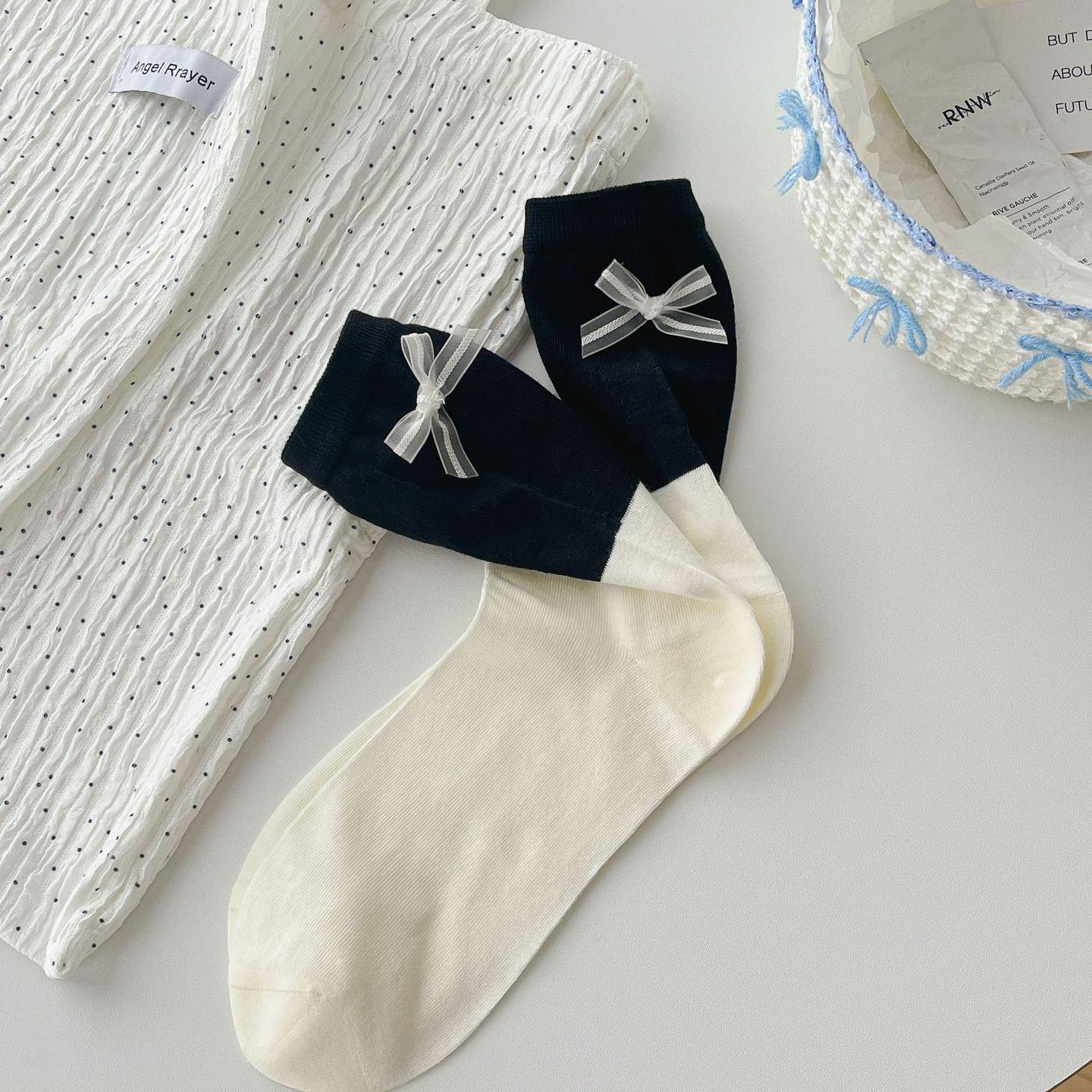 달콤한 속이 빈 디자인의 소녀스러운 핑크~ 한국 스타일의 핑크와 그레이의 대비되는 컬러 리본 양말, 여성용 봄 여름 얇은 코마면 소재스토어 가기