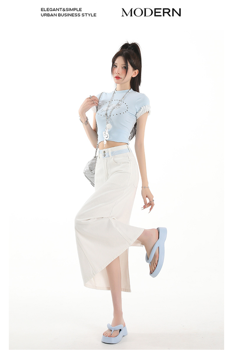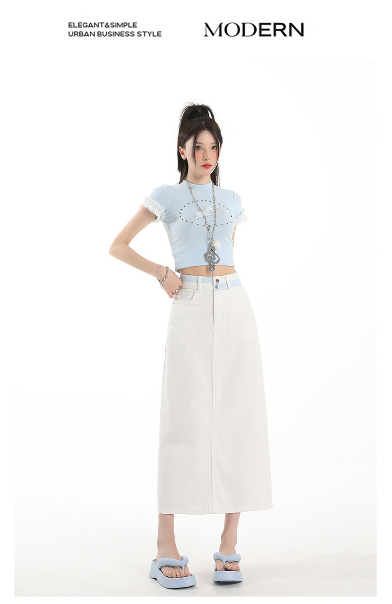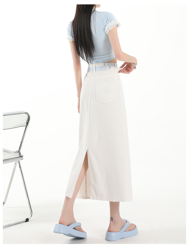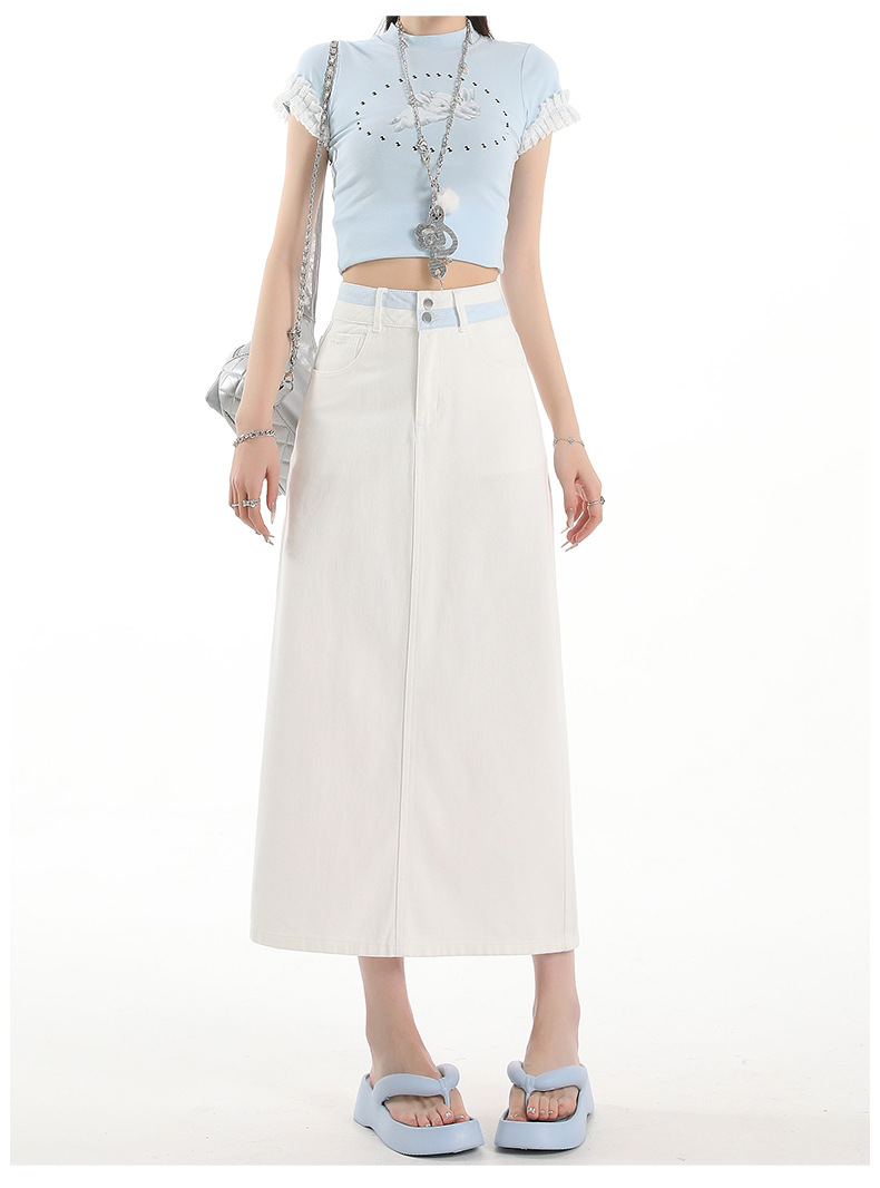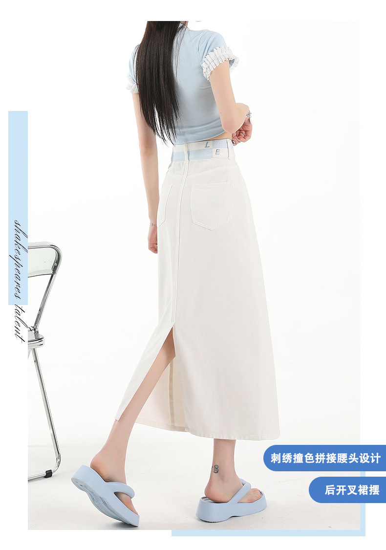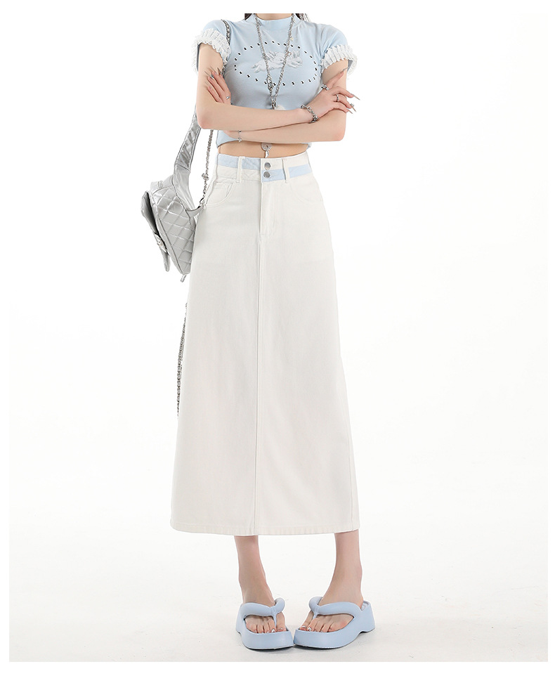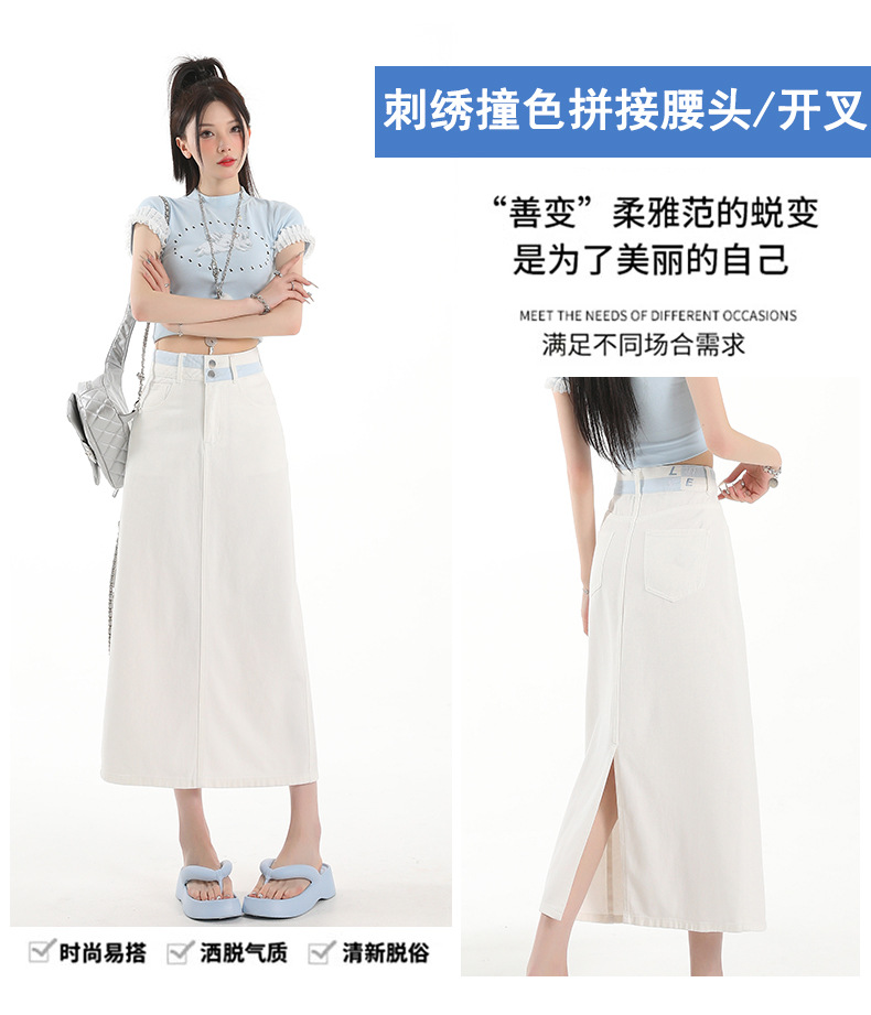 아이보리 데님 치마 여자 2025 여름 새로운 디자인 감각 분할 조커 중간 길이 스커트