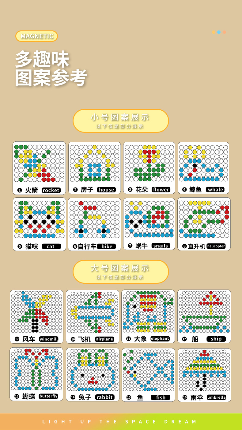 • 대형 사이즈 [귀여운 토끼]에는 패턴 앨범 + 펜 1개 + 펜 홀더 + 체스 말 50개가 포함되어 있습니다.