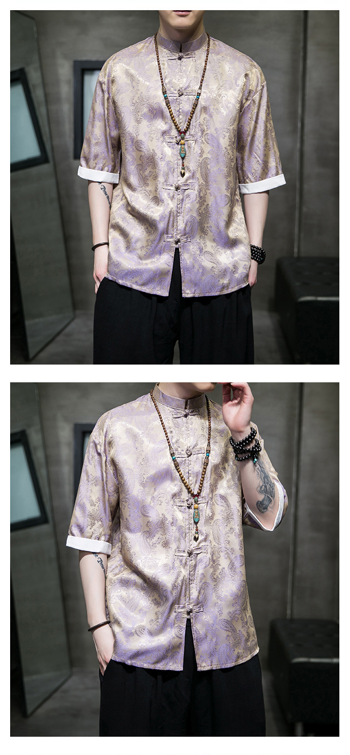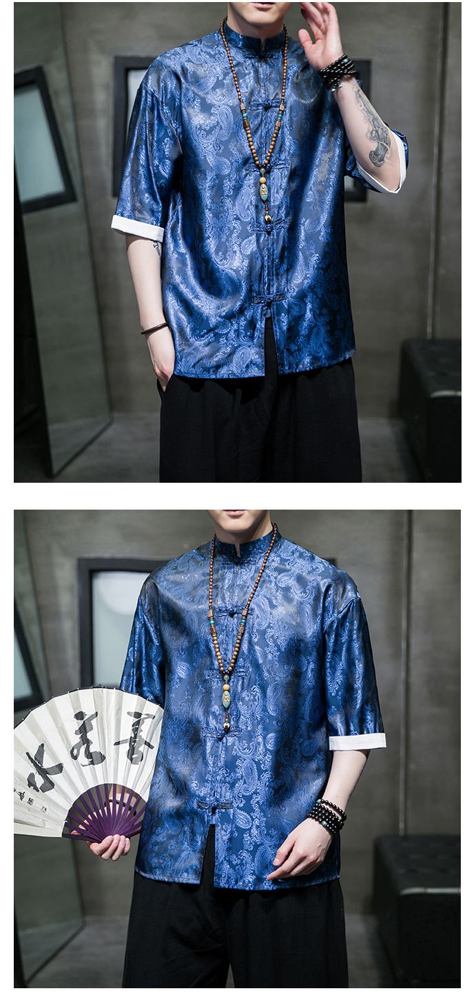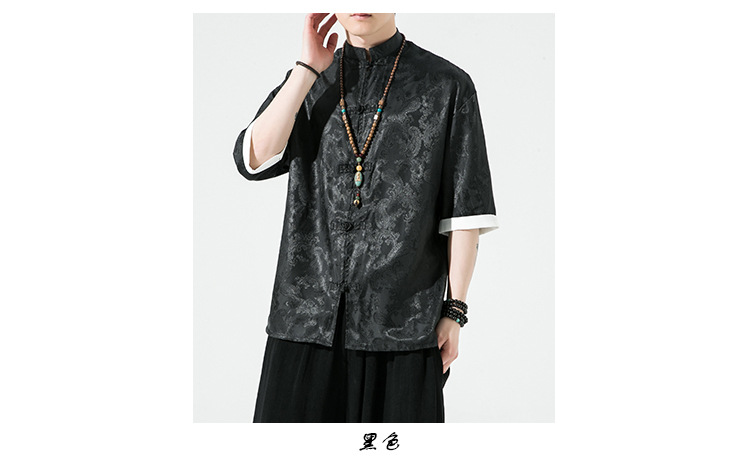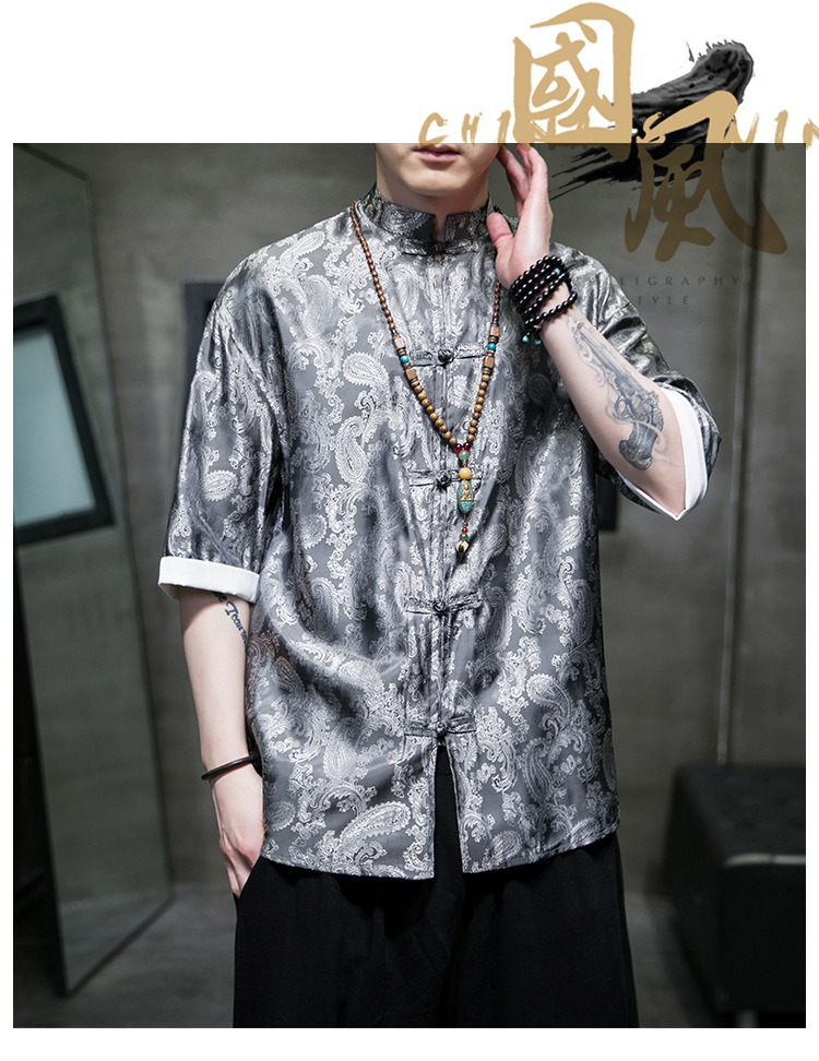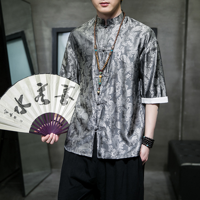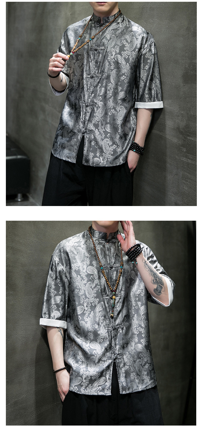 아이스 실크 당나라 정장 중국 스타일 여름 얇은 반팔 셔츠 남성 복고풍 느슨한 Hanfu 대형 5부 소매 셔츠