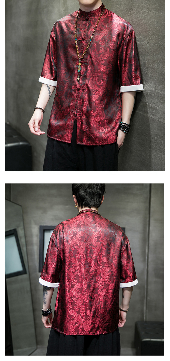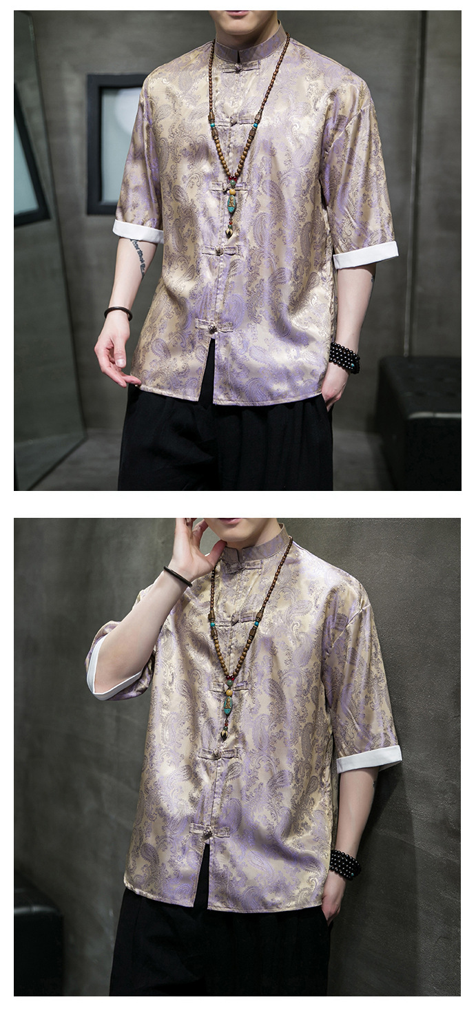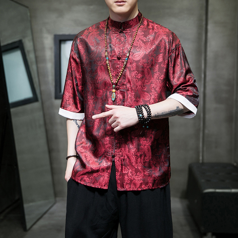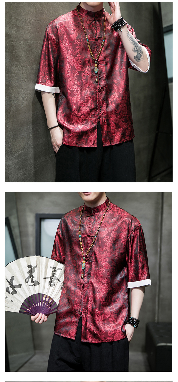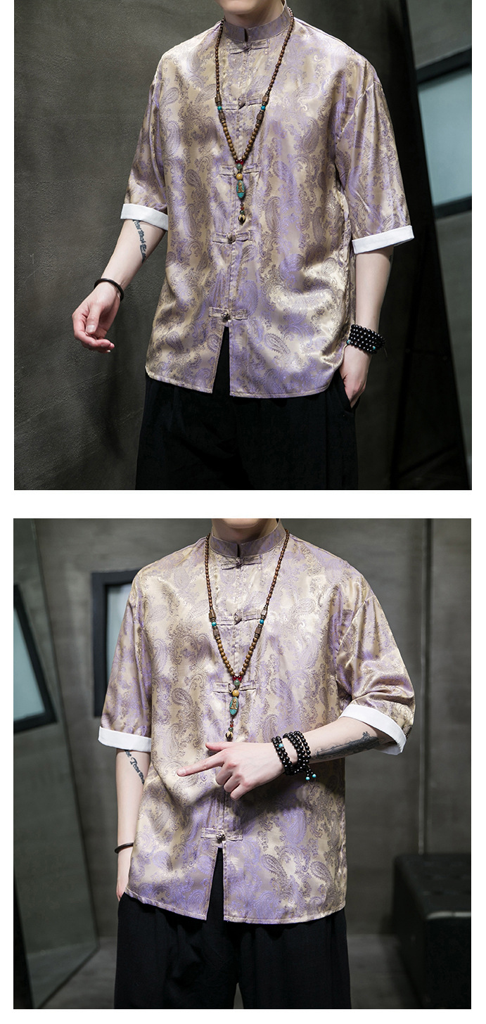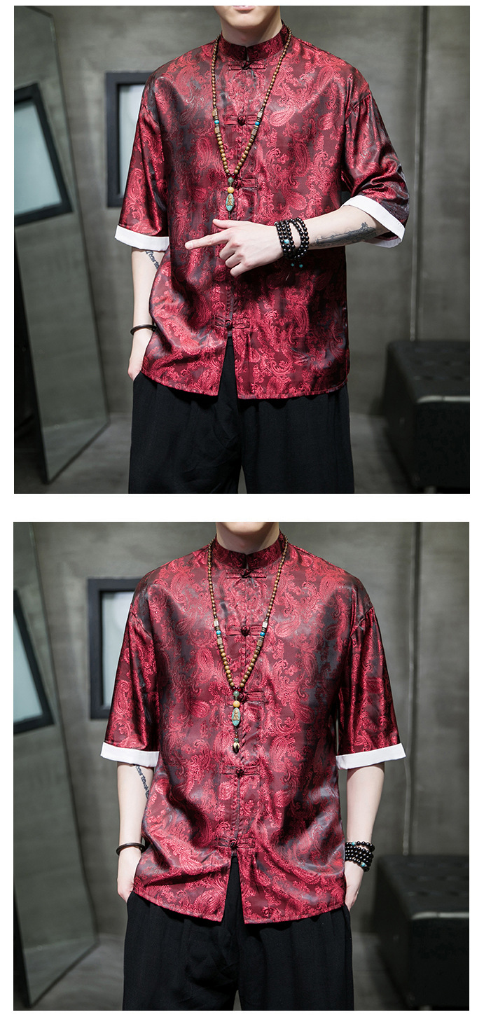 아이스 실크 당나라 정장 중국 스타일 여름 얇은 반팔 셔츠 남성 복고풍 느슨한 Hanfu 대형 5부 소매 셔츠