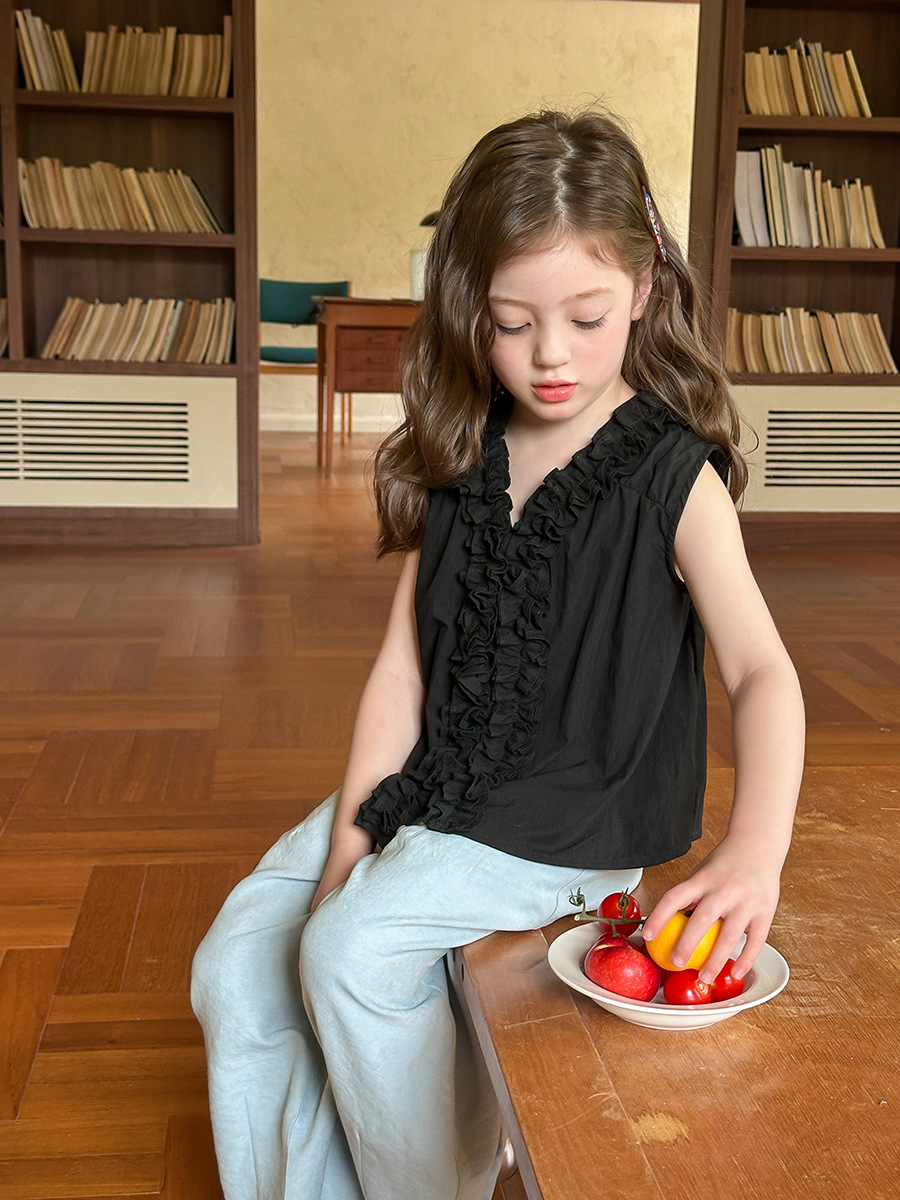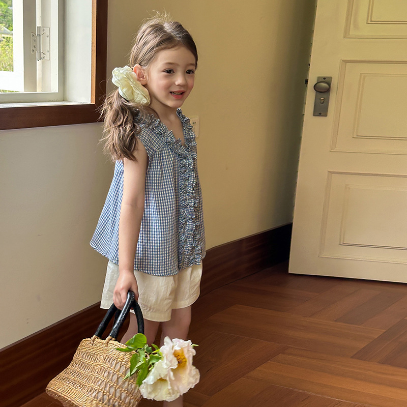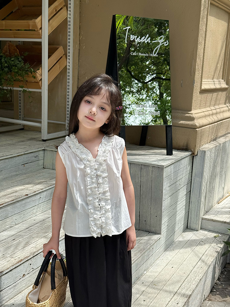 아이모베이베이 여아용 프렌치 스타일 꽃잎 칼라 셔츠 티셔츠 달콤한 레이스 민소매 탑 여름