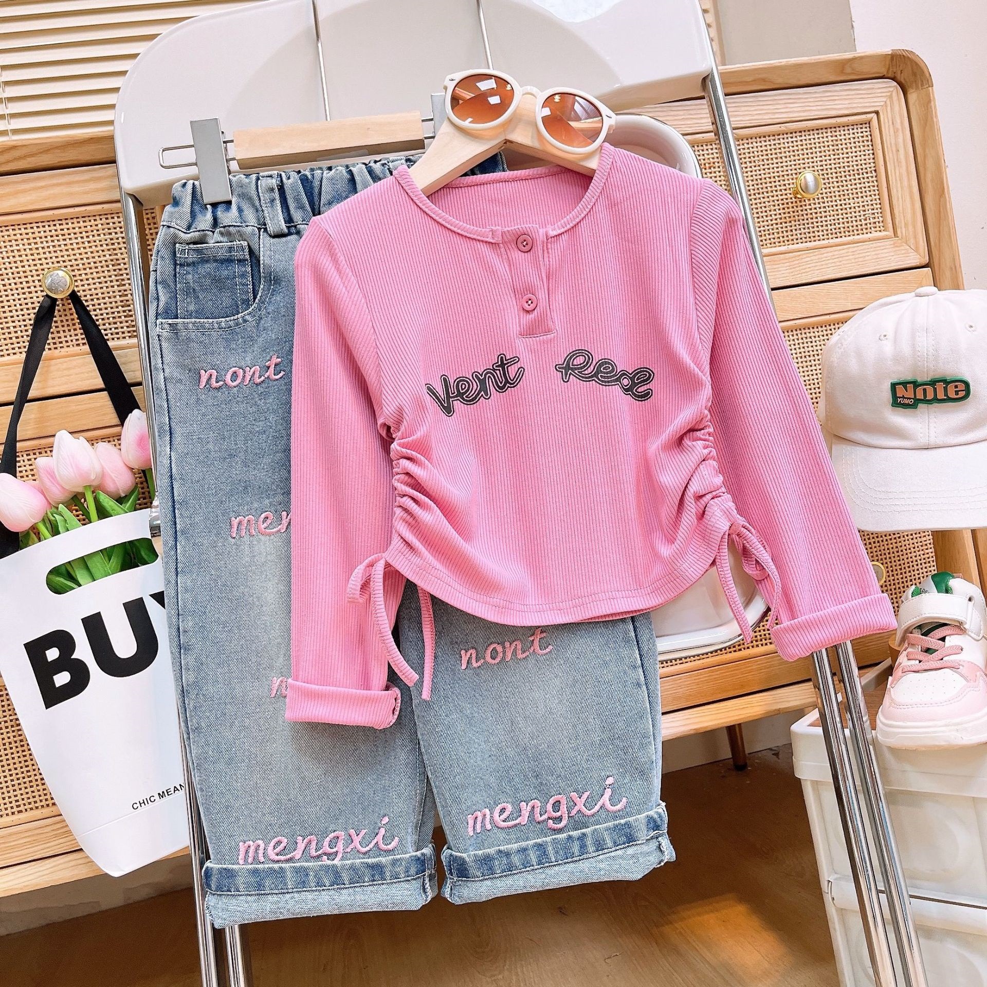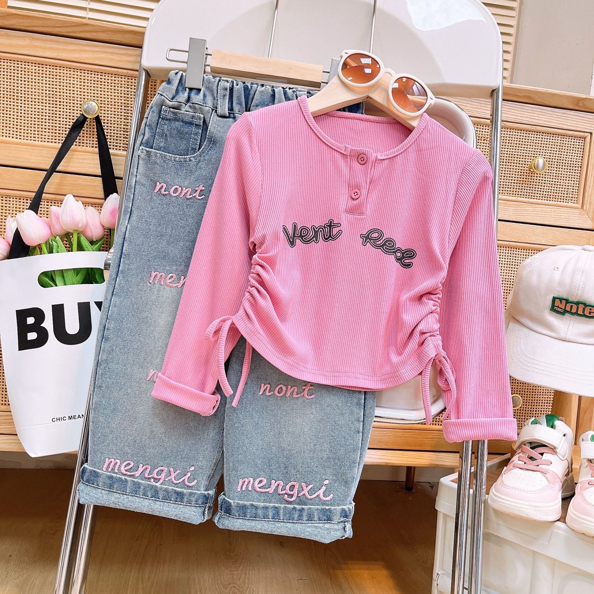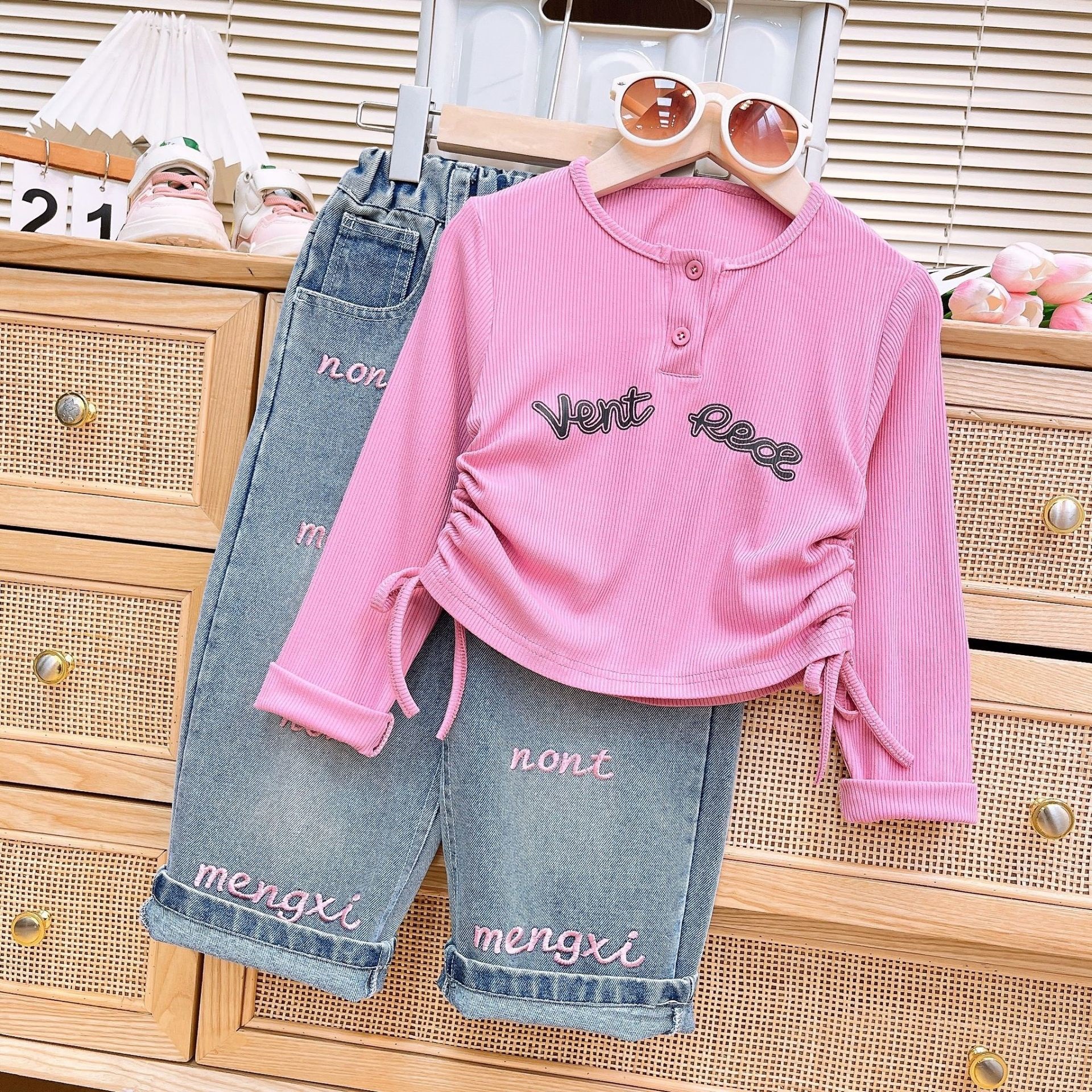 2024 소녀 가을, 겨울 새로운 아동 의류 아기 소녀 귀여운 Drawstring Bottoming Shirt Plus Letter 자수 청바지 정장스토어 가기