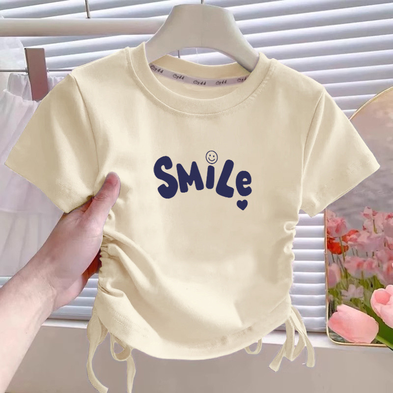 순면 중대형 어린이 불규칙한 졸라매는 끈 반팔 티셔츠 소녀 여름 디자인 라운드 넥 아동복 짧은 탑스토어 가기