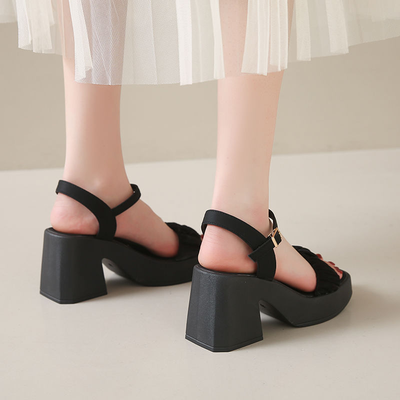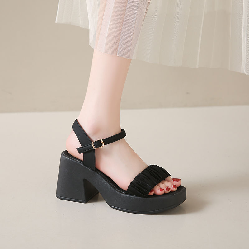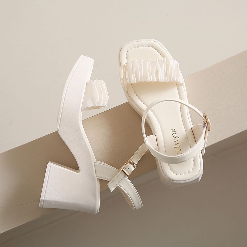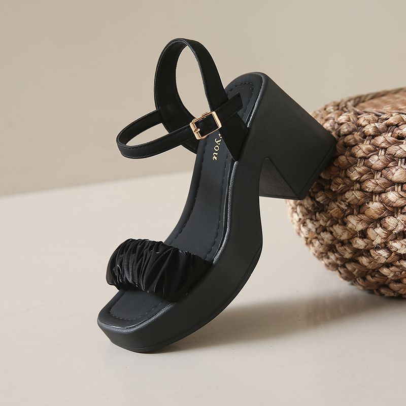 2025 년 여름 새로운 한 단어 버클 오픈 토 두꺼운 힐 샌들 여성용 겉옷 주름 정사각형 발가락 하이힐 샌들 도매