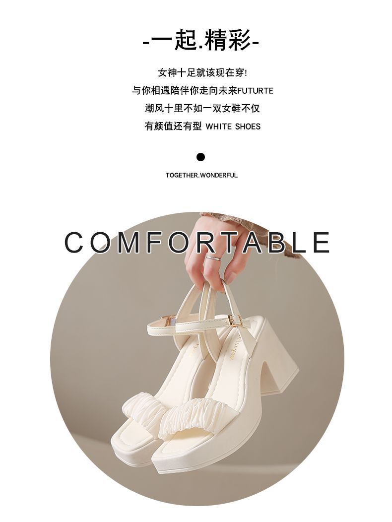 2025 년 여름 새로운 한 단어 버클 오픈 토 두꺼운 힐 샌들 여성용 겉옷 주름 정사각형 발가락 하이힐 샌들 도매스토어 가기