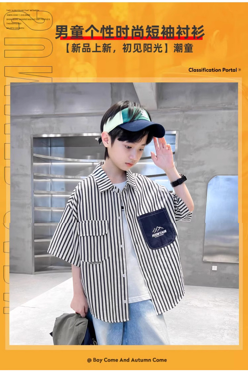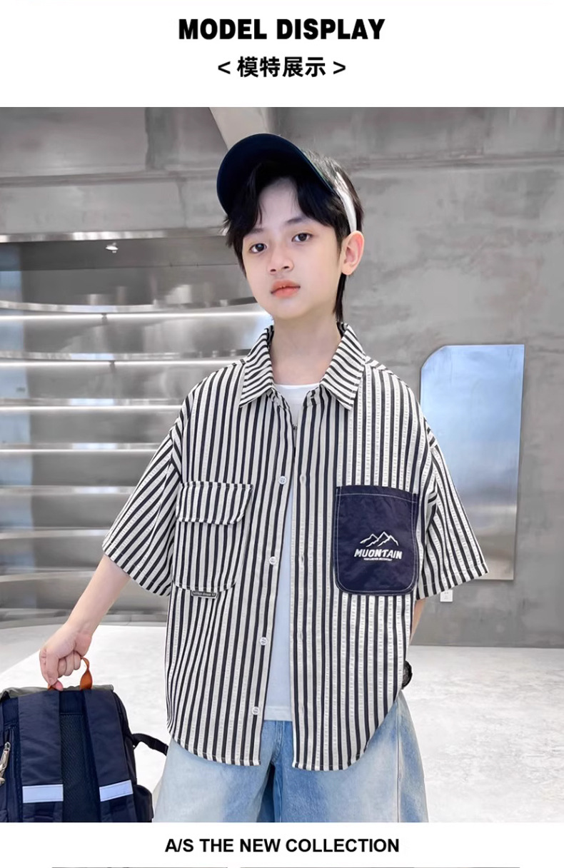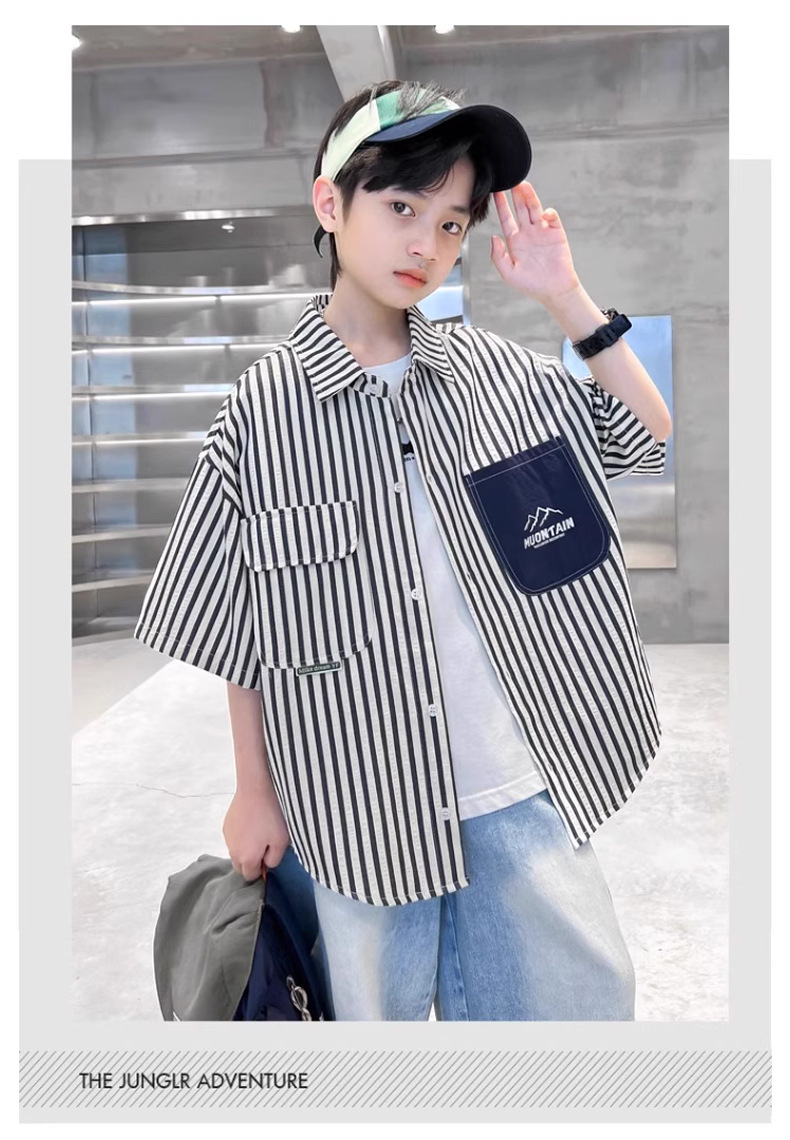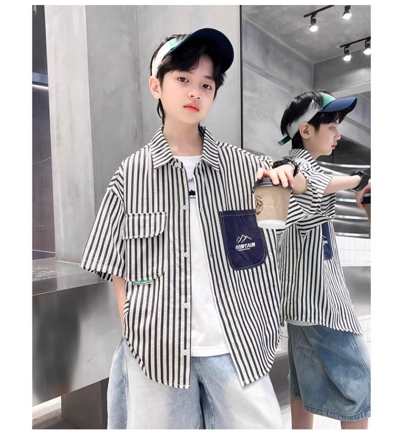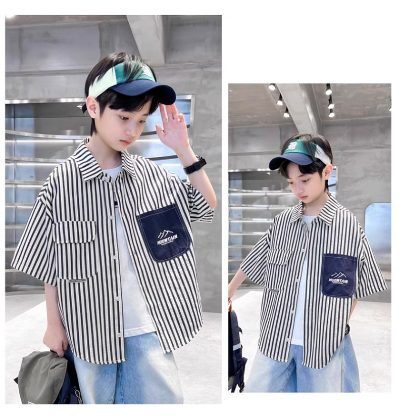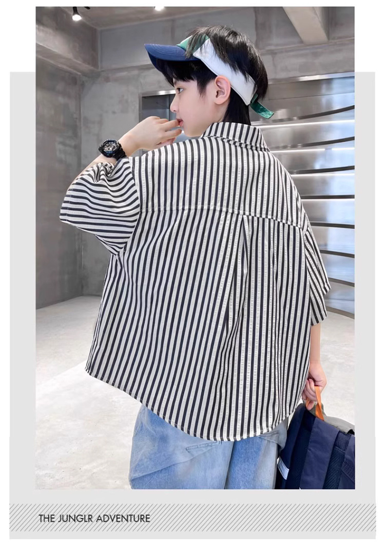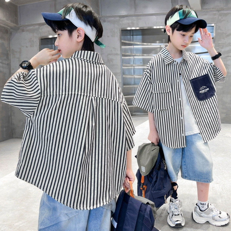 어린이 의류 소년 셔츠 반팔 여름 2025 새로운 스타일 여름 옷 소년의 탑 얇은 어린이 줄무늬 셔츠 여름스토어 가기