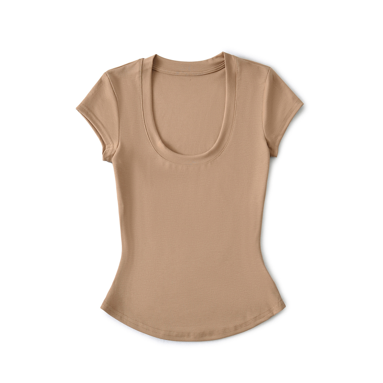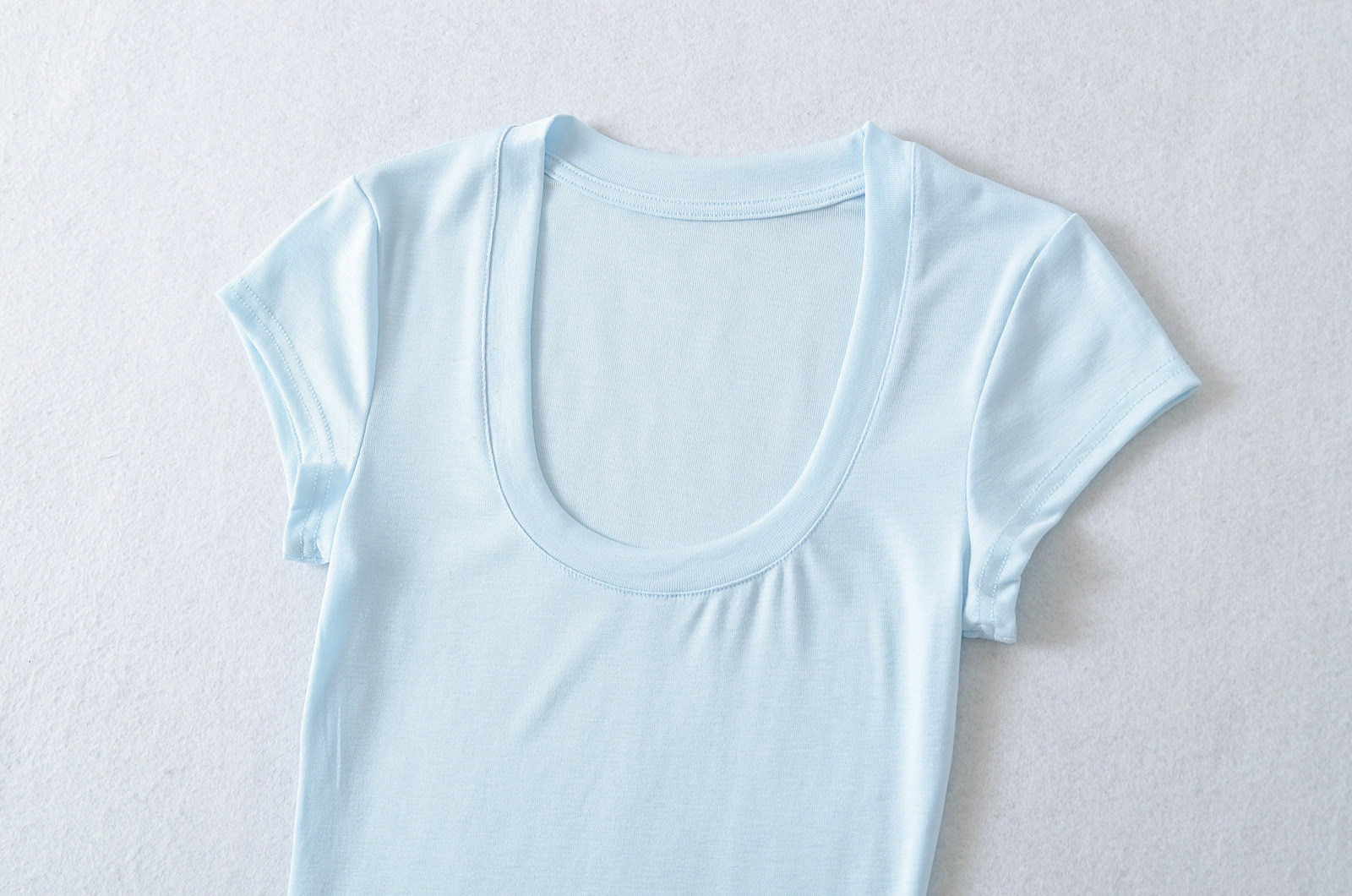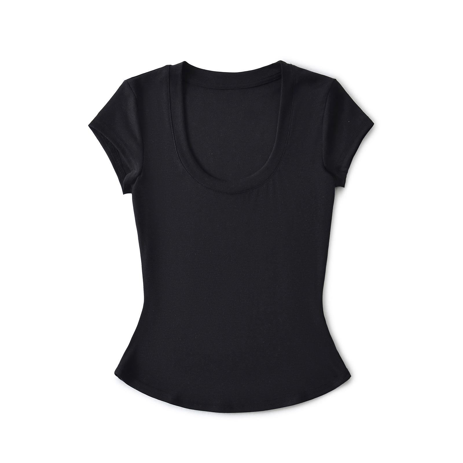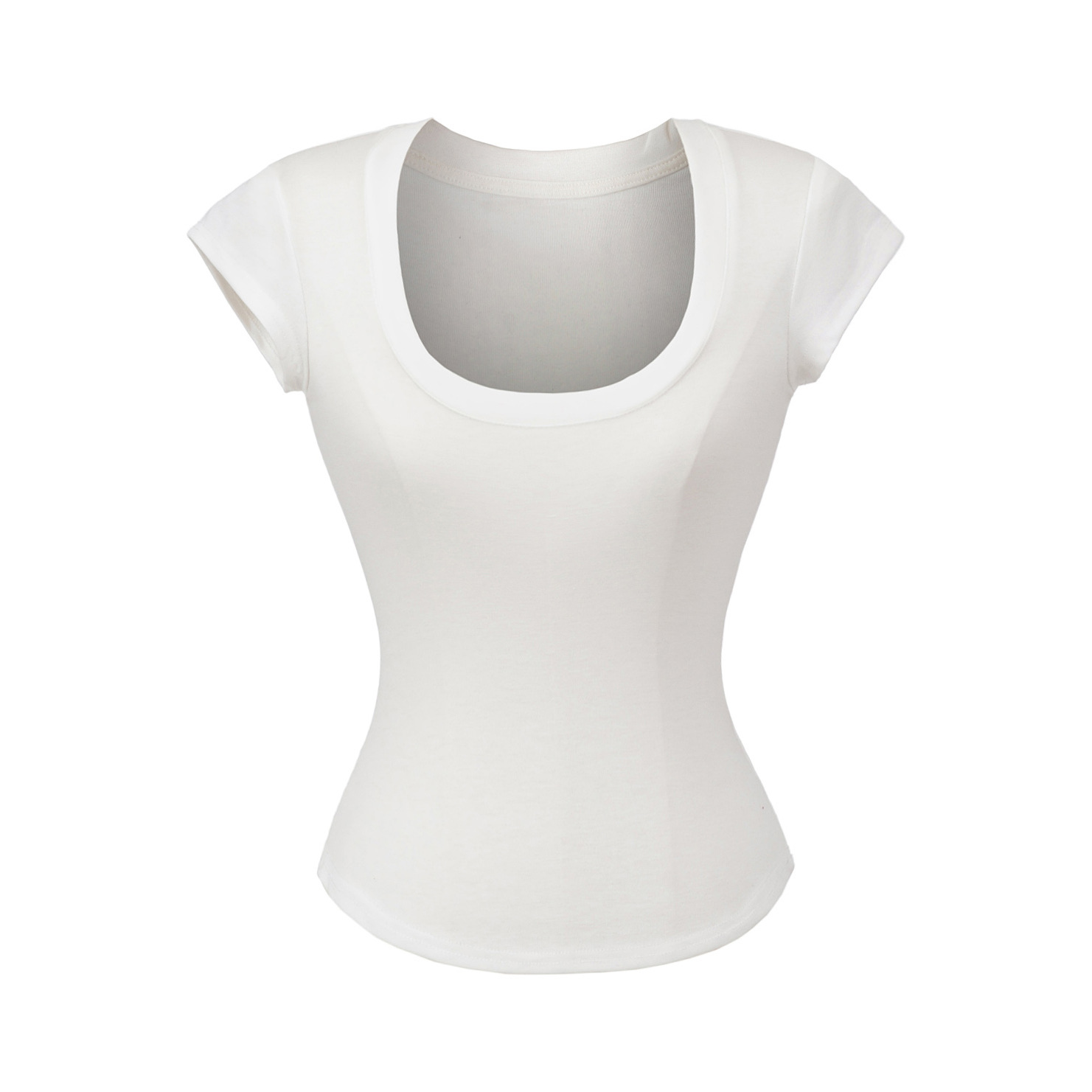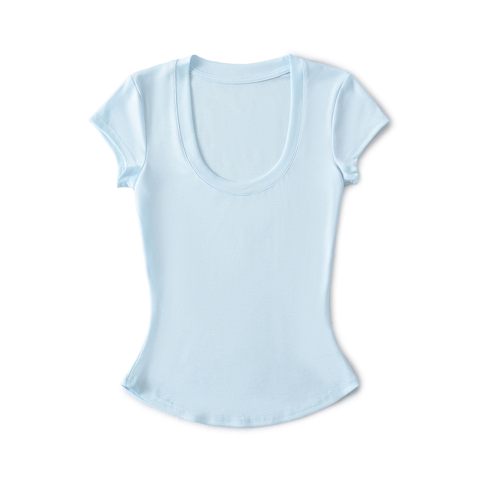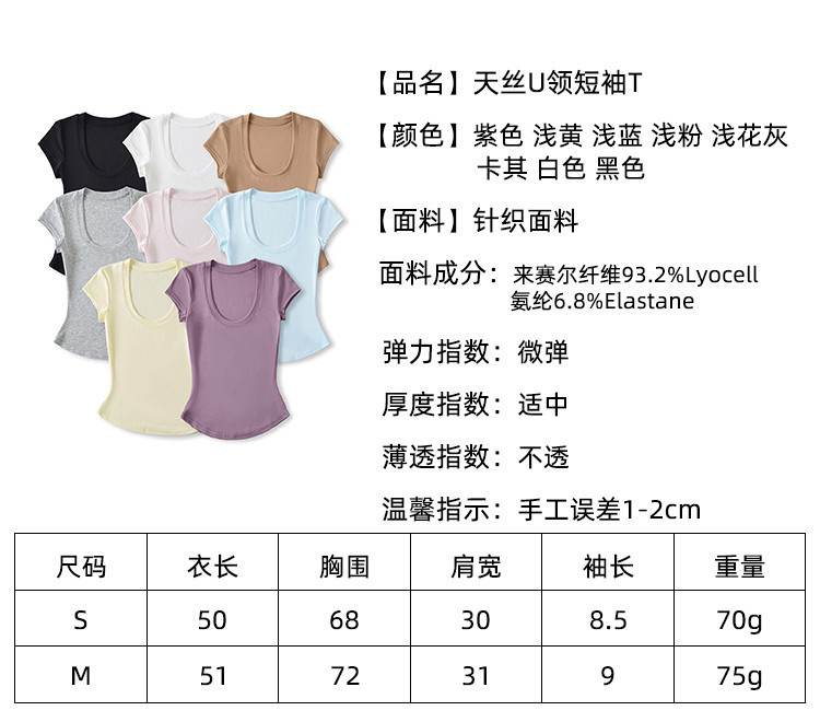 여름 2025 새로운 스타일 스파이스 소녀 슬림 핏 텐셀 U 칼라 반팔 티셔츠 여성용 타이트 허리 슬리밍 솔리드 컬러 탑 타이트베이스 셔츠