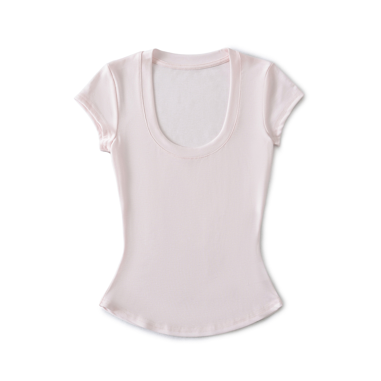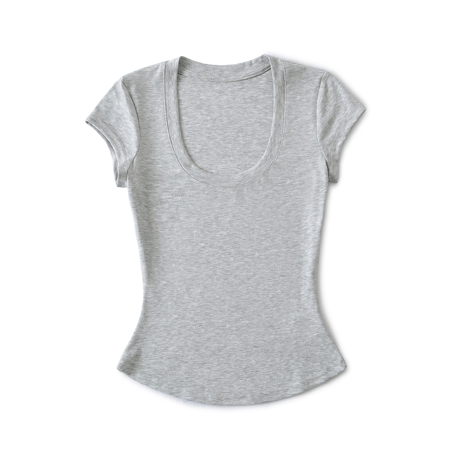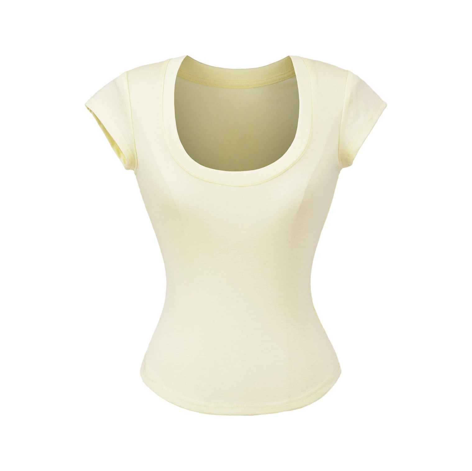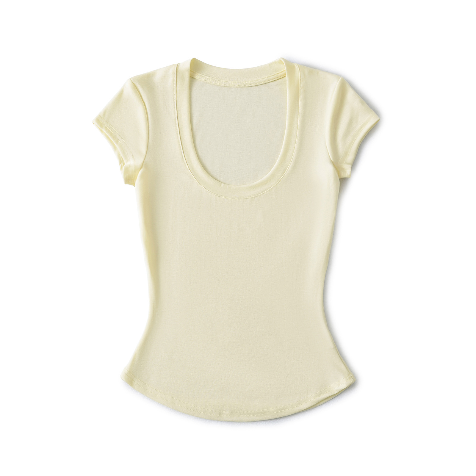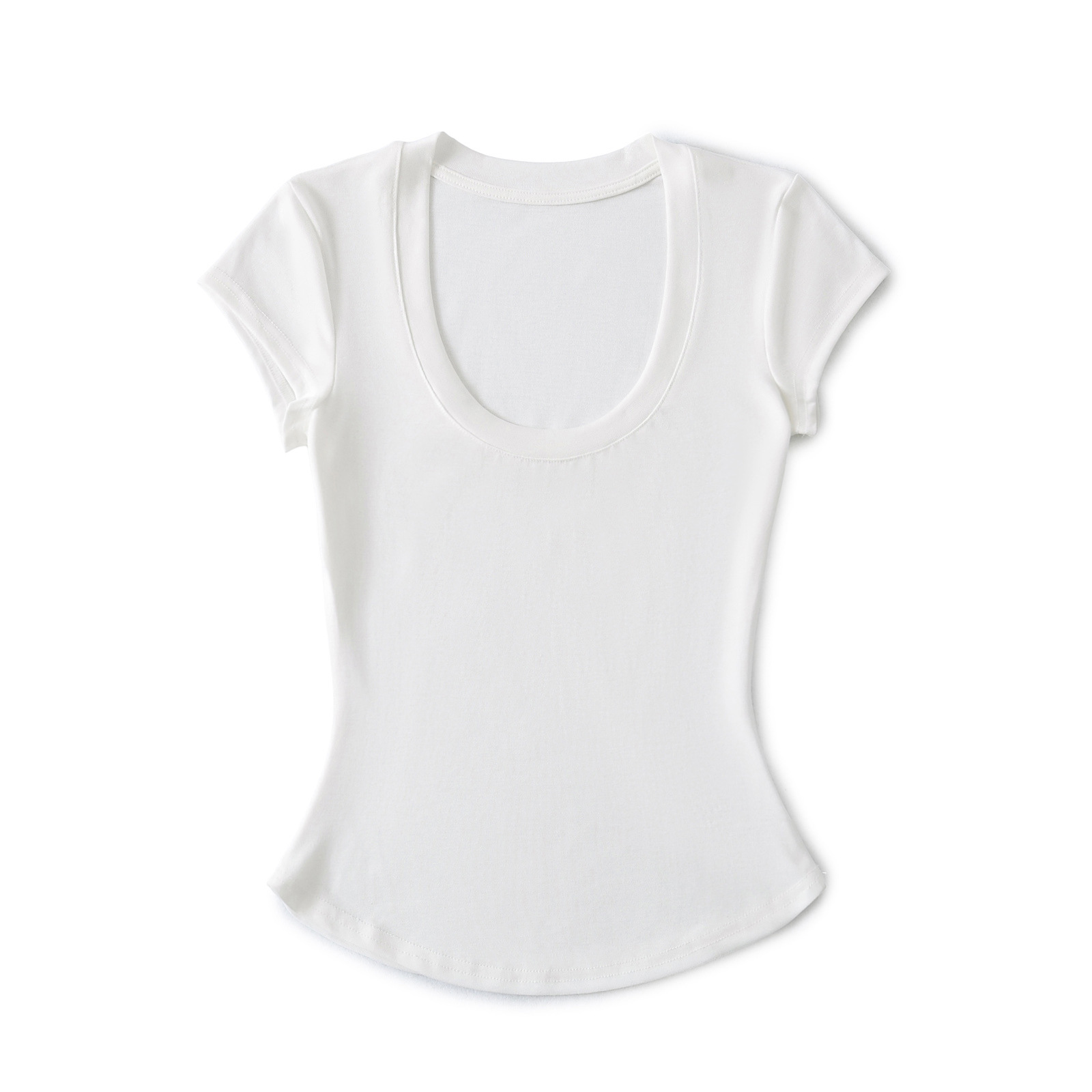 여름 2025 새로운 스타일 스파이스 소녀 슬림 핏 텐셀 U 칼라 반팔 티셔츠 여성용 타이트 허리 슬리밍 솔리드 컬러 탑 타이트베이스 셔츠