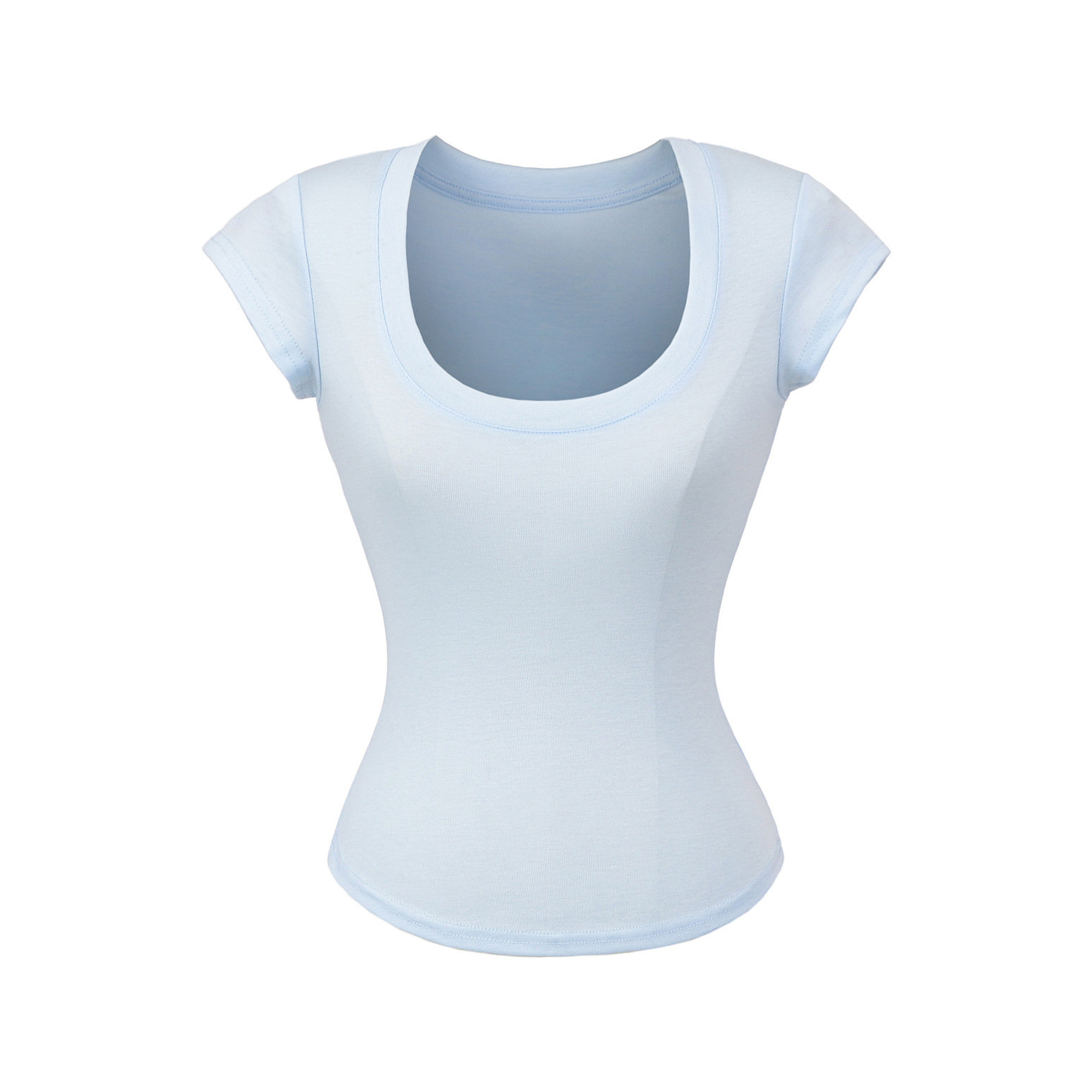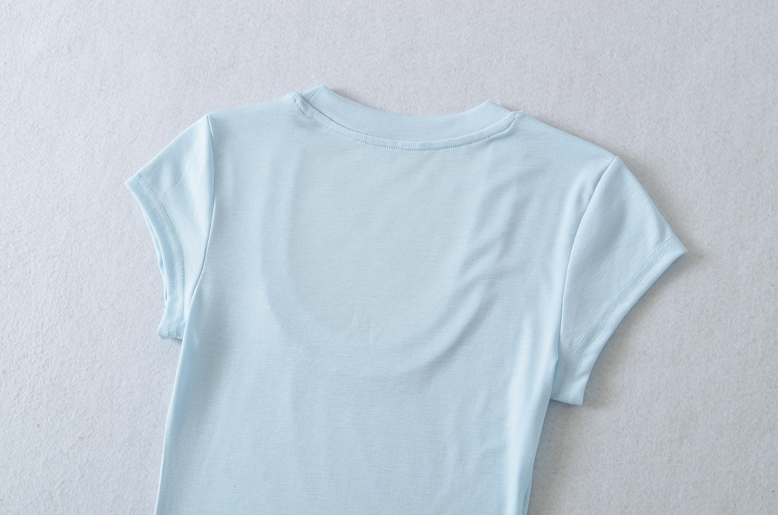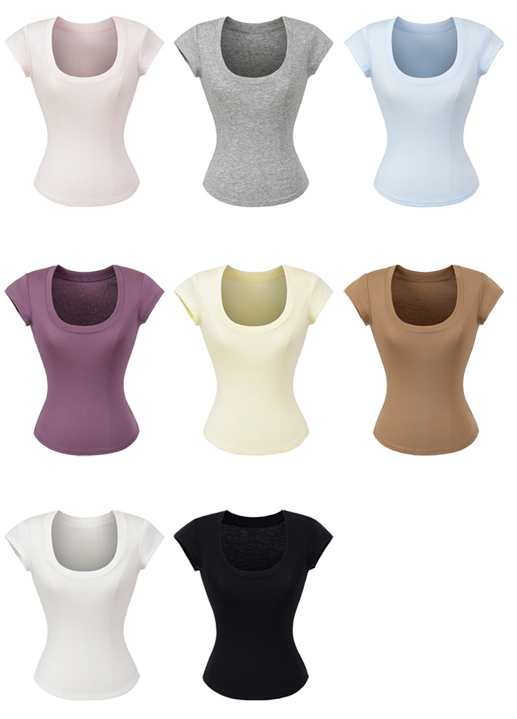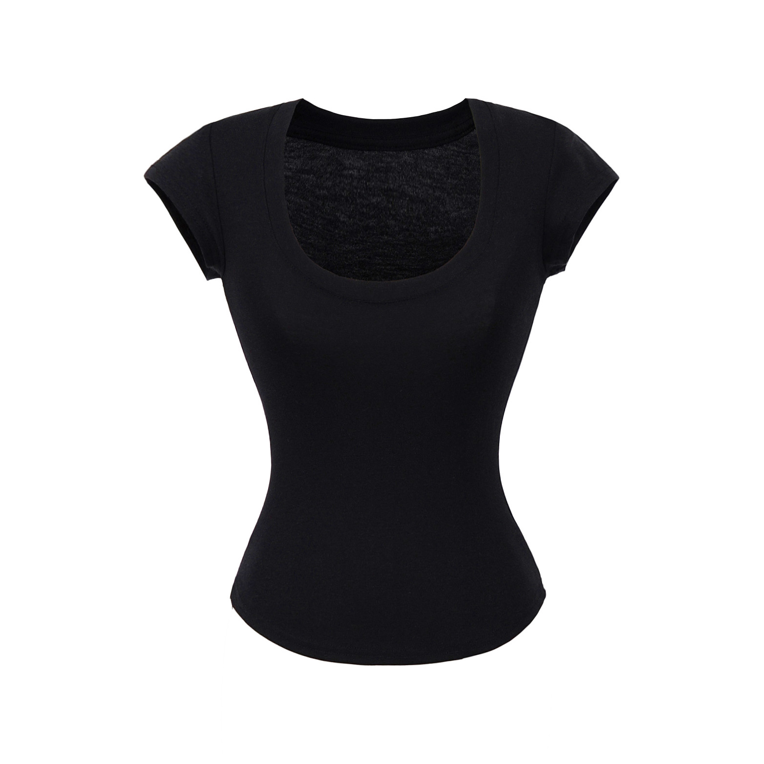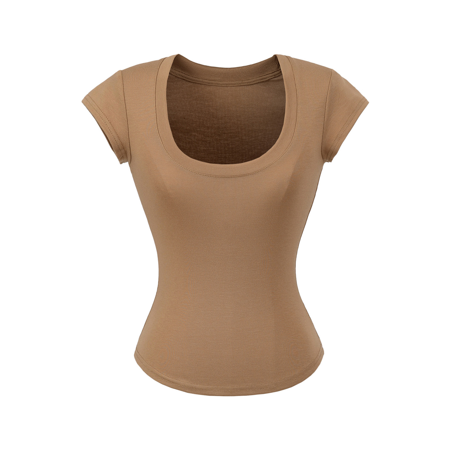 여름 2025 새로운 스타일 스파이스 소녀 슬림 핏 텐셀 U 칼라 반팔 티셔츠 여성용 타이트 허리 슬리밍 솔리드 컬러 탑 타이트베이스 셔츠