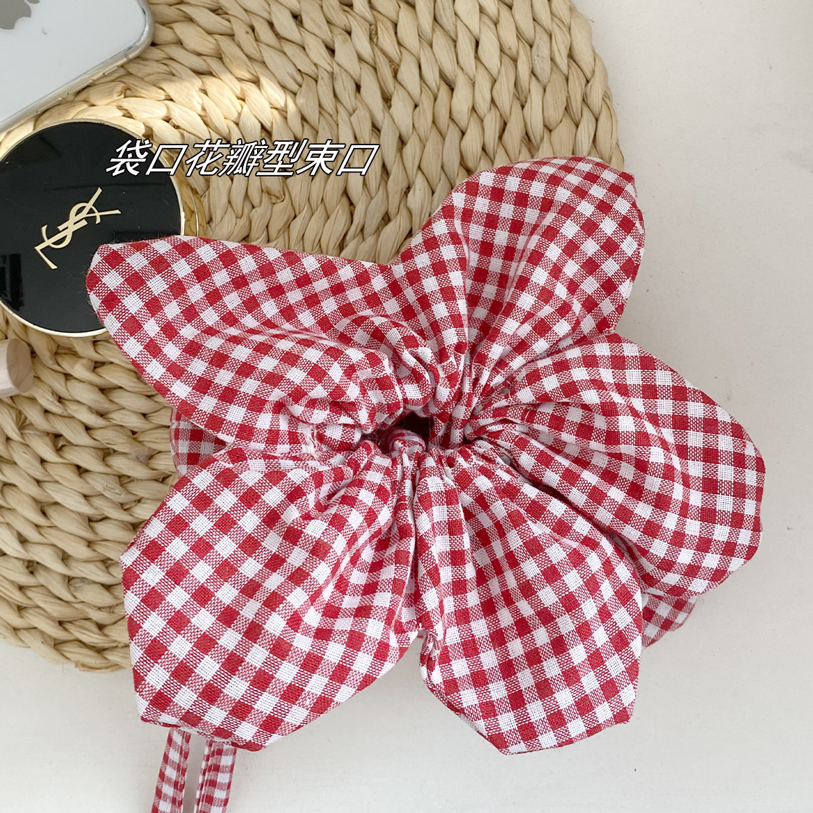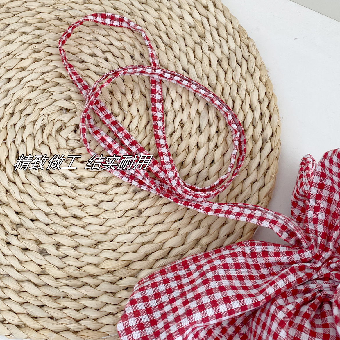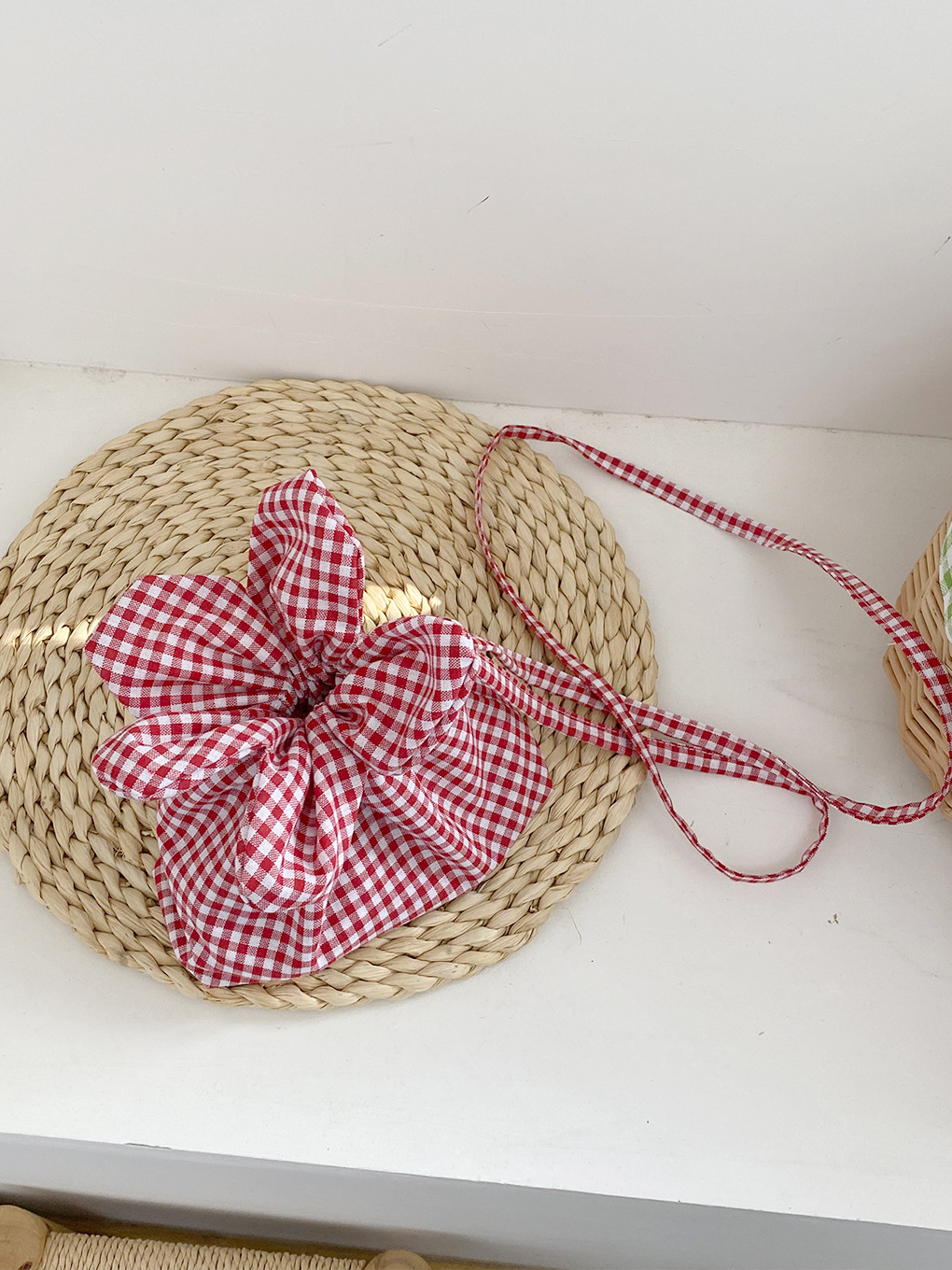 • 크로스바디 드로스트링 플라워 백 - 레드 체크 무늬