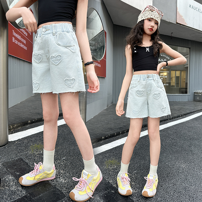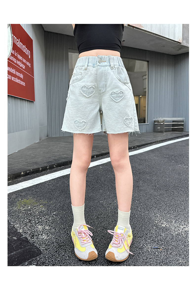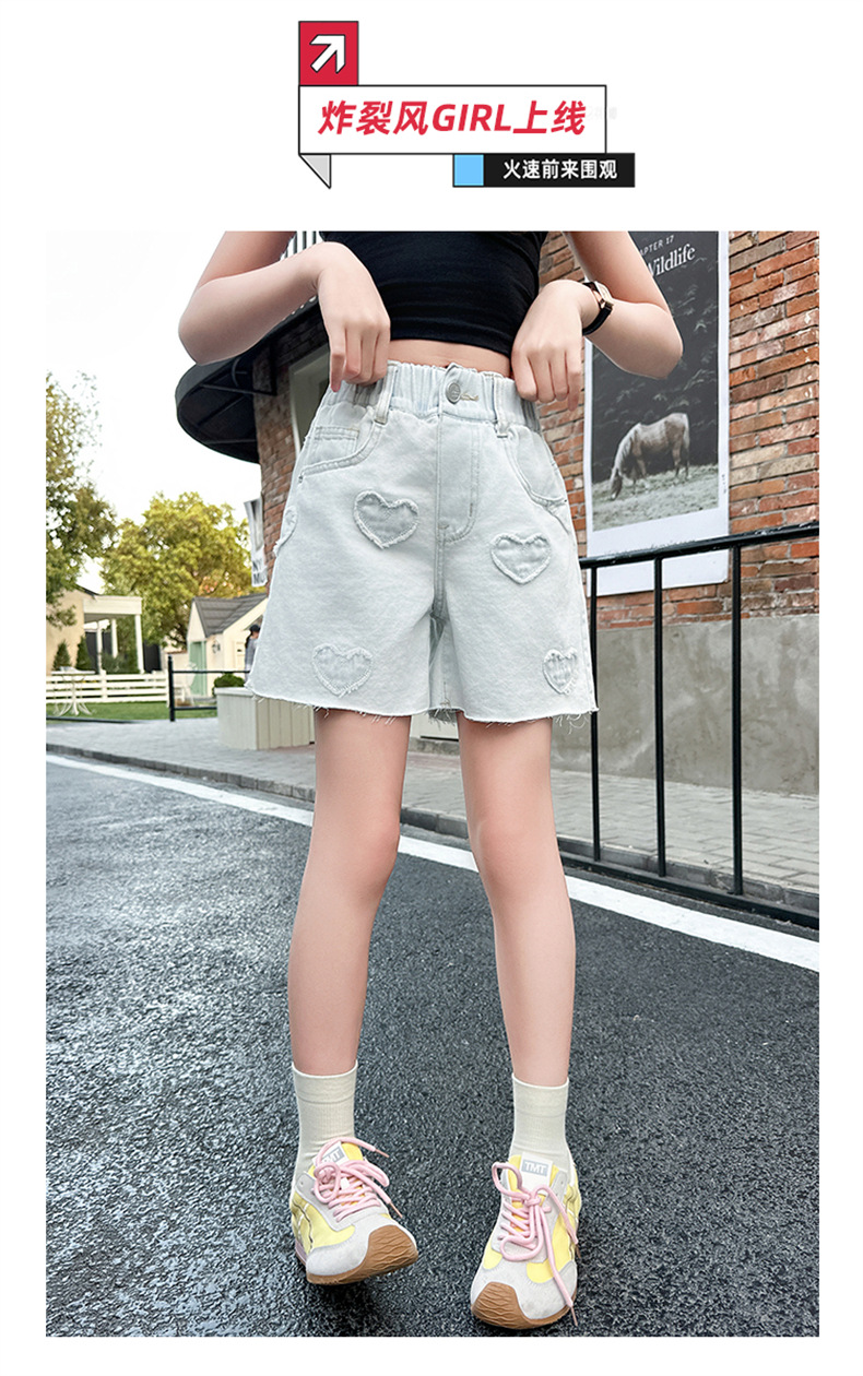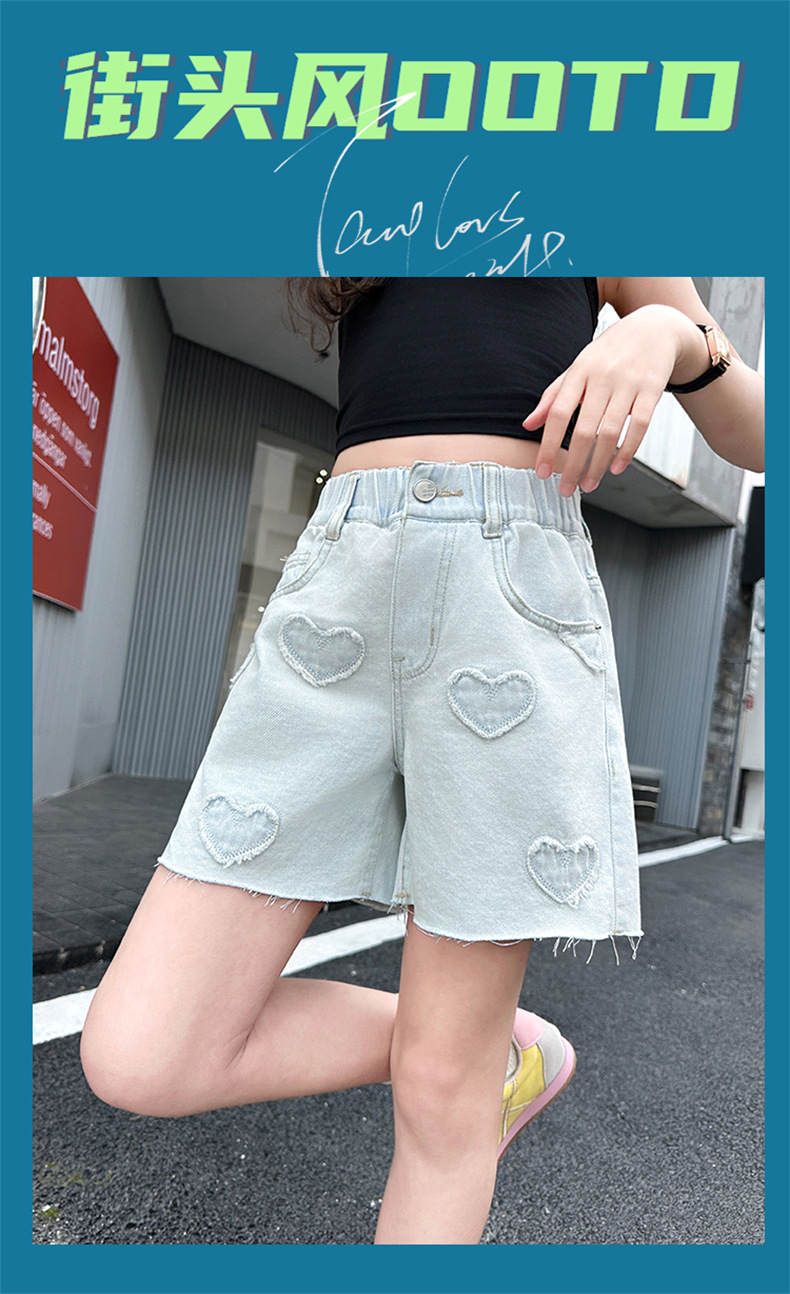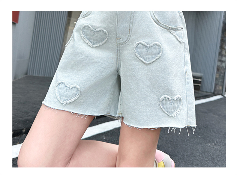 여자 여름 데님 반바지 2025 새로운 패션 여자 한국 스타일 중대형 어린이 스타일 사랑 패치 외부 바지스토어 가기