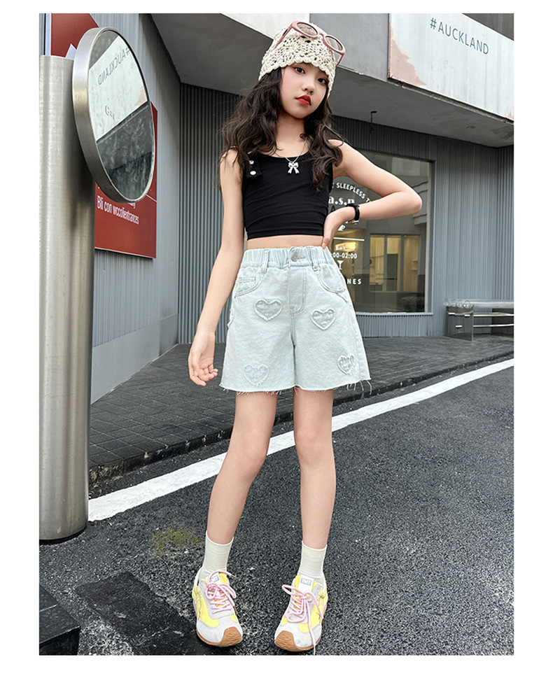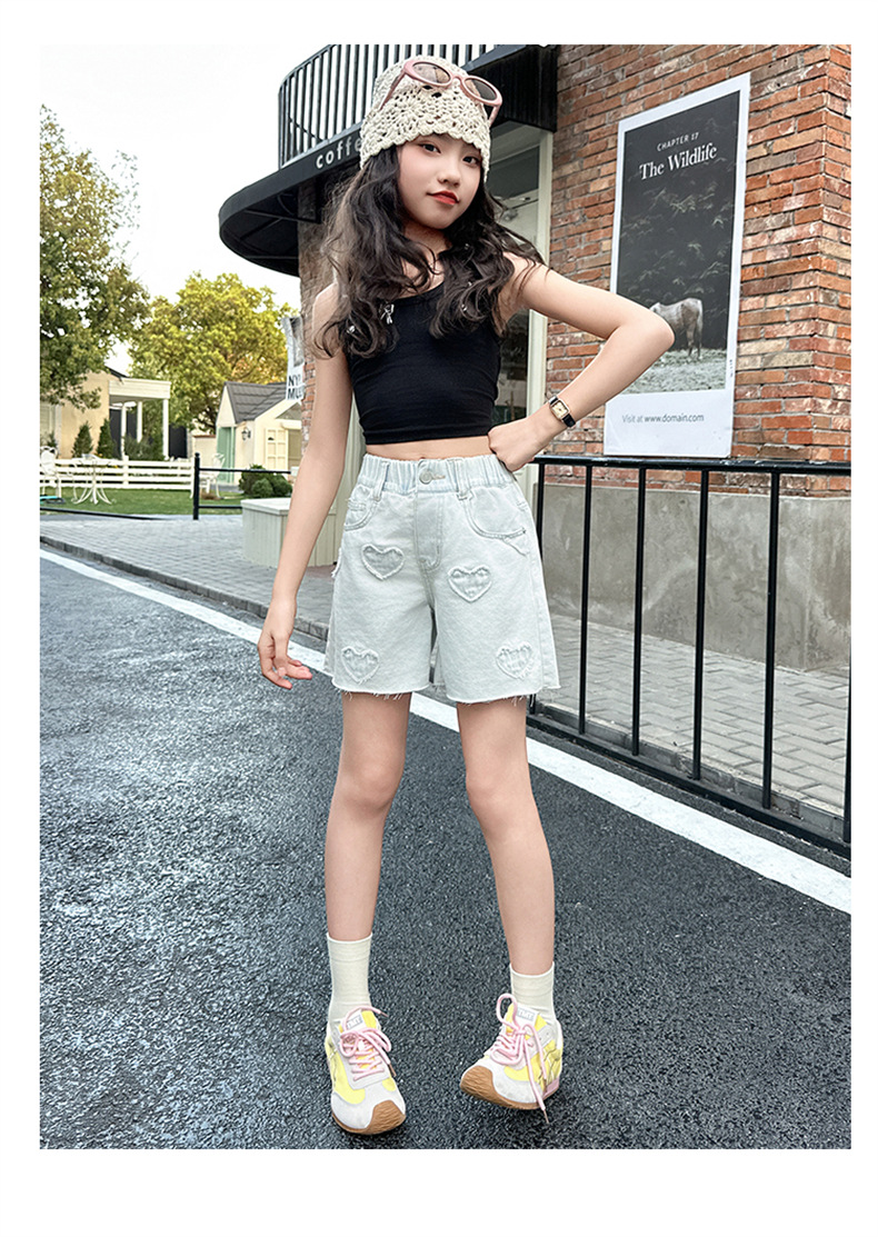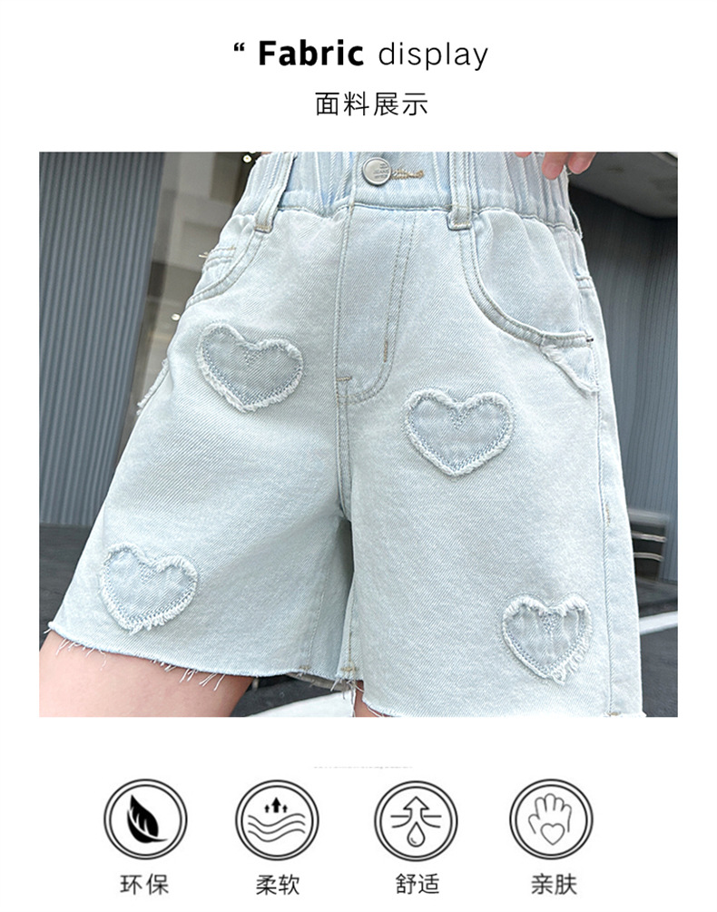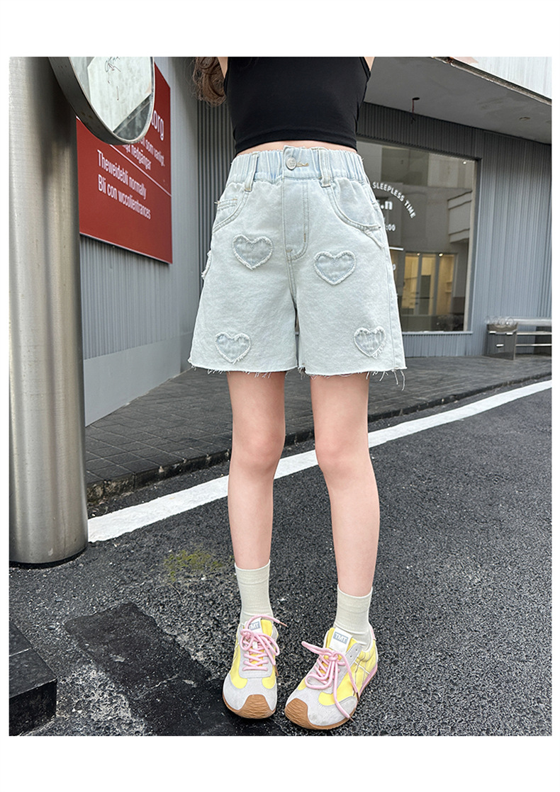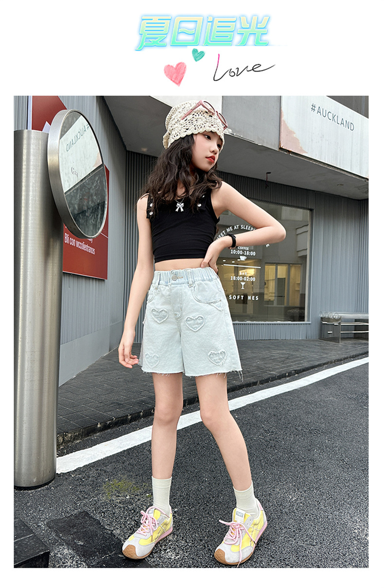 여자 여름 데님 반바지 2025 새로운 패션 여자 한국 스타일 중대형 어린이 스타일 사랑 패치 외부 바지스토어 가기