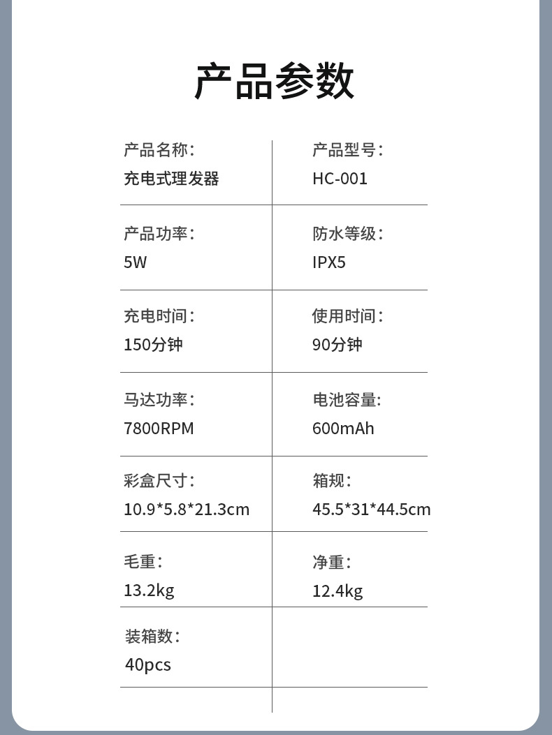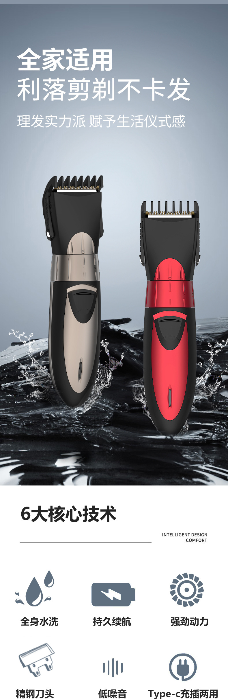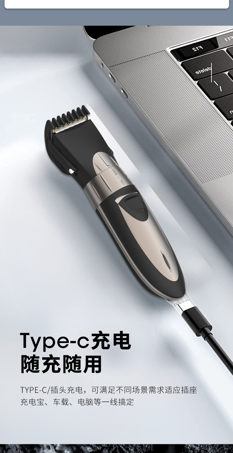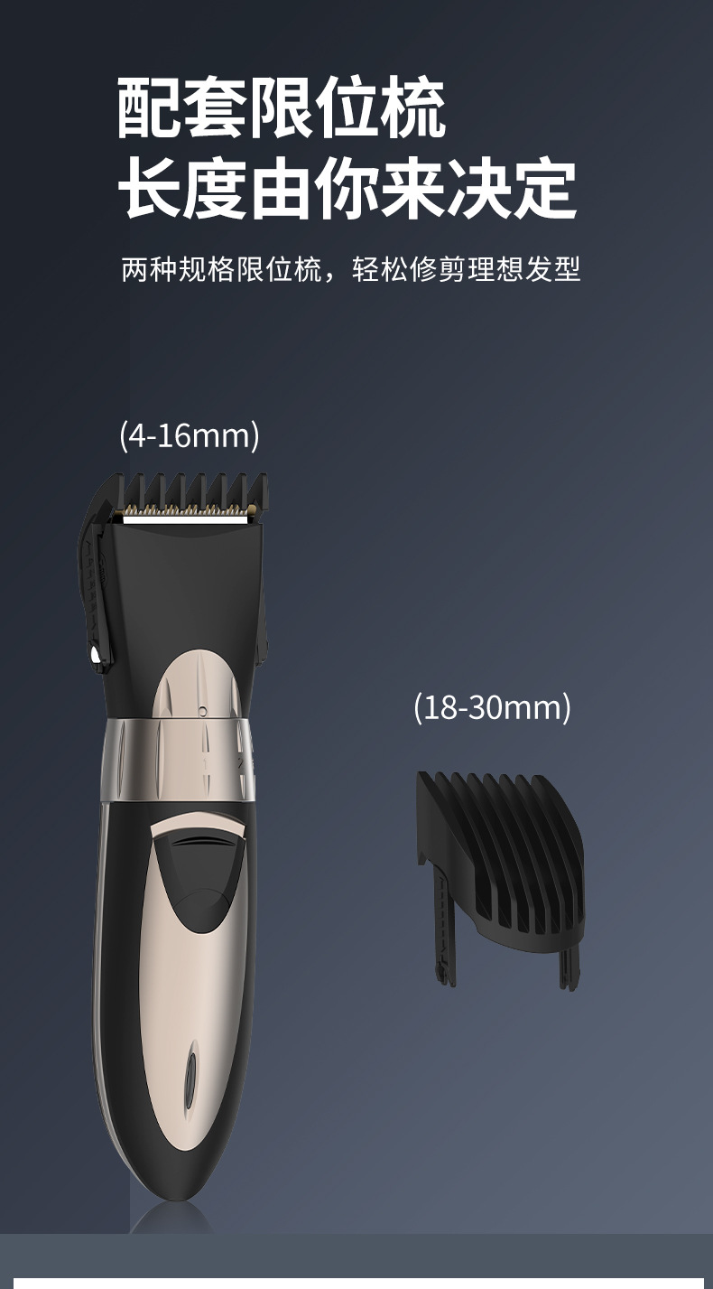 配件:理发器*1 限位梳*2 (4-16 mm 18-30mm) 清洁刷*1 油瓶*1 type-c充电线*1 梳子*1