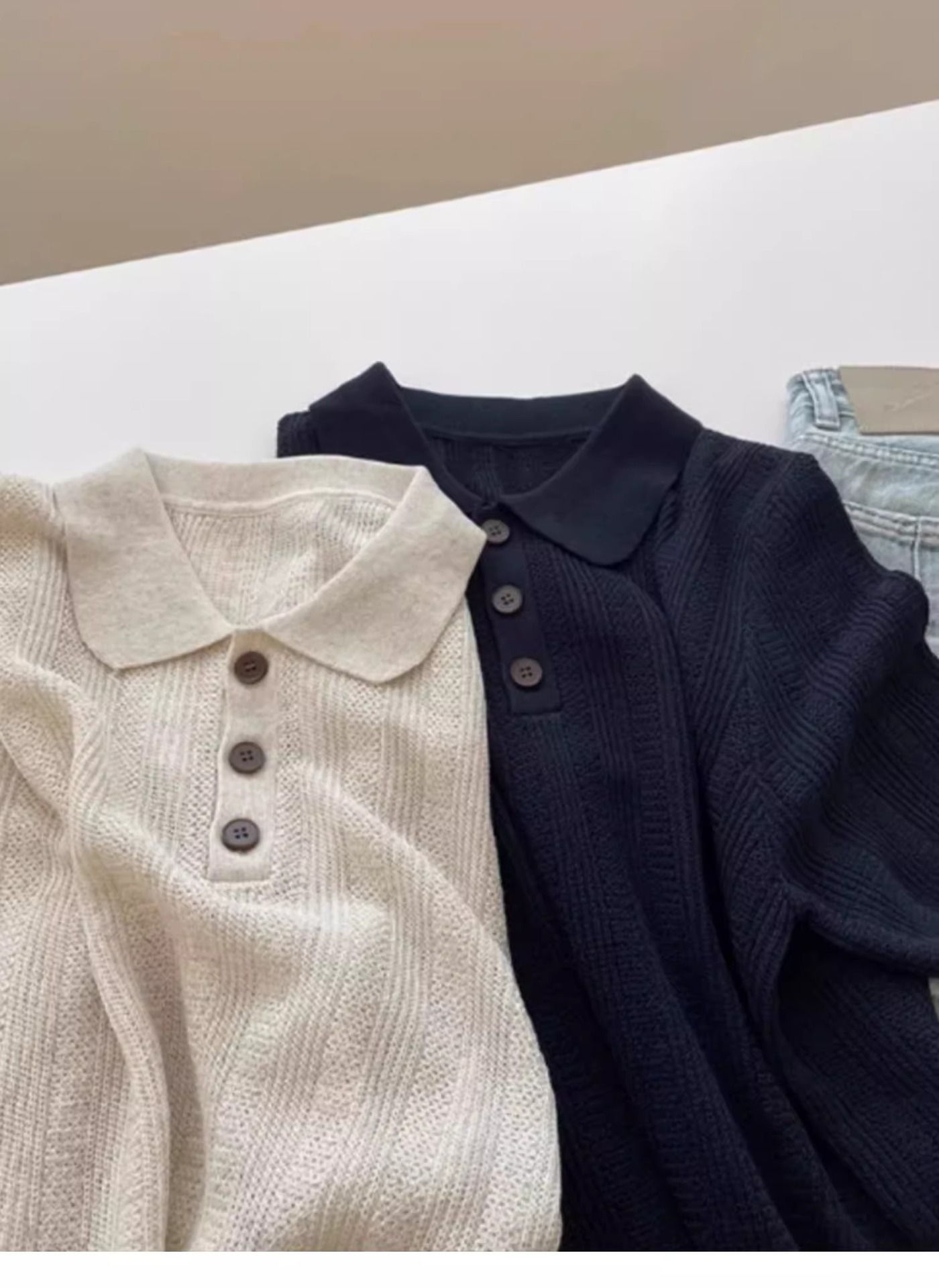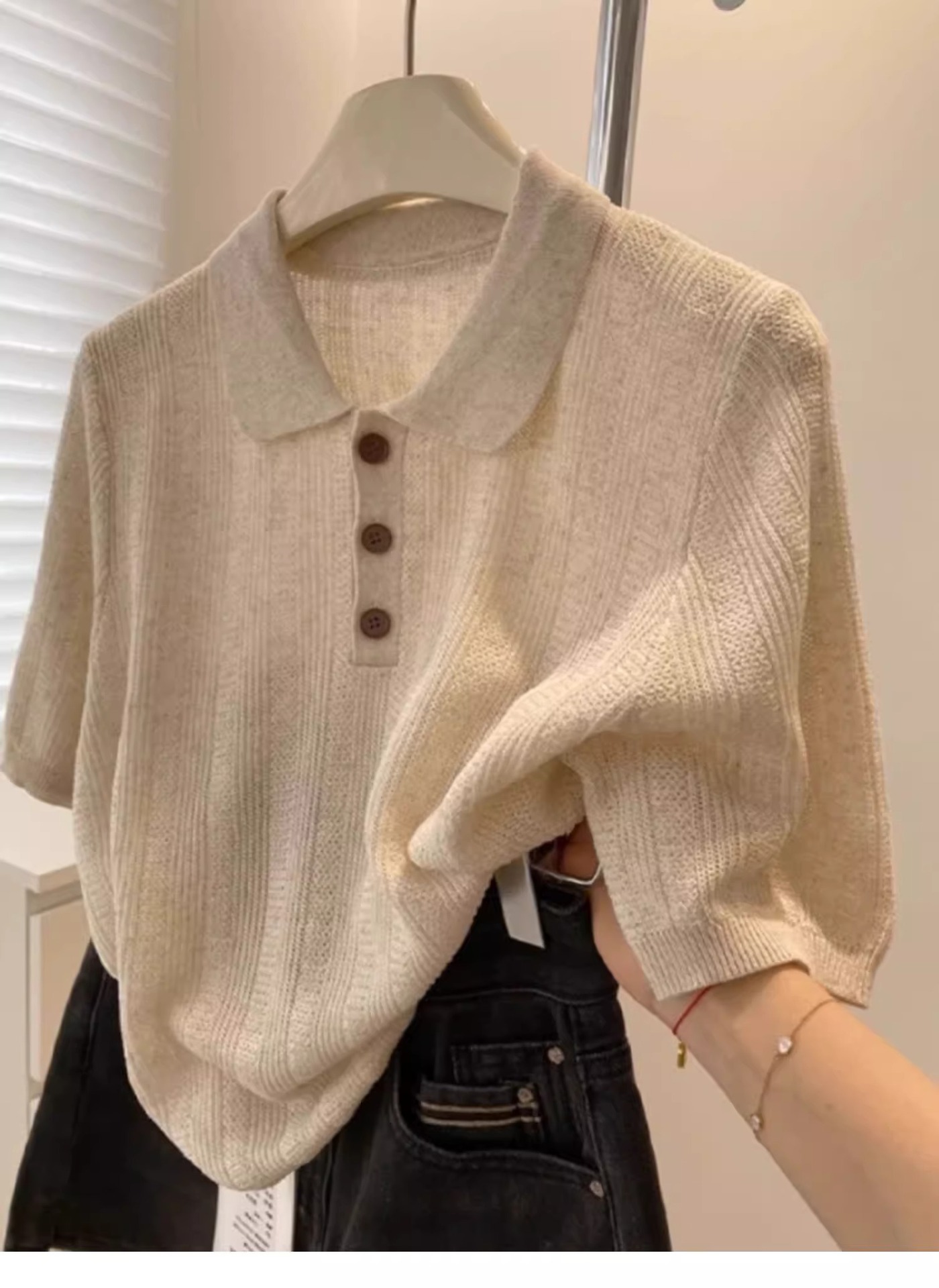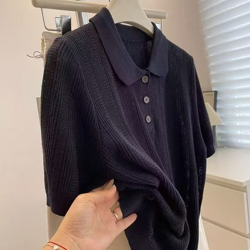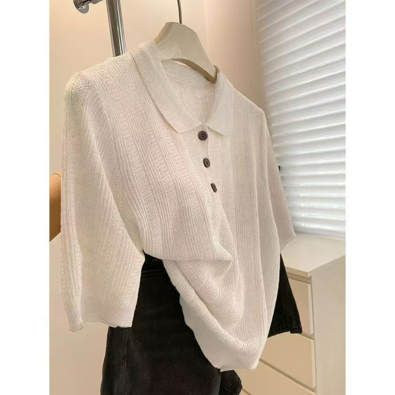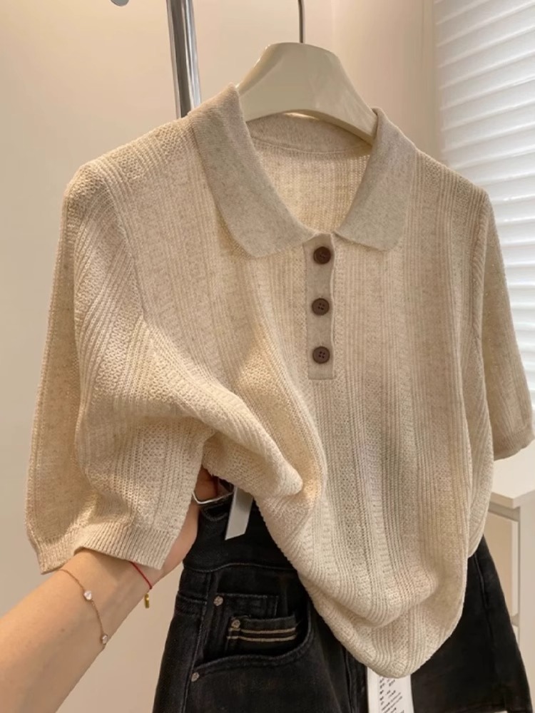 고급 오트밀 폴로 칼라 어깨 니트 아이스 실크 반팔 티셔츠 여성용 여름 루즈 싱글웨어 좋은 탑스토어 가기