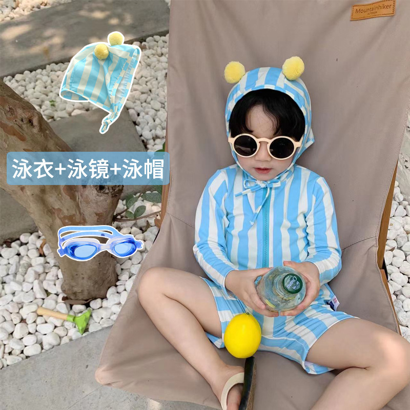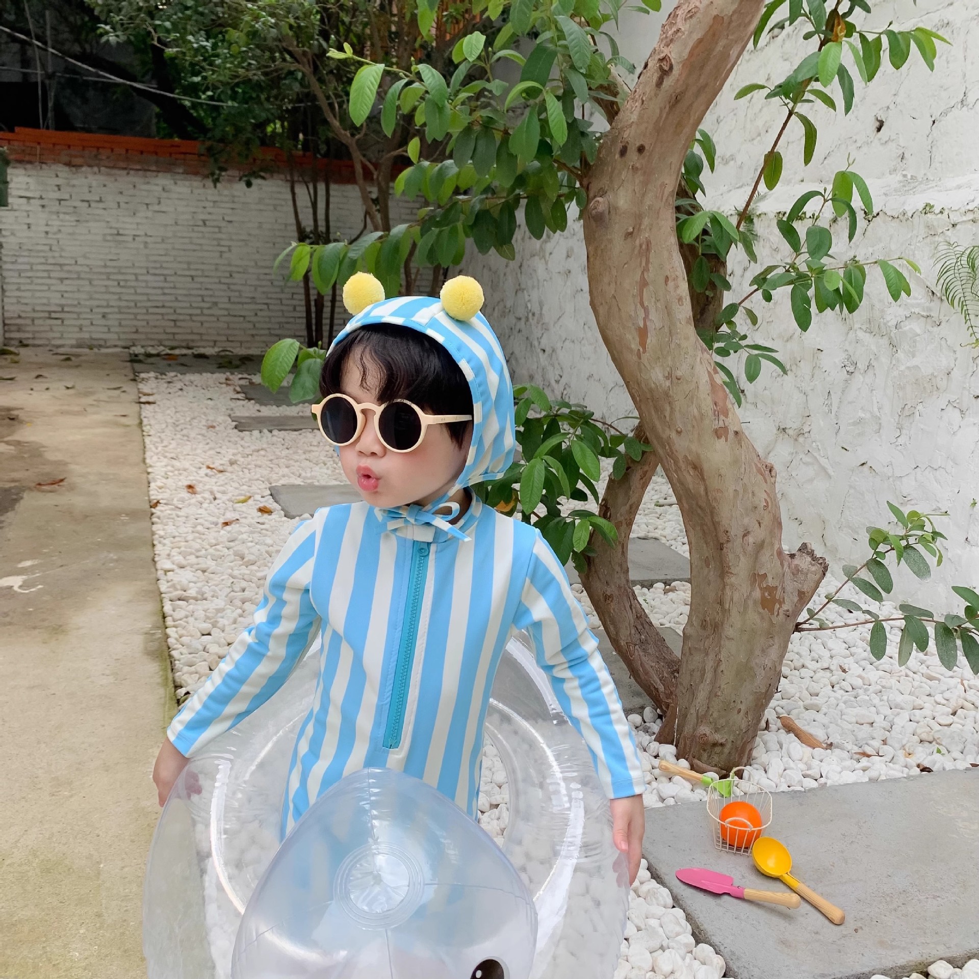 여름 어린이 긴팔 자외선 차단 수영복 스트라이프 원피스 수영복 남성과 여성 아기 해변 수영 속건 의류 유행