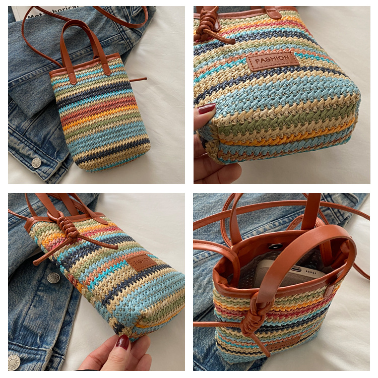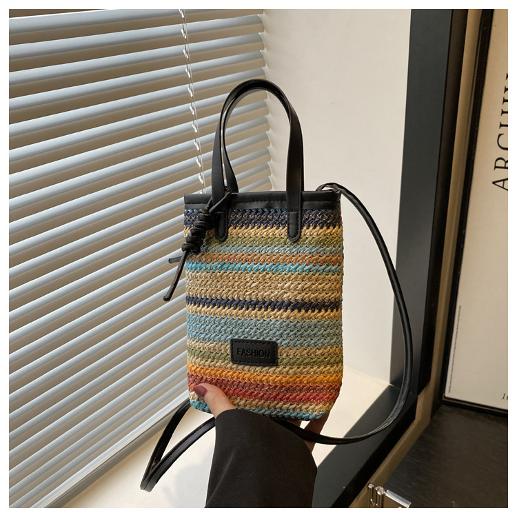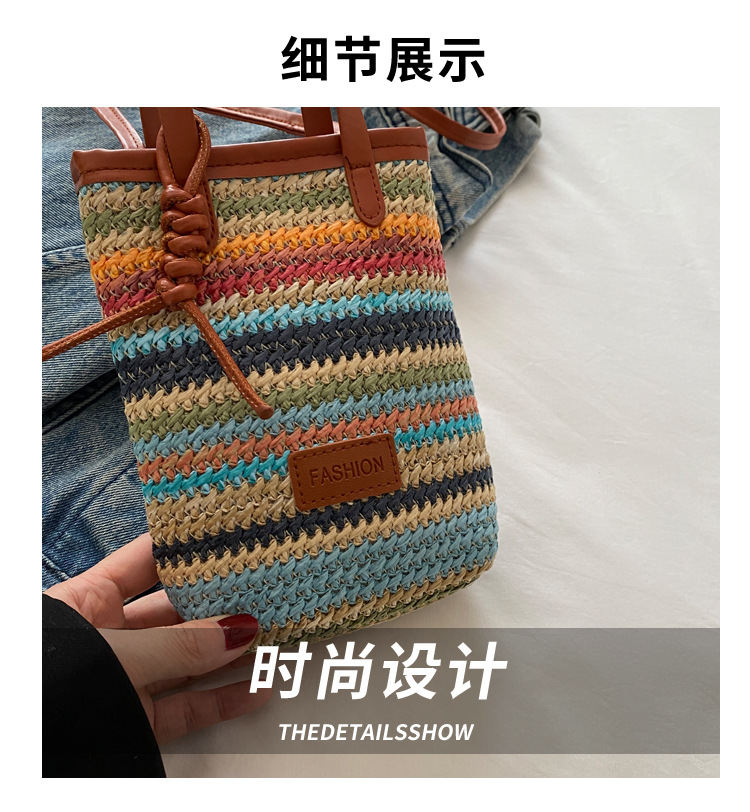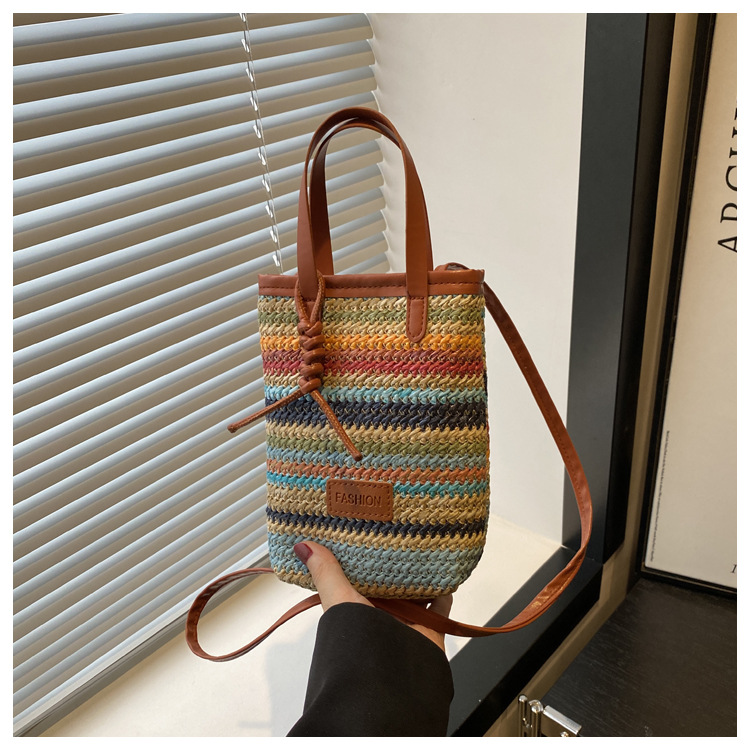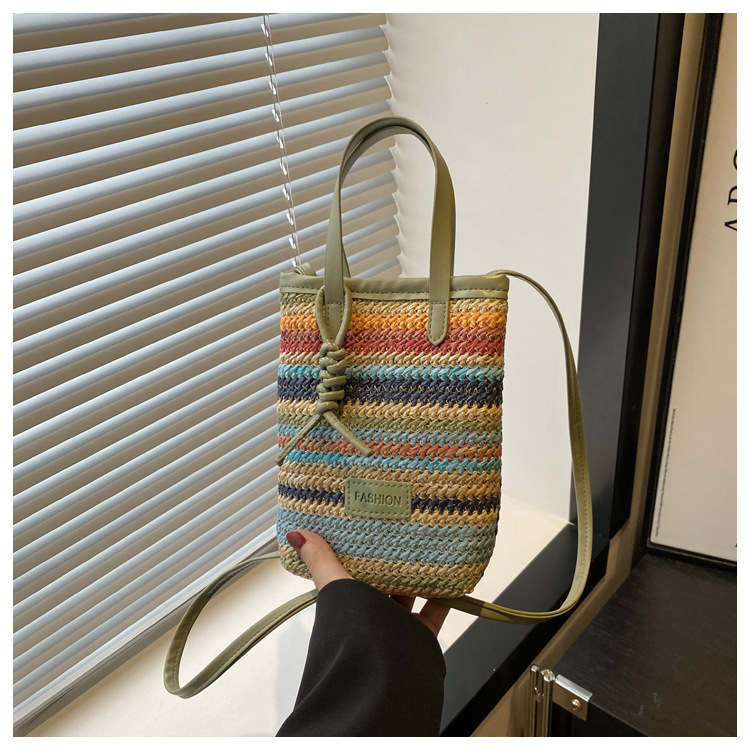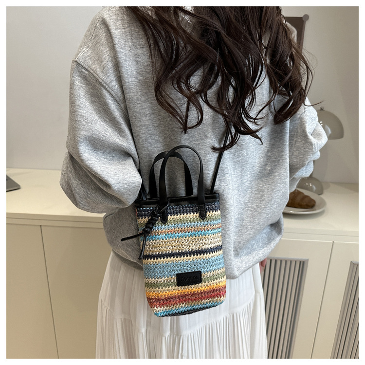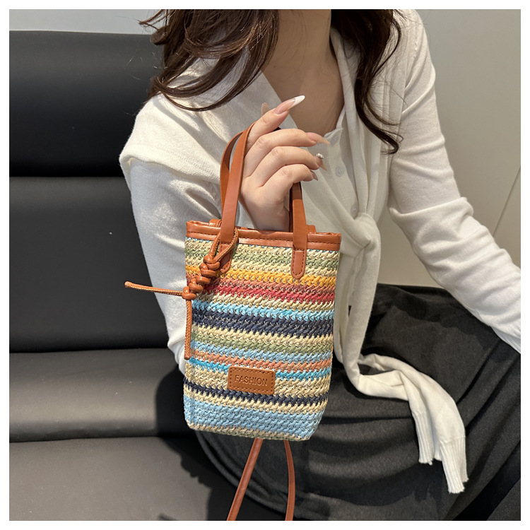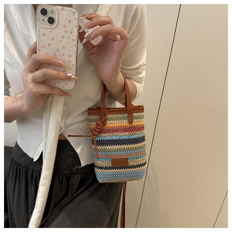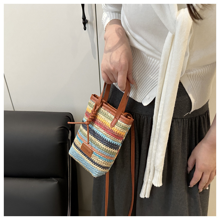 명암 컬러 짠 가방 여성 2025 여름 새로운 유행 유행 밀짚 휴대 전화 가방 한국 틈새 간단한 크로스 바디 백스토어 가기