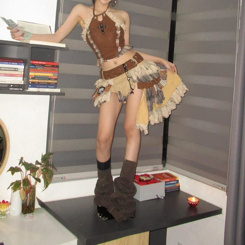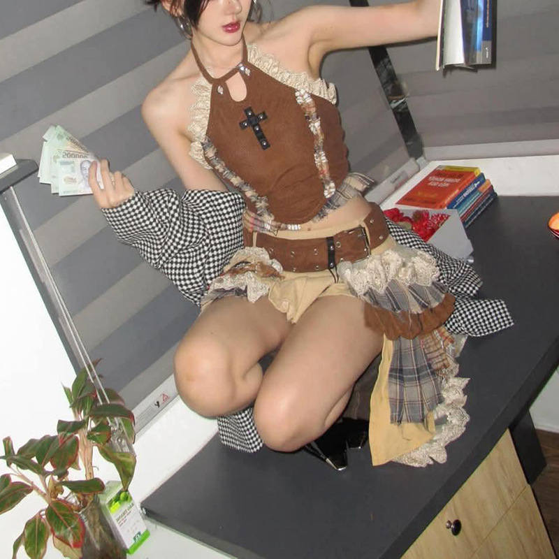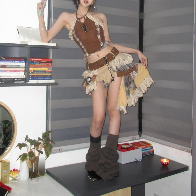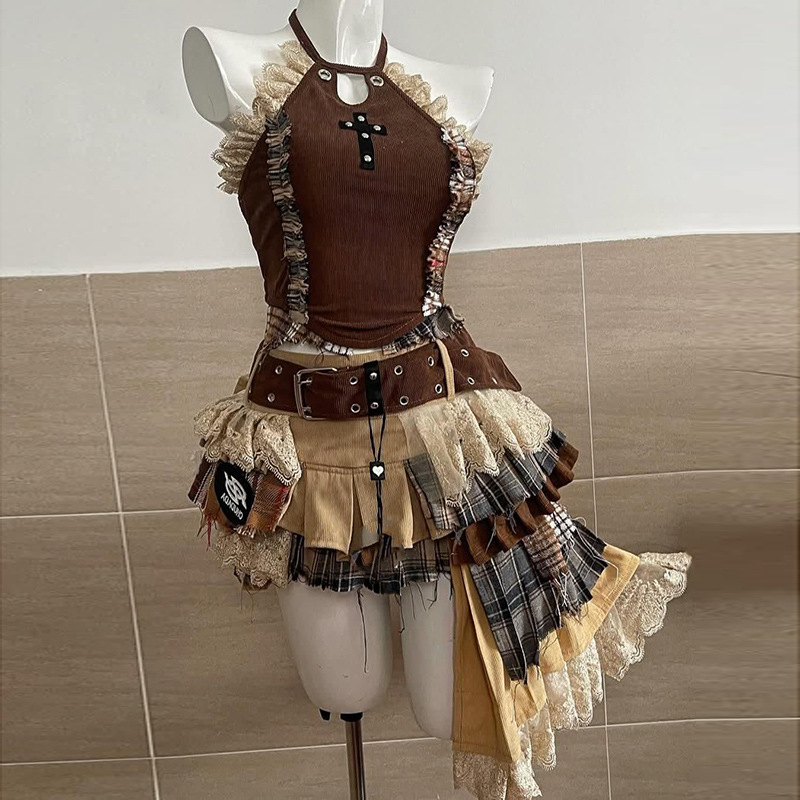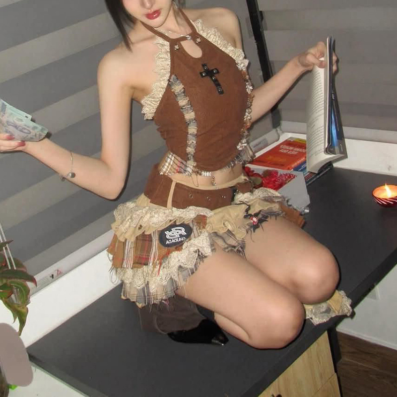 여성을위한 레트로 달콤하고 매운 스플 라이스 레이스 슈트 여름 홀터넥 슬림 탑 불규칙한 슬리밍 퍼프 스커트 투피스 세트스토어 가기