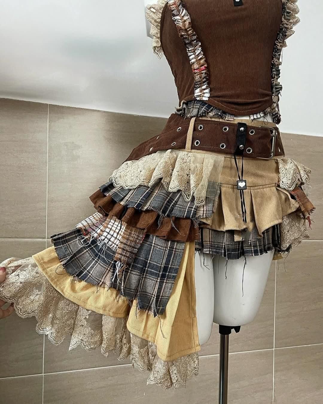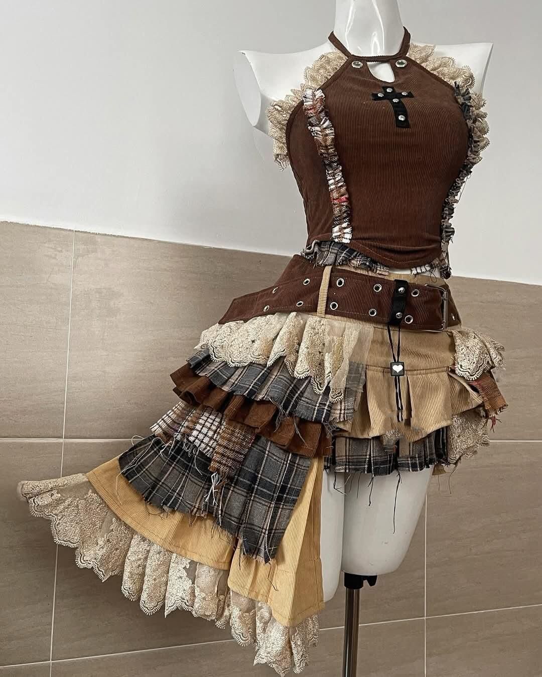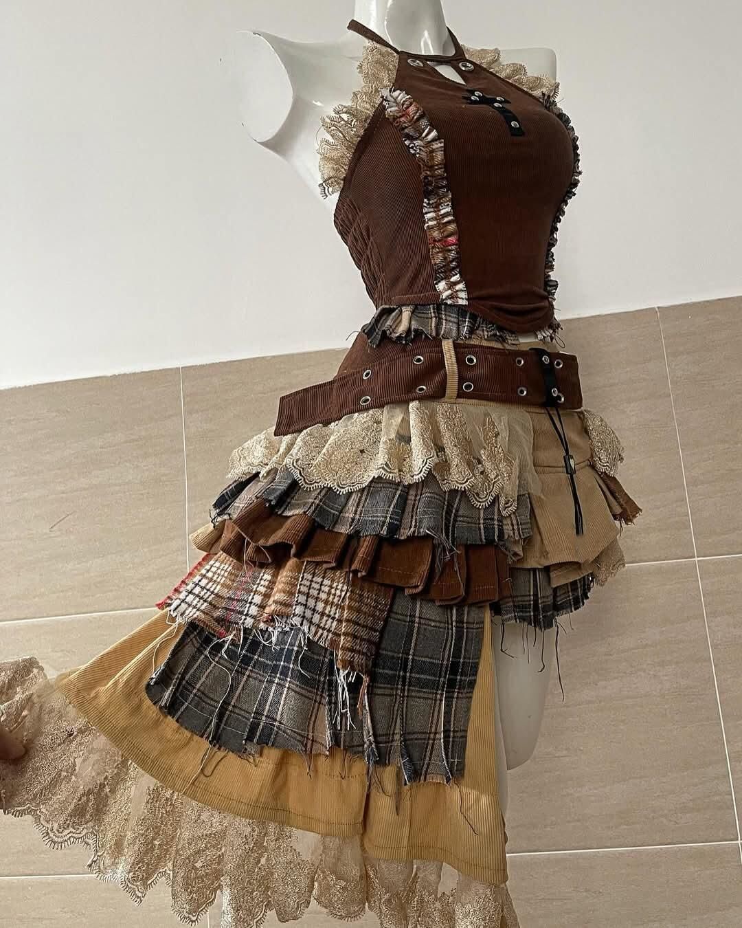 여성을위한 레트로 달콤하고 매운 스플 라이스 레이스 슈트 여름 홀터넥 슬림 탑 불규칙한 슬리밍 퍼프 스커트 투피스 세트스토어 가기