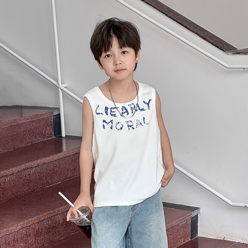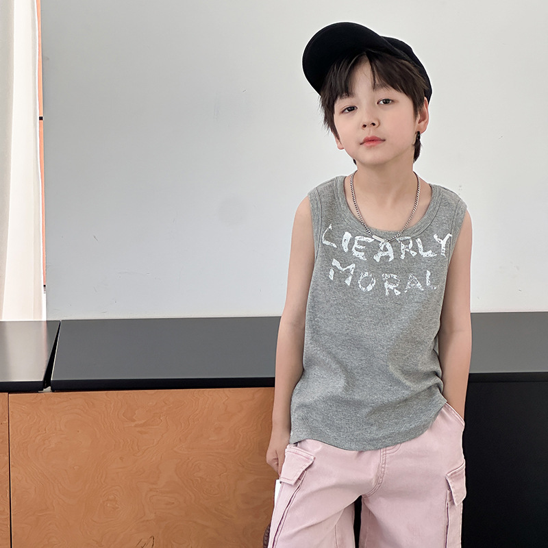 Emo Beibei 어린이 잘 생긴 편지 높은 탄성 구덩이 면 통기성 조끼 소년 2025 여름 올 매치 민소매 정상스토어 가기