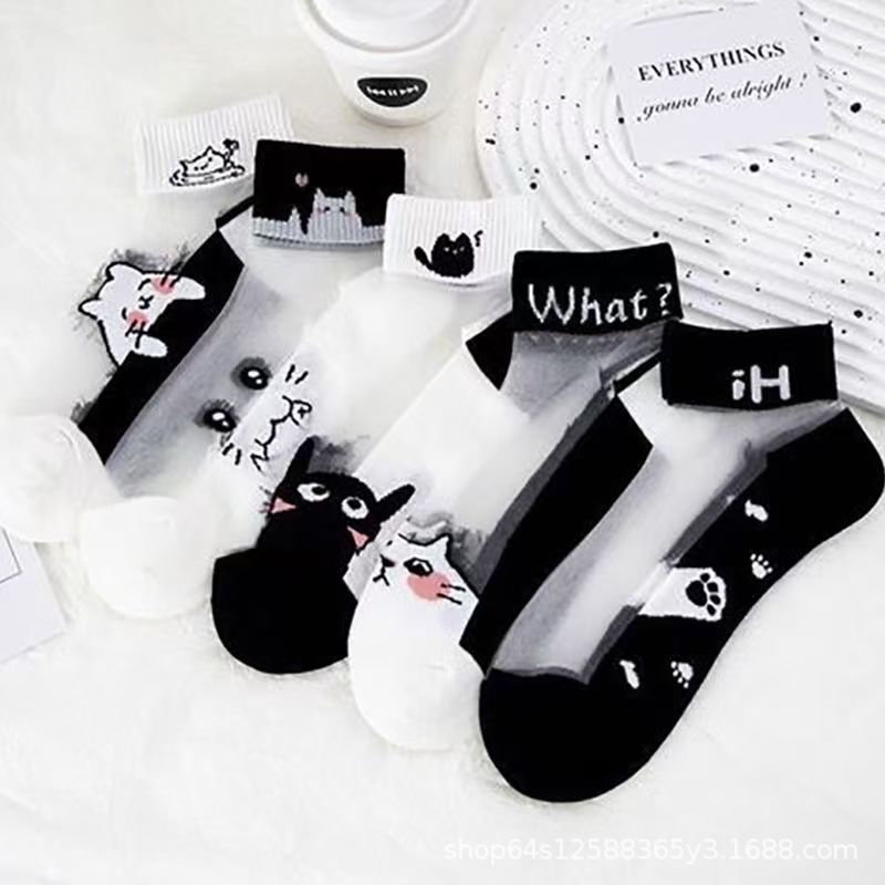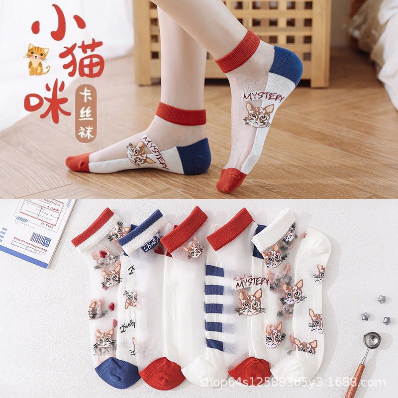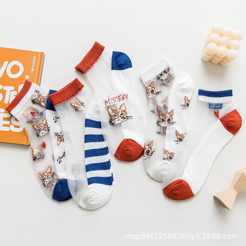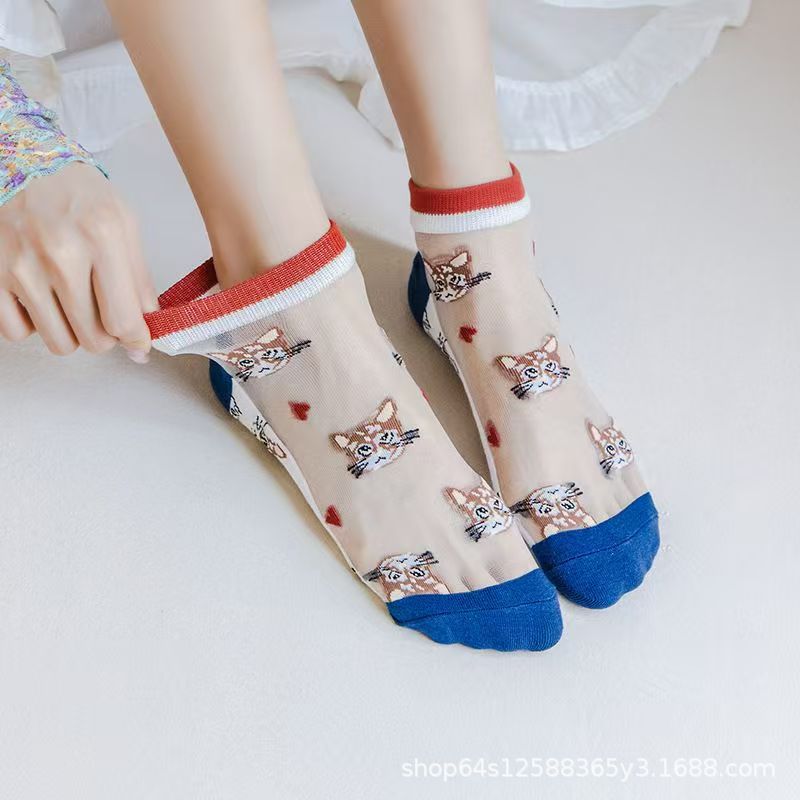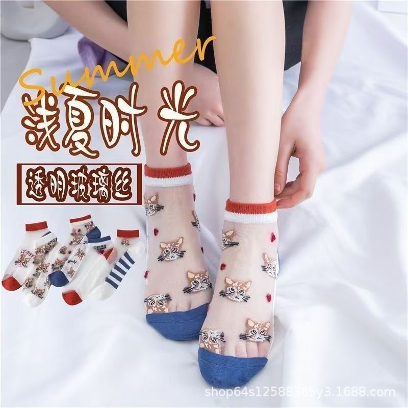 여성을위한 새로운 여름 얇은 유리 실크 양말 트렌디 한 다목적 귀여운 만화 새끼 고양이 짧은 양말