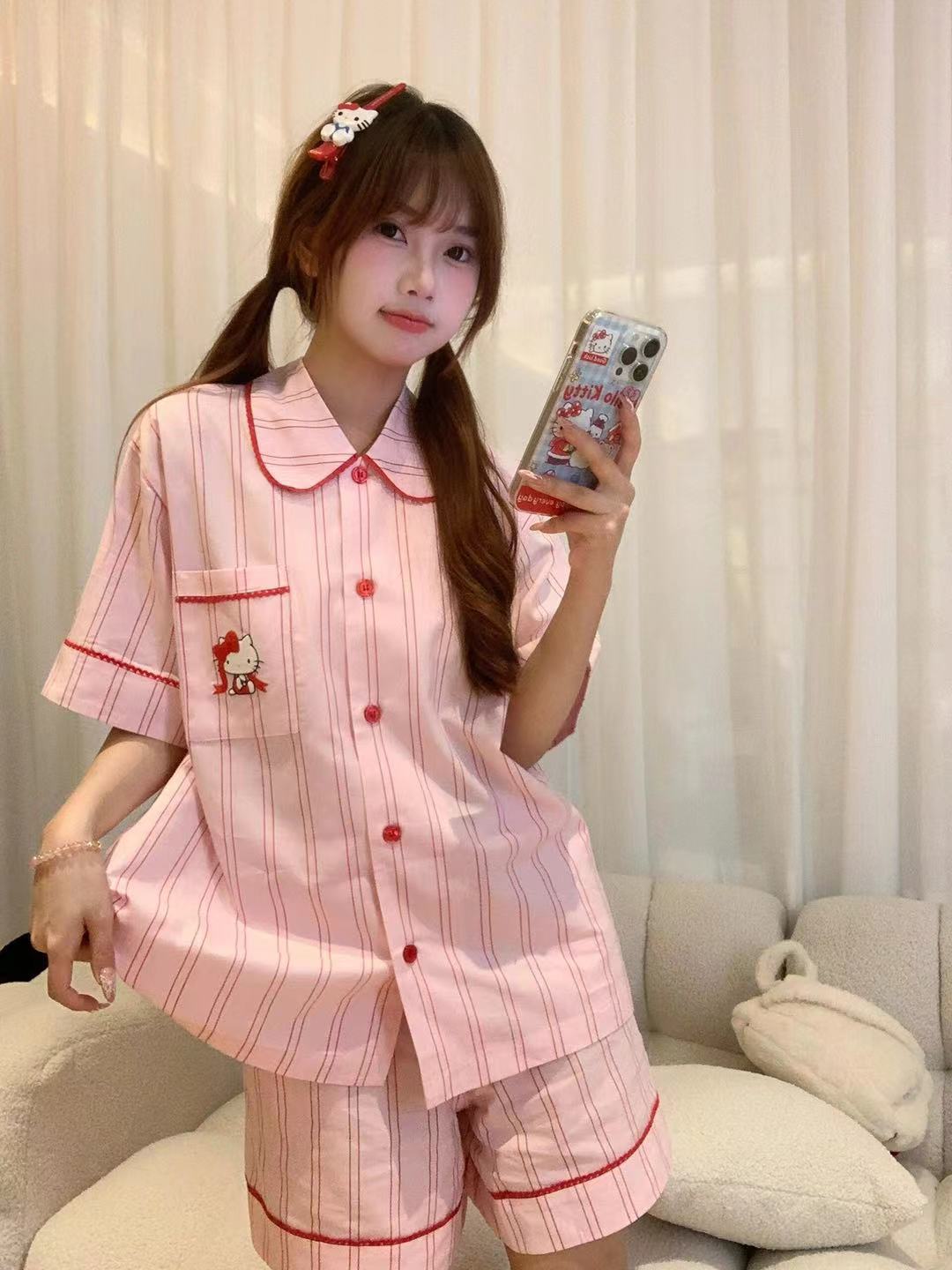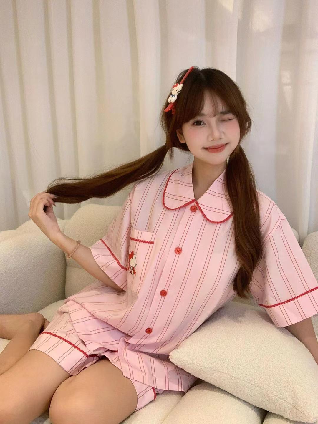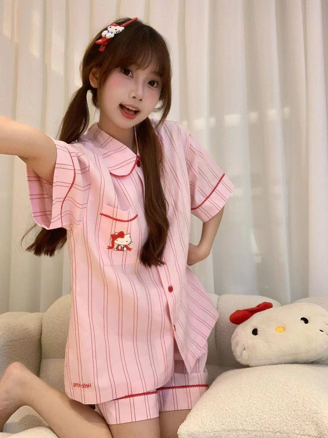 Hellokitty Tens Cotton Pajamas 여성용 여름 3 피스 반팔 바지 반바지 Girly 스타일 홈 의류 세트스토어 가기