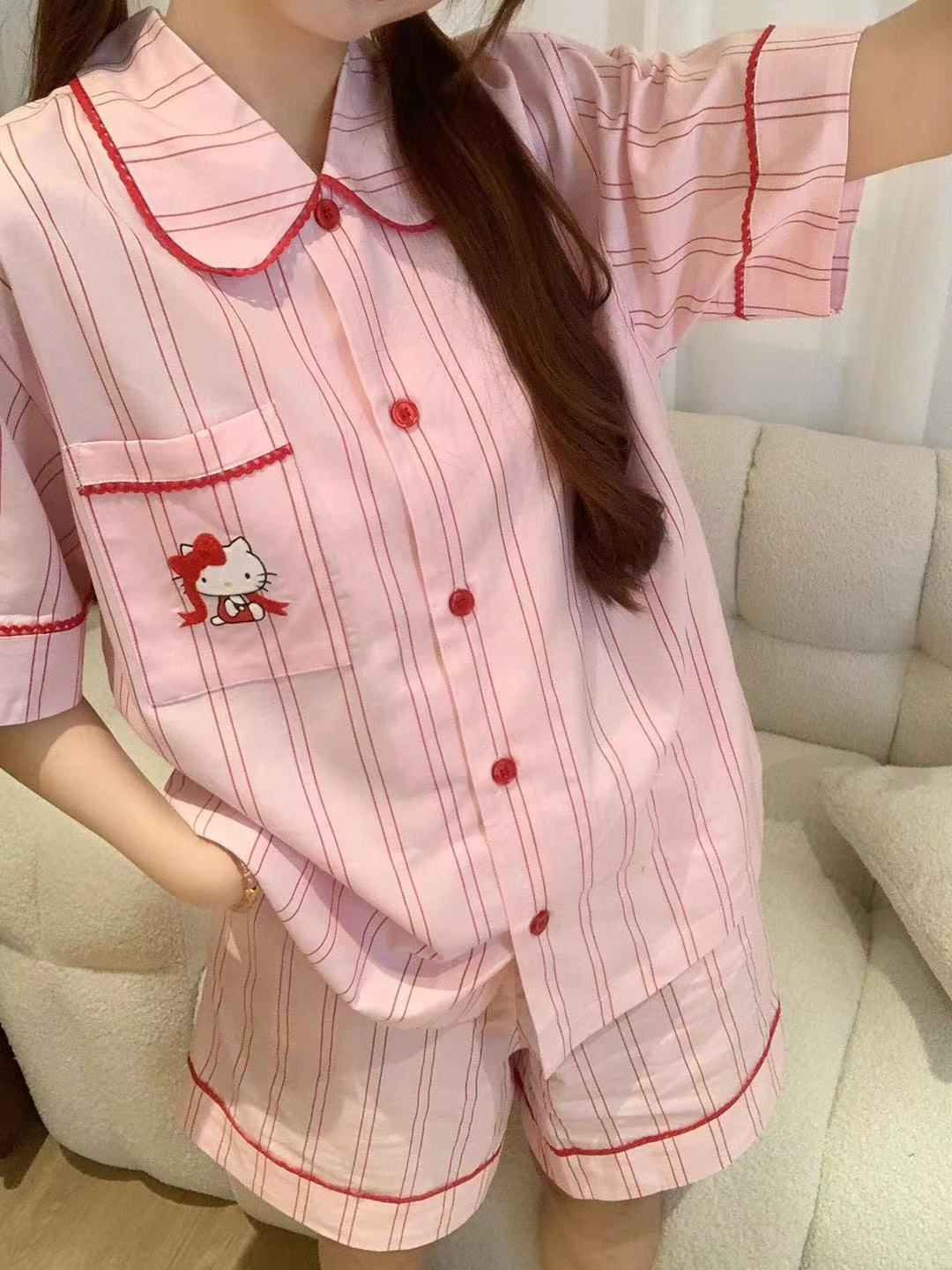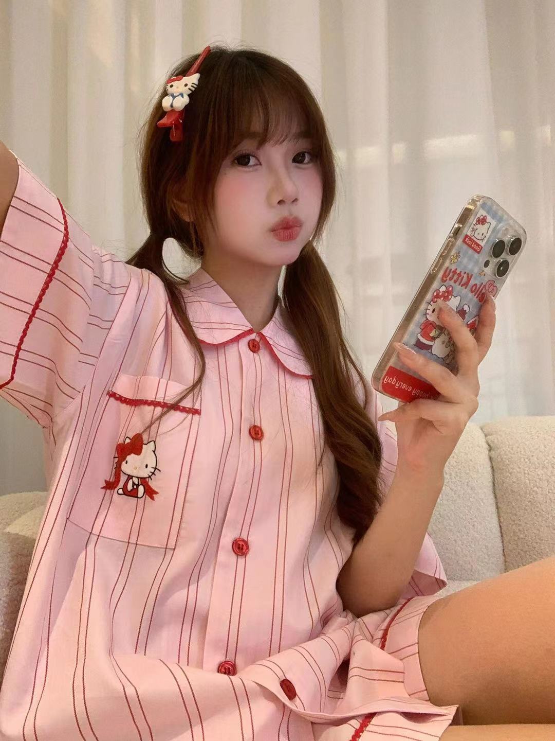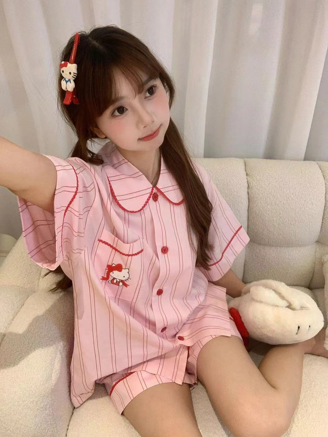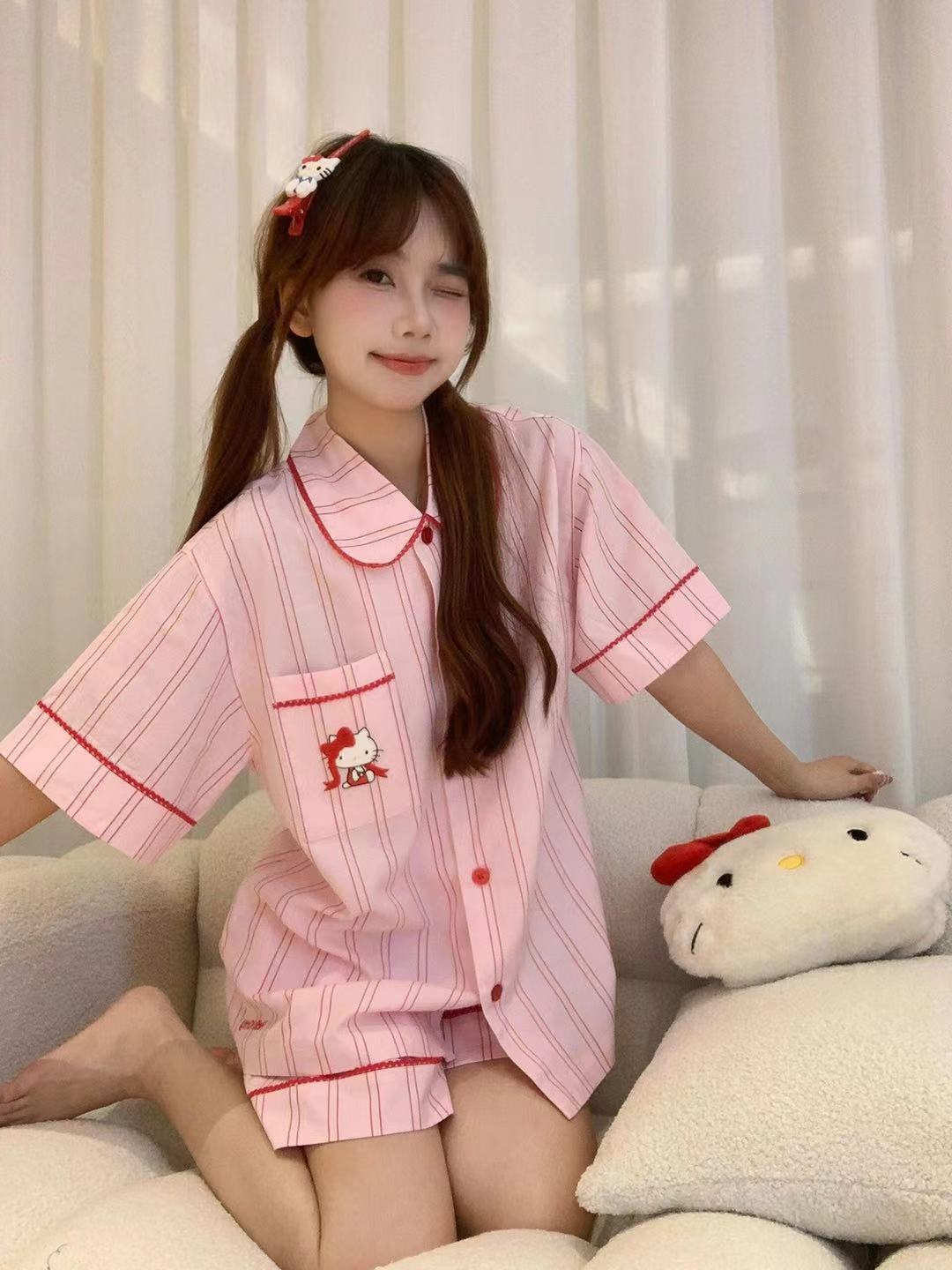 Hellokitty Tens Cotton Pajamas 여성용 여름 3 피스 반팔 바지 반바지 Girly 스타일 홈 의류 세트스토어 가기