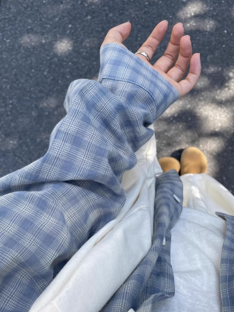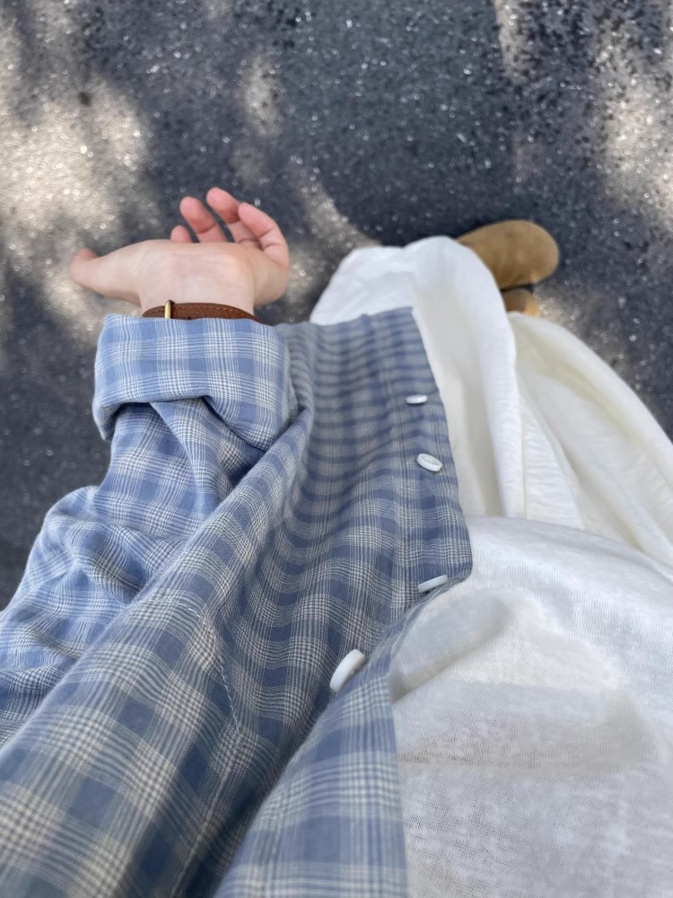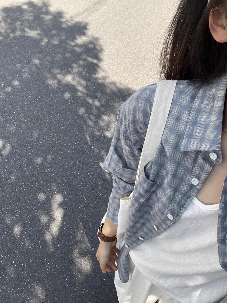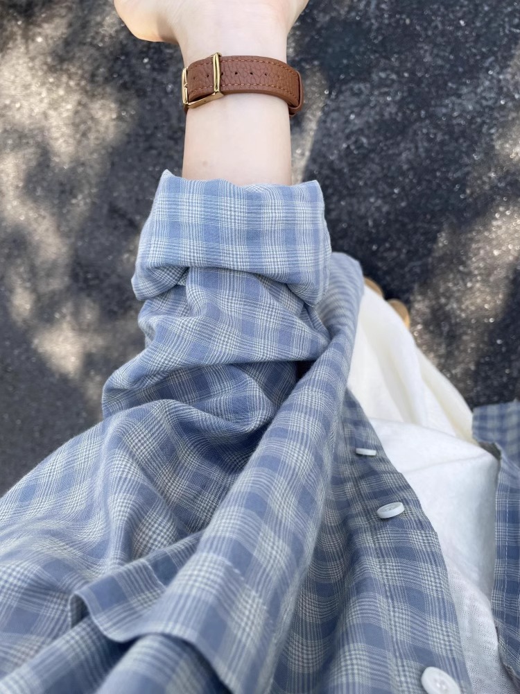 여름 여성을 위한 한국식 긴팔 파란색 격자 무늬 셔츠 새로운 느슨한 게으른 탑 다용도 자외선 차단 셔츠 셔츠 재킷스토어 가기