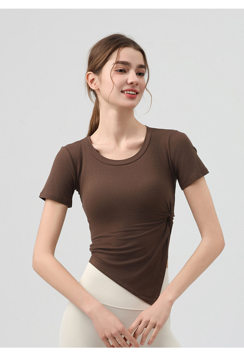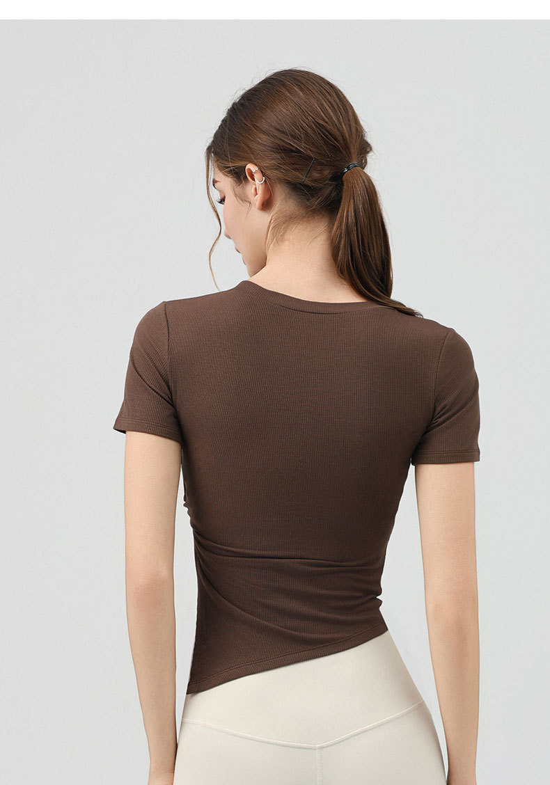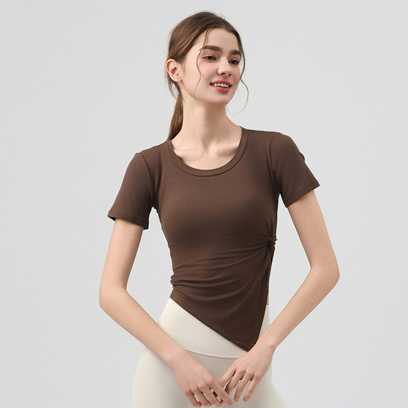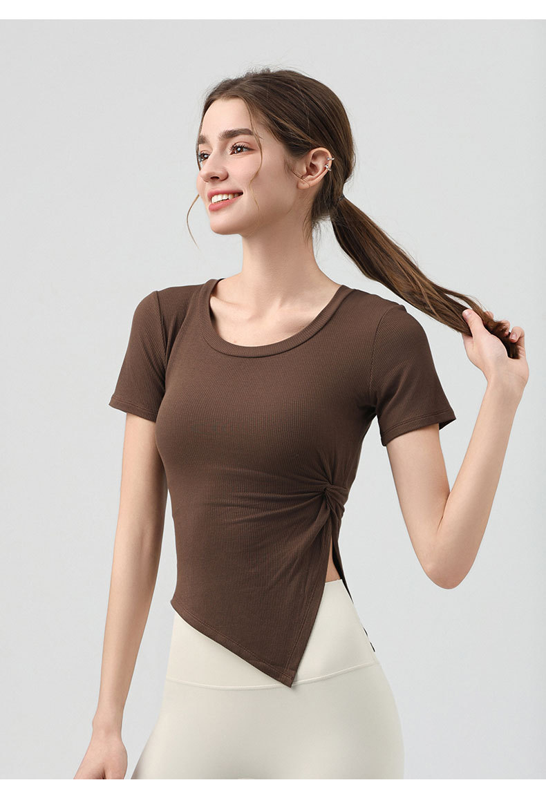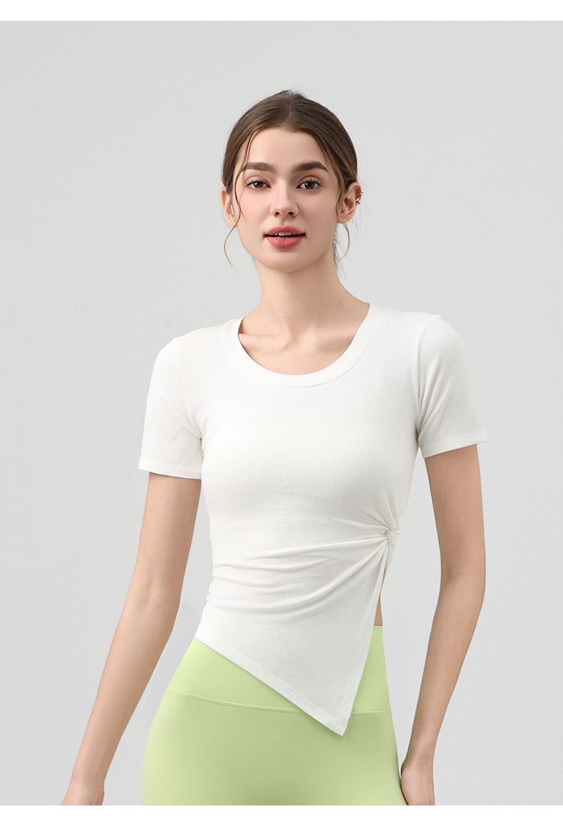 요가 의류 불규칙한 스포츠 반팔 티셔츠 여성용 사이드 스플릿 슬림 핏 슬리밍 피트니스 탑 러닝 트레이닝 블라우스