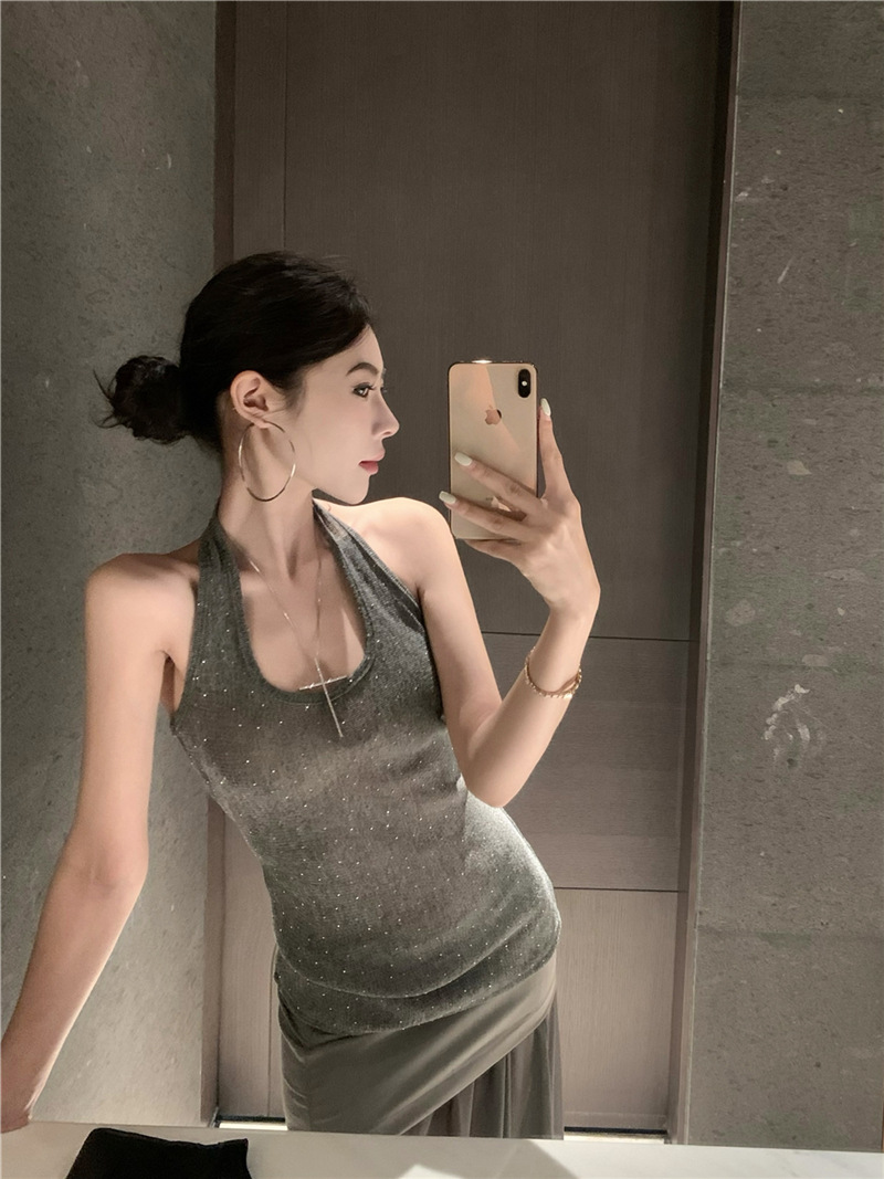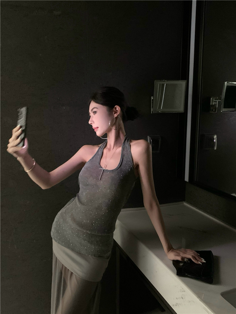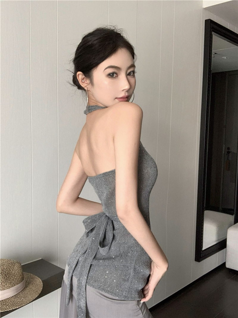 가을 여성복 세트, 고급스러운 백리스 끈 달린 홀터넥 탑, 메쉬 스커트, 롱 스커트 세트스토어 가기