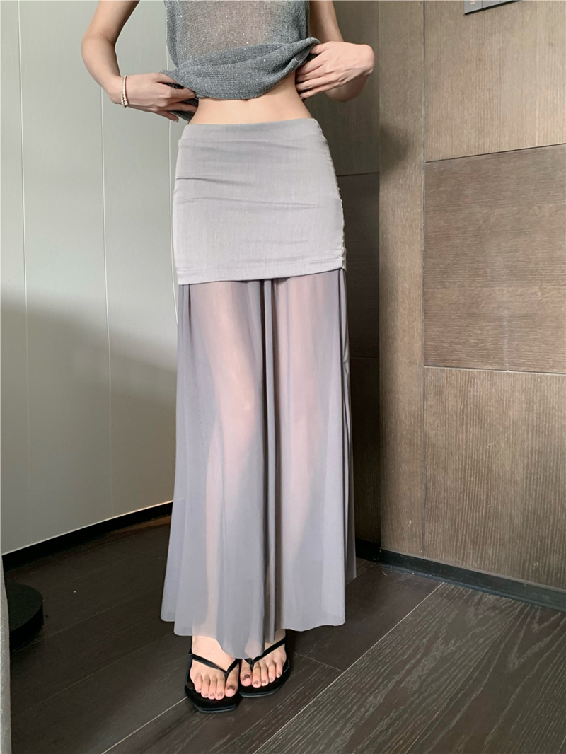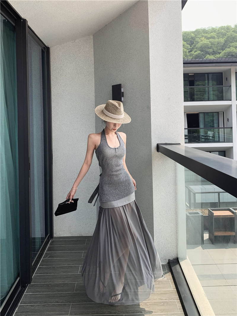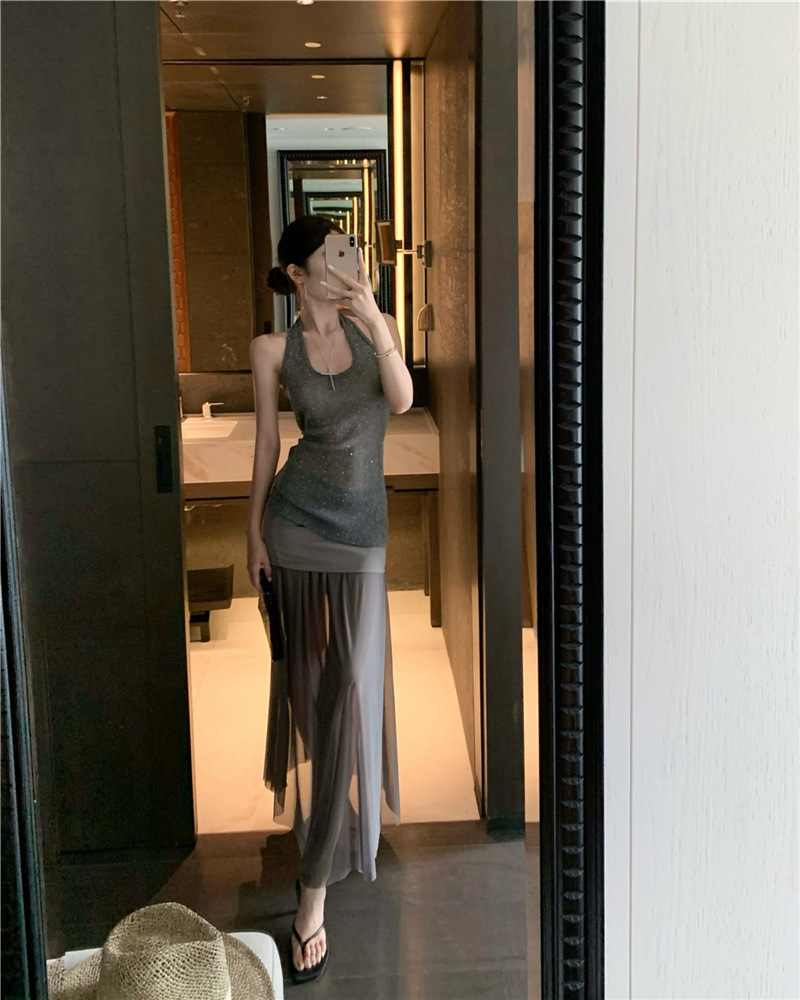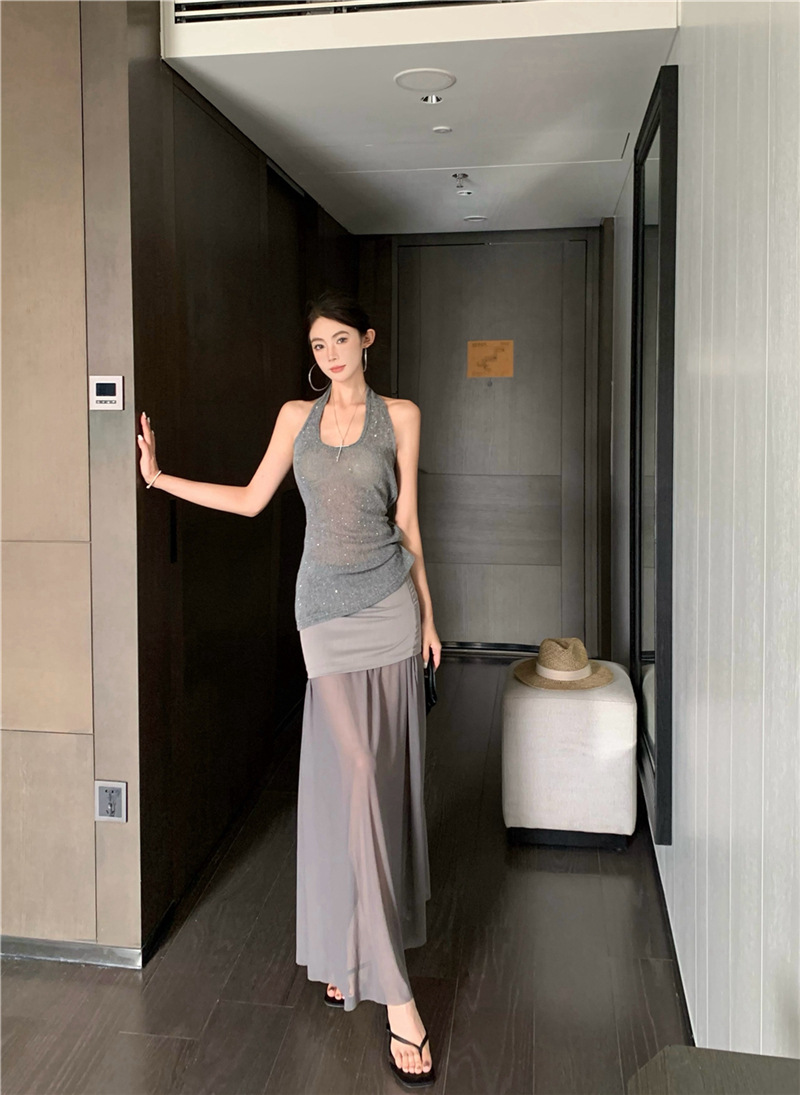 가을 여성복 세트, 고급스러운 백리스 끈 달린 홀터넥 탑, 메쉬 스커트, 롱 스커트 세트
