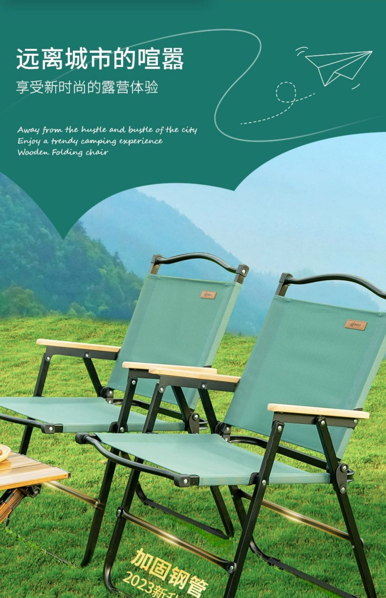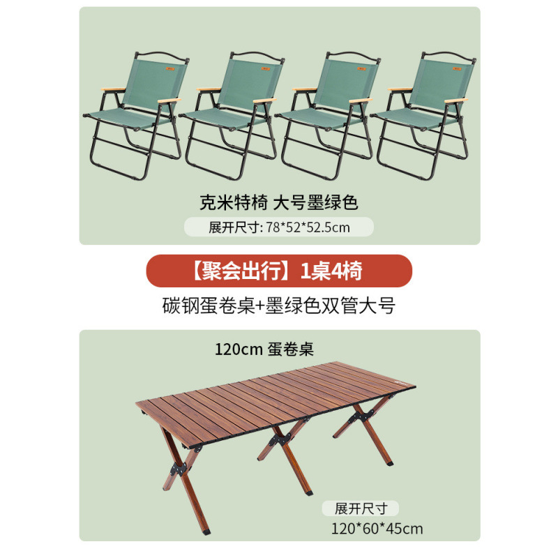 • [파티여행용 테이블 1개, 의자 4개] 나뭇결이 있는 탄소강 계란말이 테이블 120cm + 짙은 녹색 강화 이중관 대형 4개