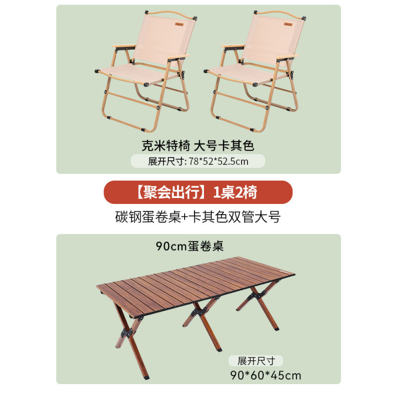 • [파티여행 테이블 1개, 의자 2개] 카본스틸 에그롤 테이블 우드그레인 90cm + 카키 강화 이중관 대형 2개