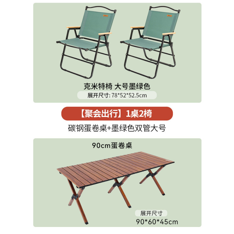• [파티여행 테이블 1개 의자 2개] 탄소강 계란말이 테이블 나뭇결 90cm + 짙은 녹색 강화 이중관 대형 2개