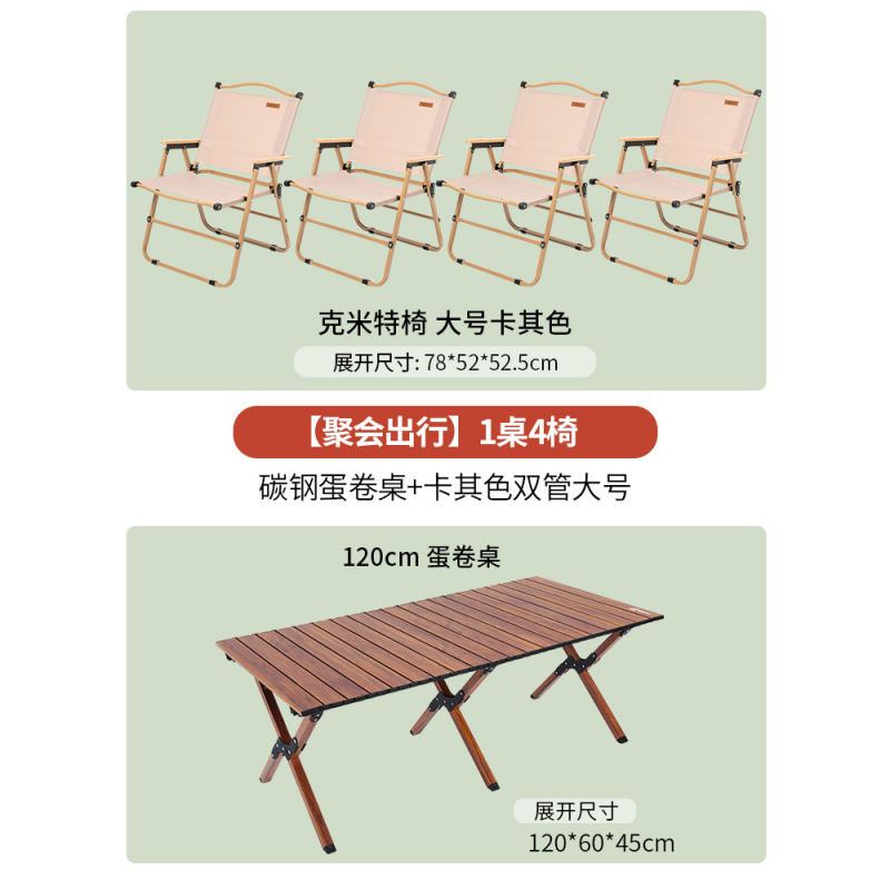 • [파티여행 테이블 1개, 의자 4개] 카본스틸 에그롤 테이블 나뭇결 120cm + 카키 강화 이중관 대형 4개