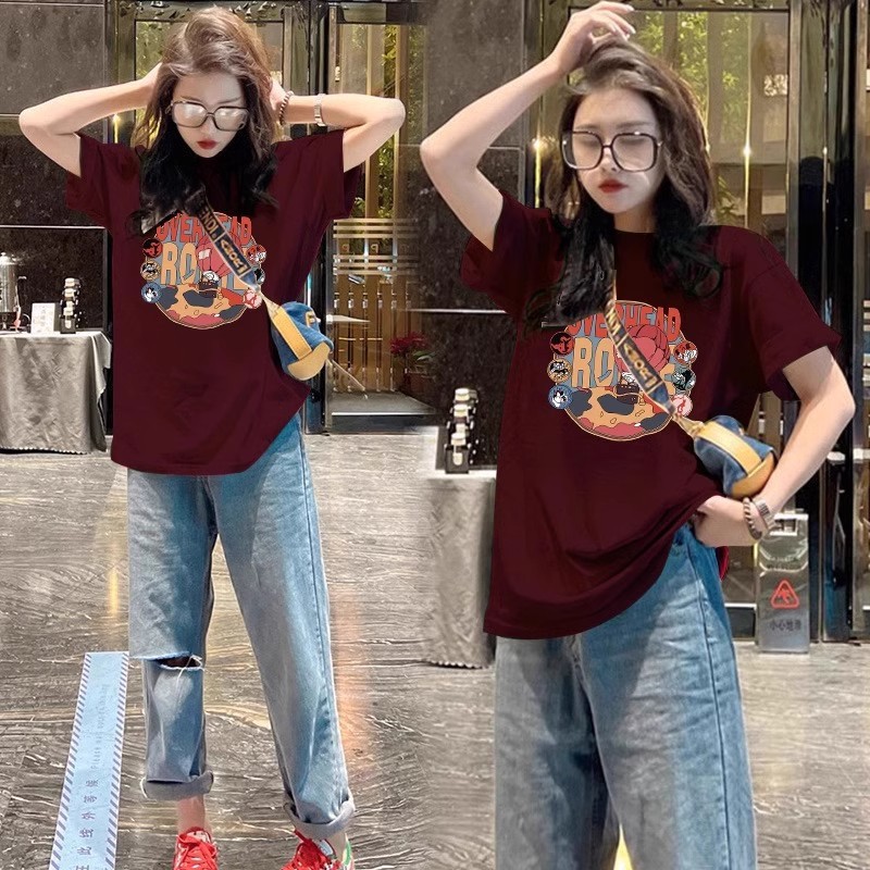 유럽 대형 에디션 어깨 반팔 티셔츠 여성 2025 년 봄과 여름 복고풍 순수한 면 느슨한 통통녀 100.00kg 배꼽스토어 가기