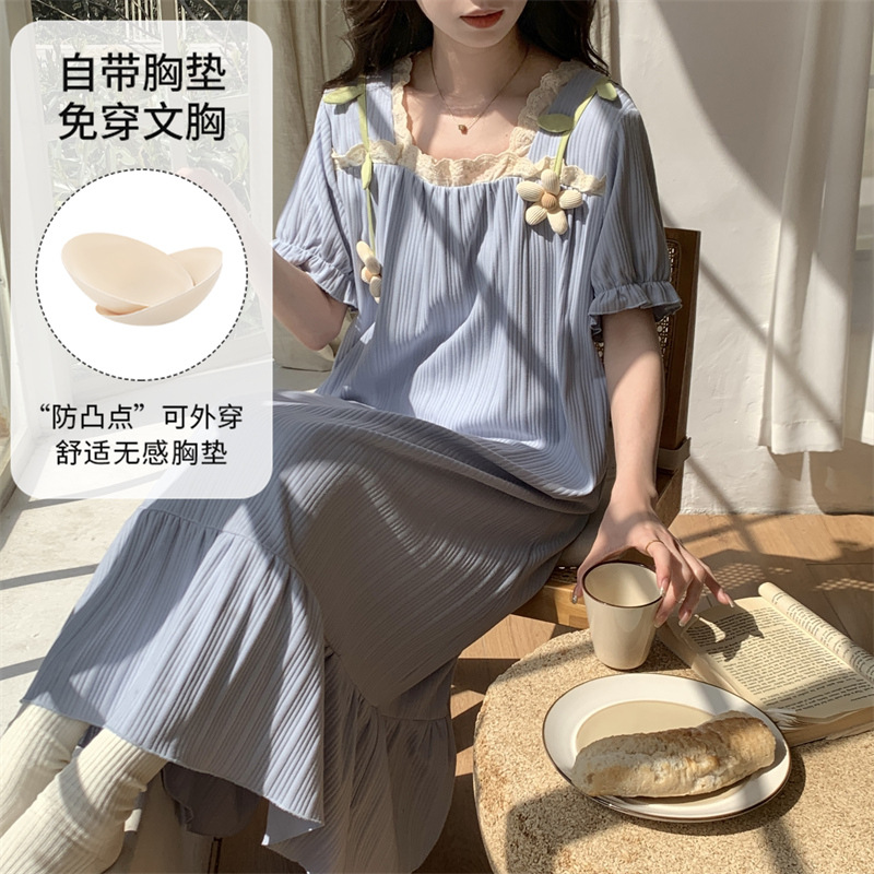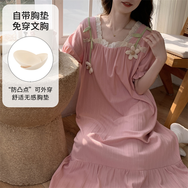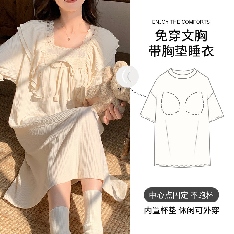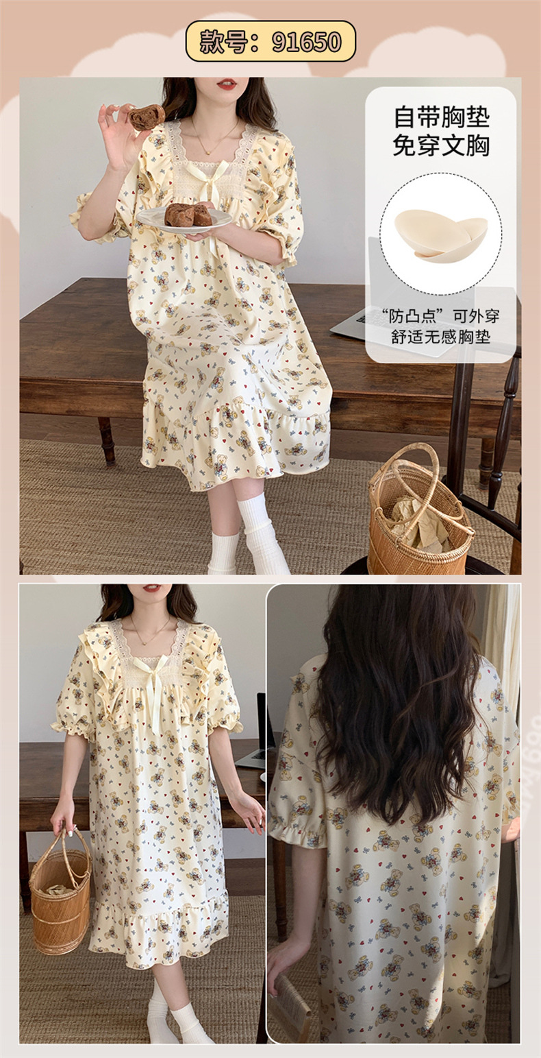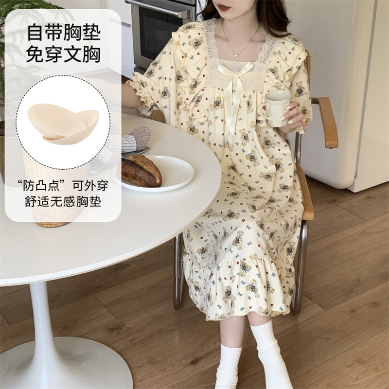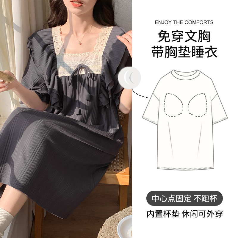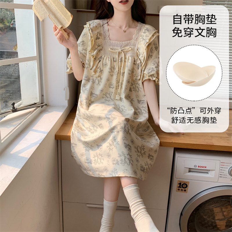 궁전 스타일 잠옷 여성 여름 반팔 모조 코튼 벨트 가슴 패드 나이트 드레스 중간 길이의 만화 캐주얼 플러스 사이즈 홈 옷스토어 가기